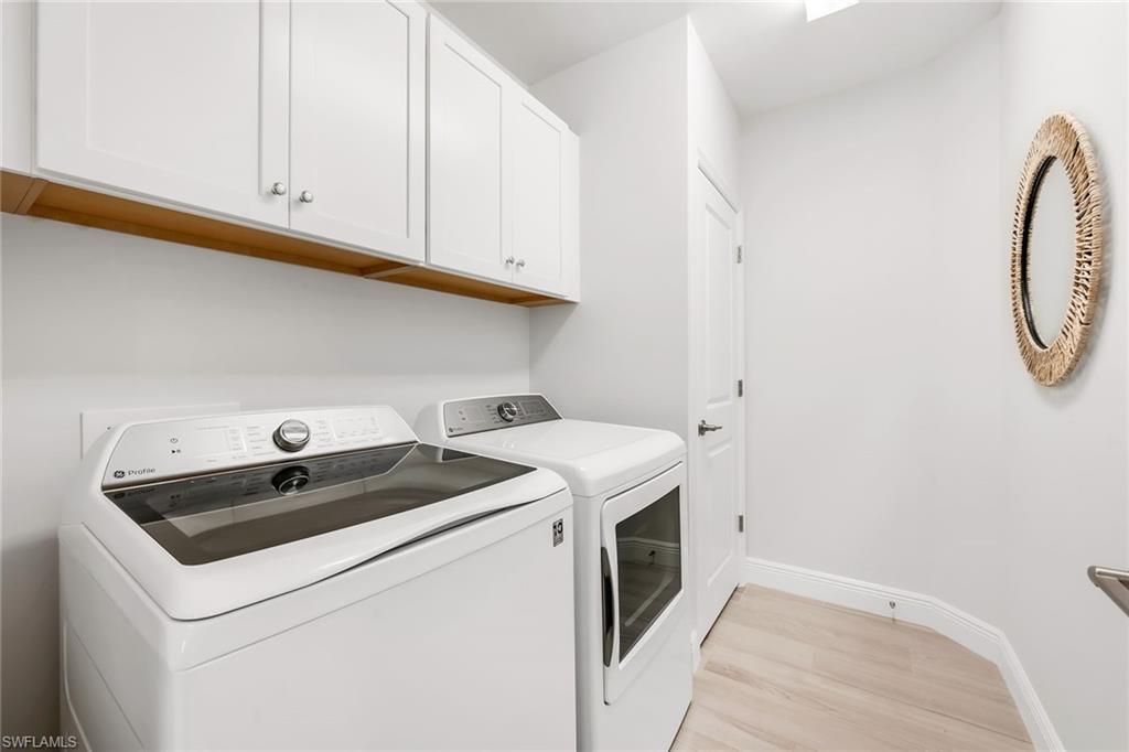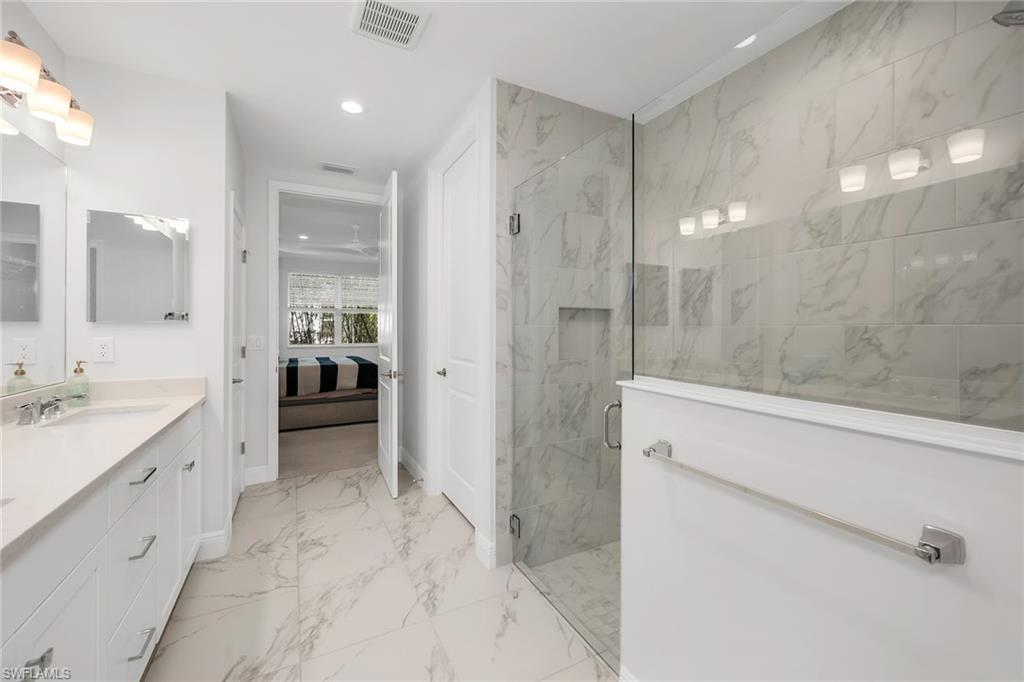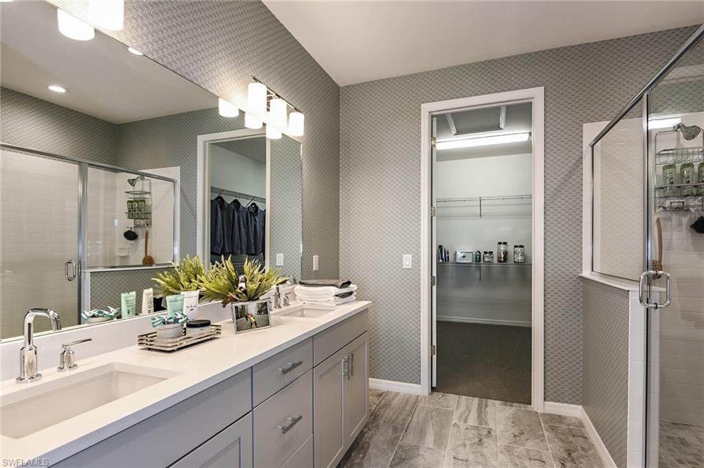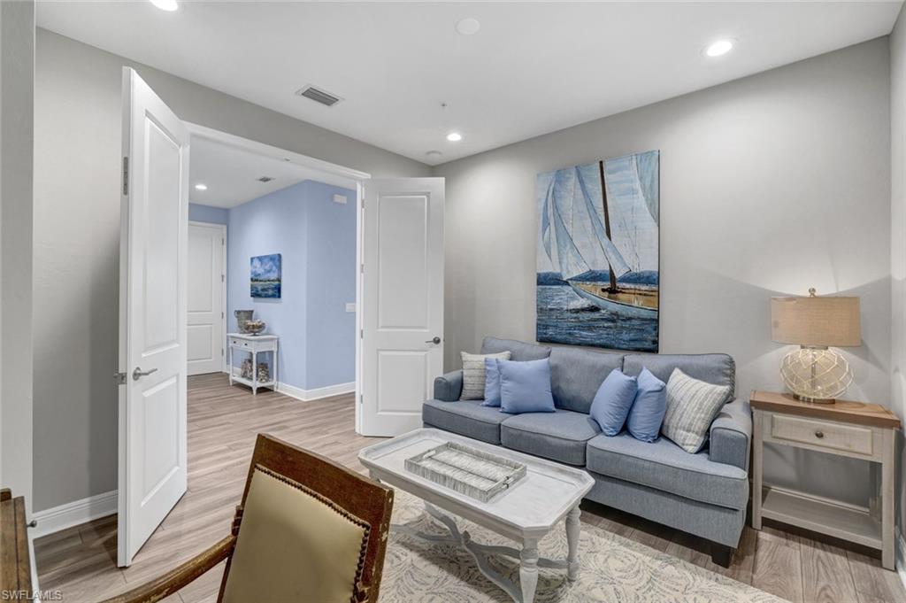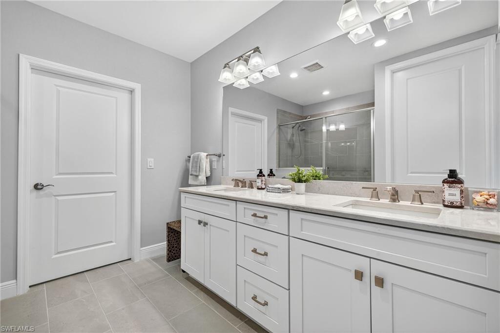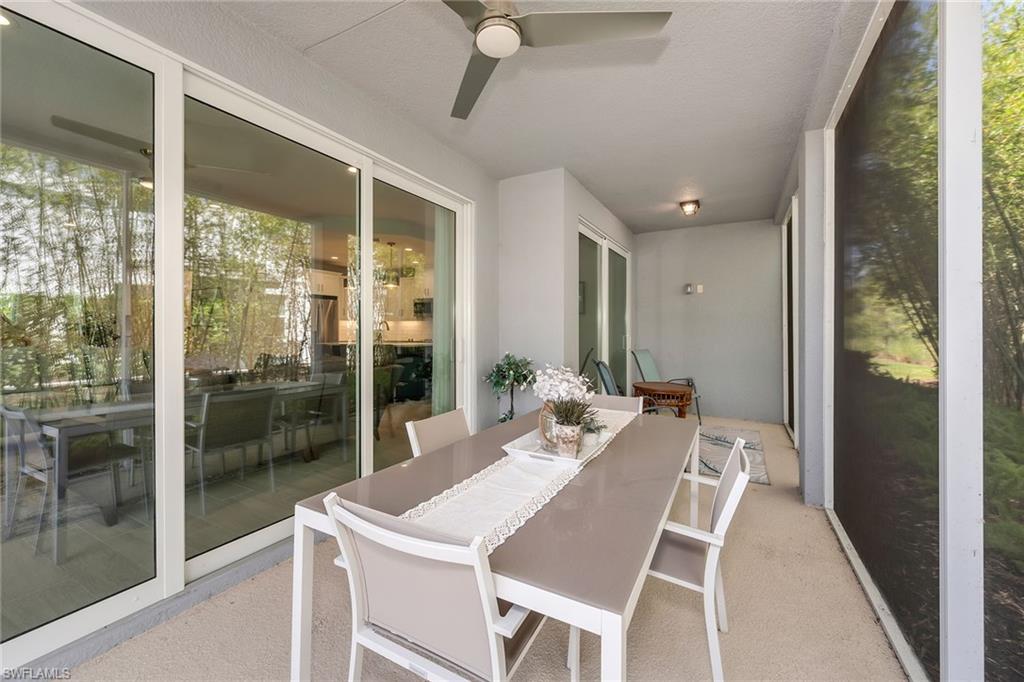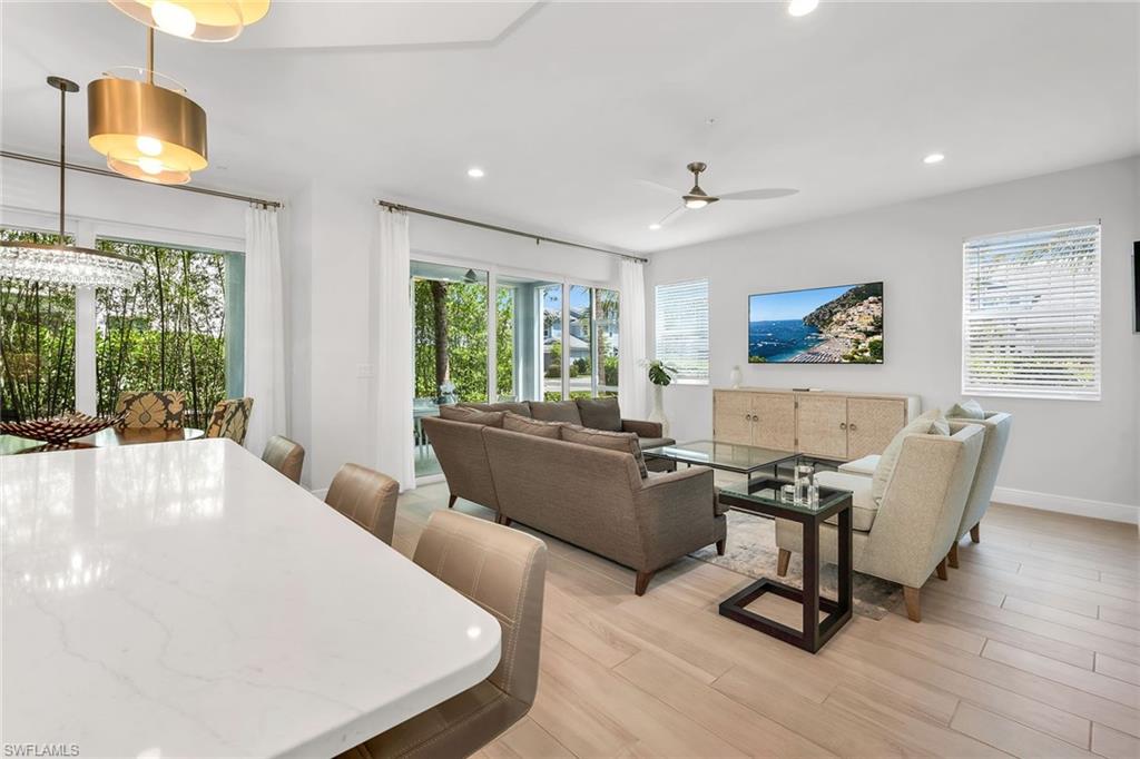 BUILT IN 2020, this beautifully upgraded 2 bedroom, 2 bath END UNIT home offers a peaceful and lush GREENSCAPE view. From the moment you step inside, you will appreciate the attention to detail, with high-end Pasha porcelain tile flooring, designer kitchen backsplash, and a chef’s dream kitchen featuring soft-close drawers, sleek satin nickel hardware, and upgraded GE stainless steel appliances. The center island with a single-bowl stainless sink and Moen faucet adds both style and functionality, while under-cabinet lighting and quartz countertops enhance the space. A large pantry and hall closet ensure ample storage. The dining area is elegantly appointed with a designer chandelier, and noiseless ceiling fans throughout. The spacious primary suite boasts a custom tray ceiling with crown molding, an 8x10 walk-in closet. The guest bedroom is equally inviting, featuring a gorgeous Murphy bed with decorative side cabinets for additional storage. Step outside to a spacious lanai where the unique offset position of the unit allows for an unobstructed and private landscape view. Impact sliding doors seamlessly blend indoor and outdoor living, while plantation shutters in the bedrooms and accordion blinds on the sliders offer both privacy and flexibility. A private entrance with an EXPANSIVE driveway on a cul-de-sac location complete this exceptional property. A must-see for those looking for style, comfort, and quality in a peaceful setting located minutes from downtown Naples!