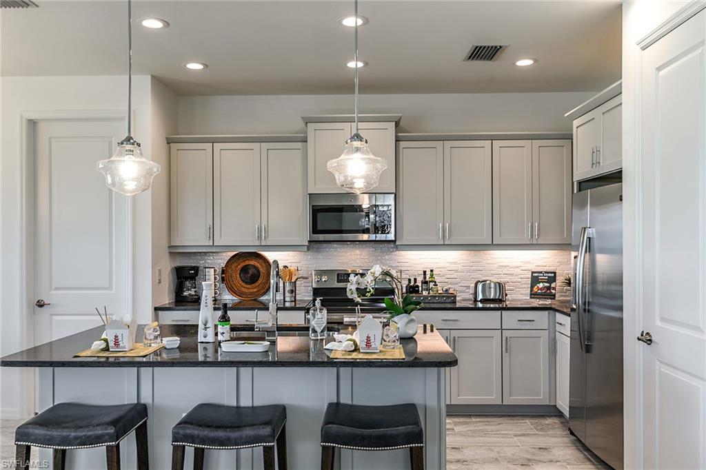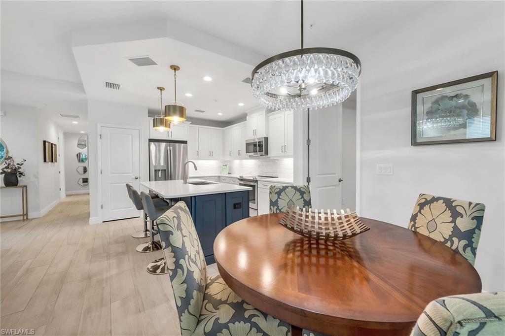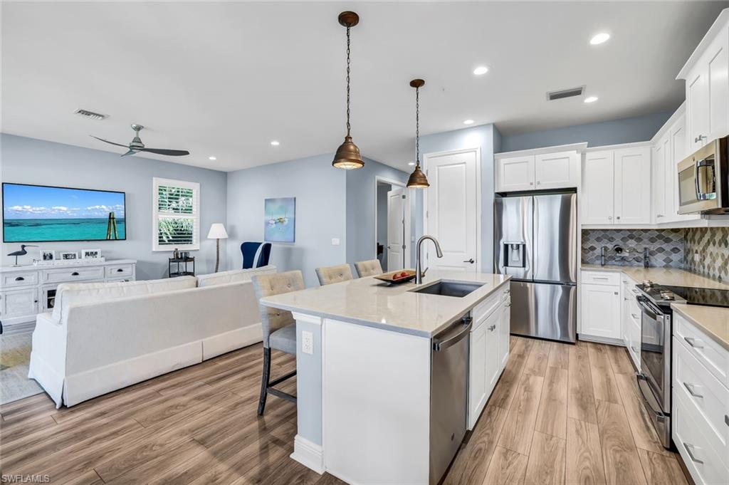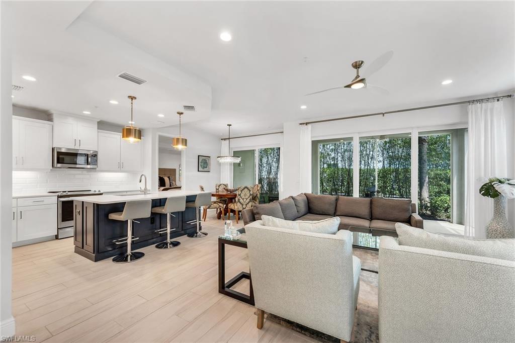 Are you seeking a move-in-ready residence that offers privacy, designer-curated interiors and effortless luxury? This fully furnished, first-floor Keswick end-unit carriage home, built in 2022, is the best priced property in Seychelles and showcases refined living with lush private garden views and southeastern exposure. Thoughtfully decorated by a professional interior designer, the residence is filled with modern finishes and timeless style, offering two bedrooms, two baths and impact-rated windows and doors throughout. Inside, the open floor plan features tile flooring in the main living areas, recessed lighting and an airy, sophisticated ambiance. The kitchen is a showpiece with white shaker-style cabinetry, under-cabinet lighting, quartz countertops, a tile backsplash and stainless steel appliances including a range, microwave and French-door refrigerator with ice maker. A large center island with a bar counter anchors the kitchen, seamlessly connecting to the adjacent dining area with a chandelier and spacious living room, both of which offer access to the landscaped lanai, a private retreat ideal for quiet mornings or alfresco entertaining. The primary suite features a tray ceiling and a beautifully designed en-suite bath with a dual-sink vanity, a frameless glass walk-in shower tiled floor-to-ceiling, and an oversized walk-in closet with built-in shelving in the bath for added convenience. The guest bedroom offers a large walk-in closet and is adjacent to a bath with a shower tub combo, providing comfort and privacy for visitors. Residents of Seychelles enjoy access to resort-style amenities, including a tropical pool, spa, state-of-the-art fitness center and a 4,500-square-foot clubhouse. Ideally minutes from Naples beaches, shopping and dining, this beautifully furnished home delivers comfort, sophistication and exceptional value in one of Southwest Florida’s desirable gated communities.