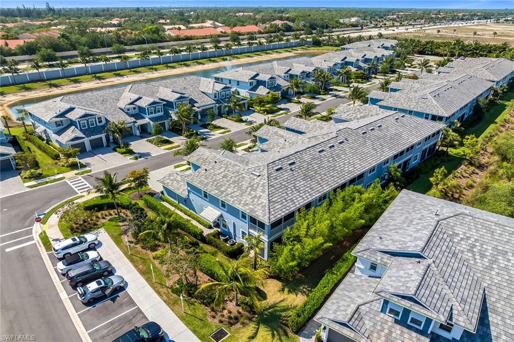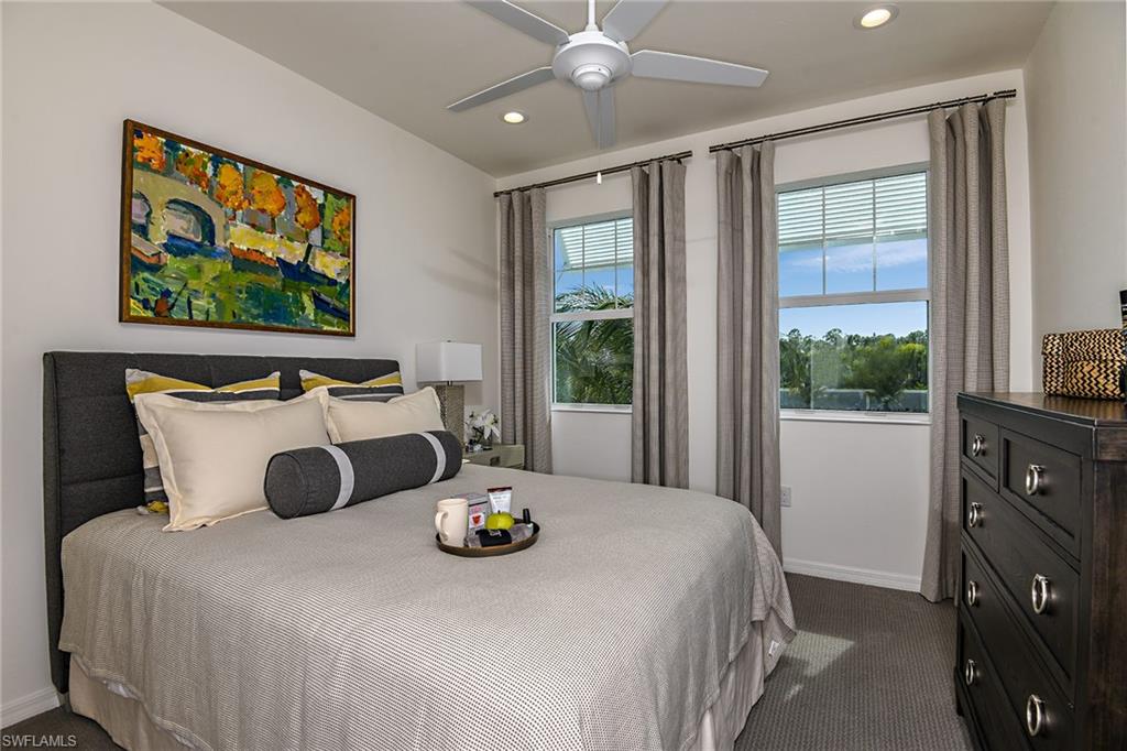 Lakeview and Western Exposure for Naples Sunsets! Seychelles built by Neal Communities with luxury British West Indies architecture. PARTIALLY FURNISHED! 2nd story carriage home located 5 minutes to downtown Naples/5th Avenue and the white sandy beaches of the Gulf. This light and airy open-concept Windemere floor plan unit is located in private cul-de-sac featuring 2 large bedrooms + Den (furnished) 2 full bathrooms and 1 car garage with long driveway for guests. Loaded with luxury upgrades, plantation shutters, including porcelain stone look flooring, chef's eat-in kitchen, dining room, white cabinets with soft close cabinetry, under mount lighting, designer backsplash, contemporary white quartz countertops, LG stainless refrigerator, appliances, and a center island. The spacious master bedroom and spa-like walk-in shower bath is elegantly appointed with double vanity, and has an oversized walk-in-closet, washer/dryer/laundry room. One of the most desirable features of this home is the lanai with TV overlooking the beautiful lakeview. Seychelles features amenities that included an oversized resort style heated pool and spa, fitness center featuring impact floors, Matrix equipment and free weights, fire pit, outdoor gas grill and clubhouse for social gatherings! Convenient location to downtown Naples, I-75 and airports.