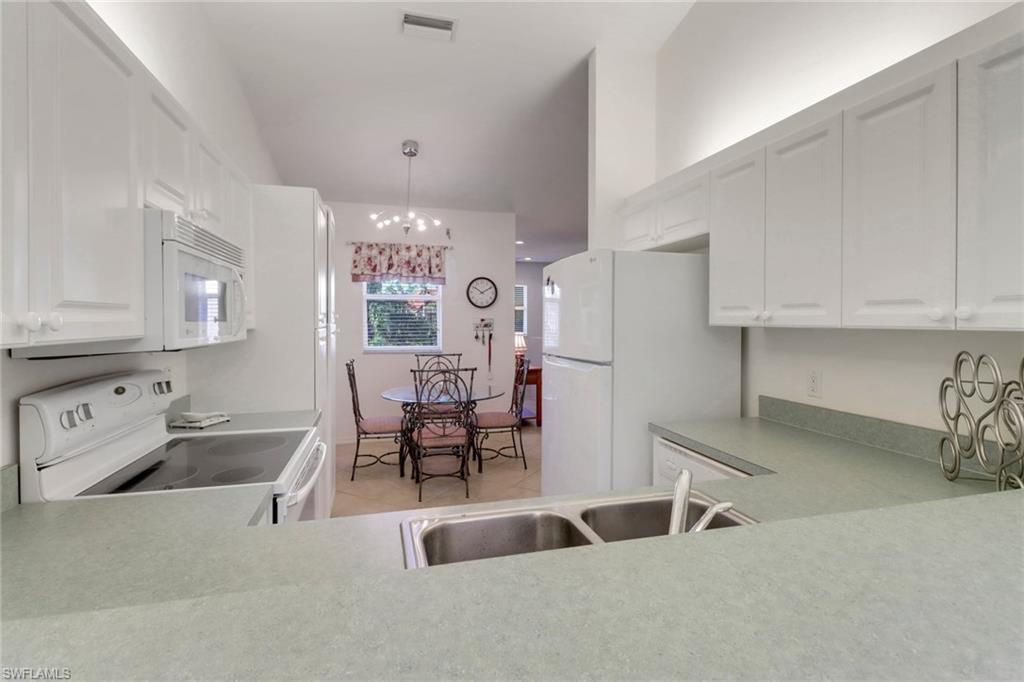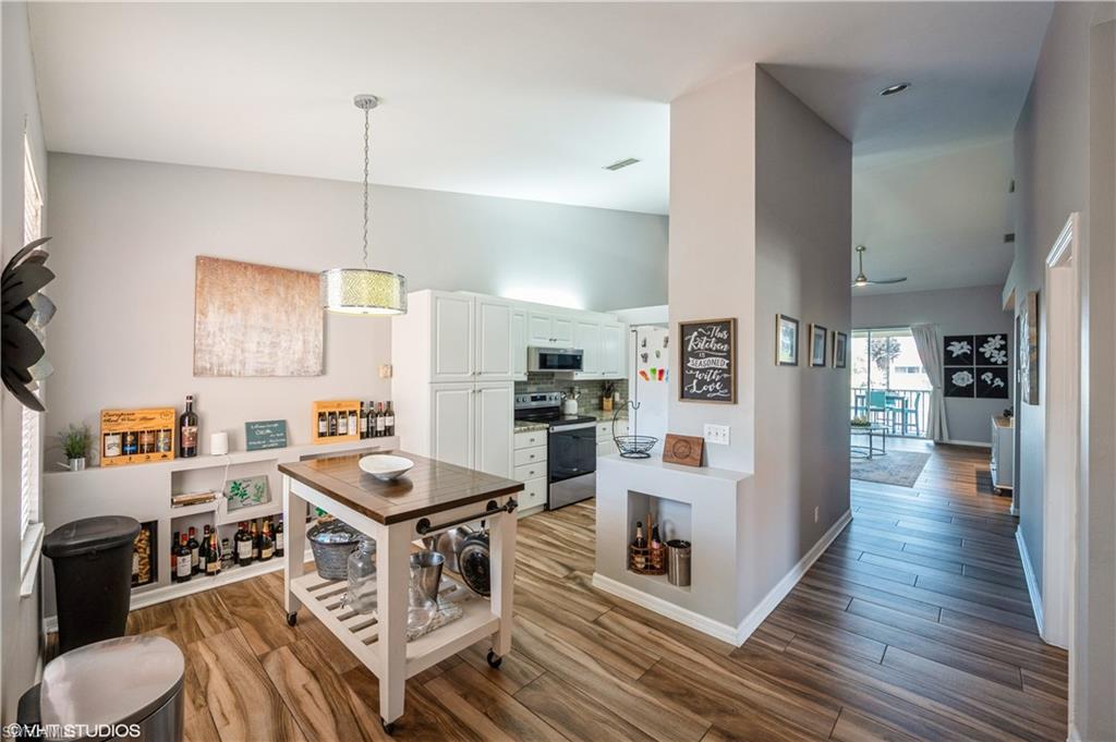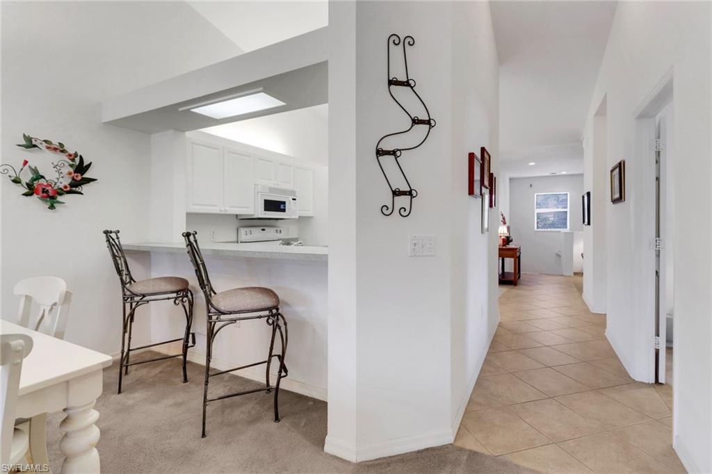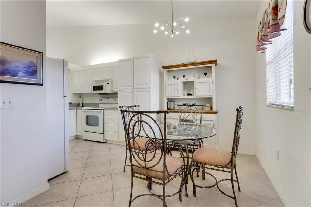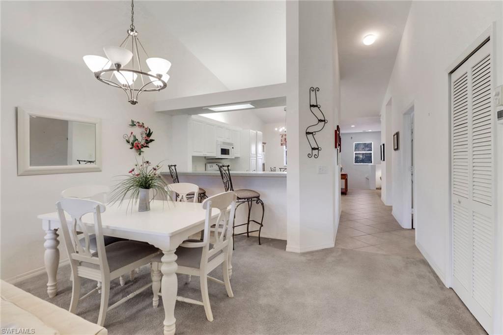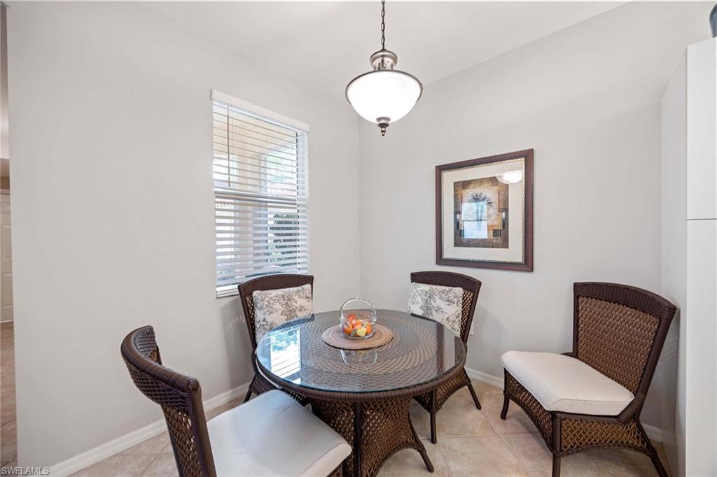 Over the top condition. Loaded with all the goodies. This unique home is like new condition . No carpet . Wood look tile flooring throughout over 20K for the flooring alone. New bathrooms. Look at the kitchen you will love it If you like entertaining you will enjoy the dining room off the kitchen which will allow dining for a few or 10 or more. Volume ceilings. Spectacular water views from most rooms. Attached garage. Dramatic foyer entry. Tennis, community pool, club house. Great location in the heart of Naples . No CDD. This is a must to see. could be a 3 bedroom. Bedroom converted to dining room