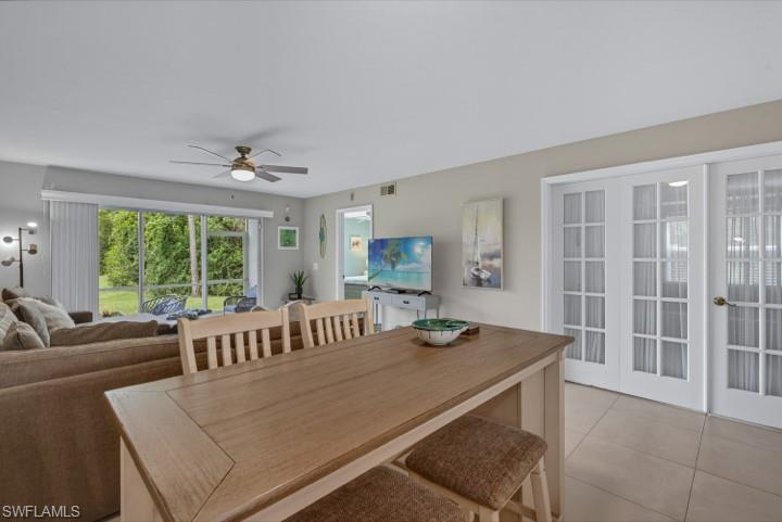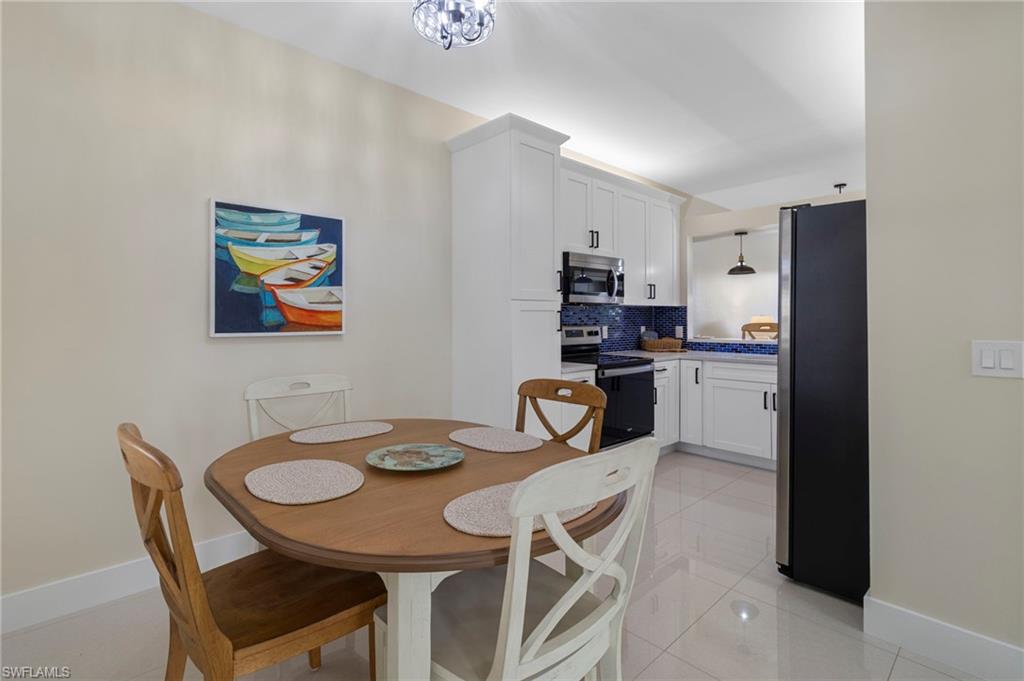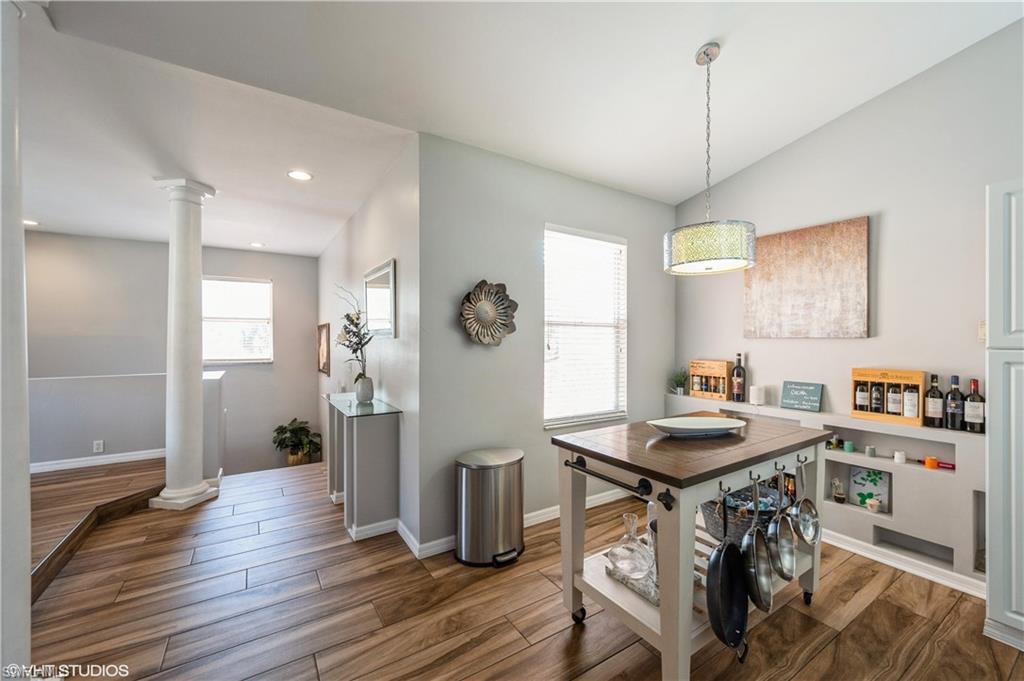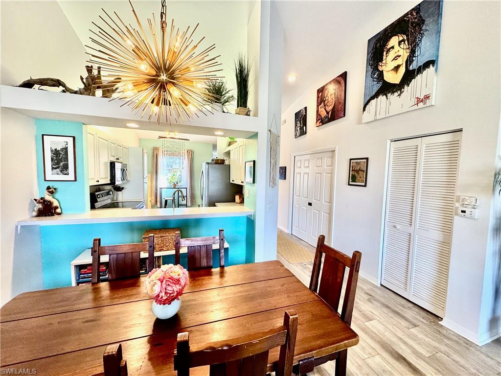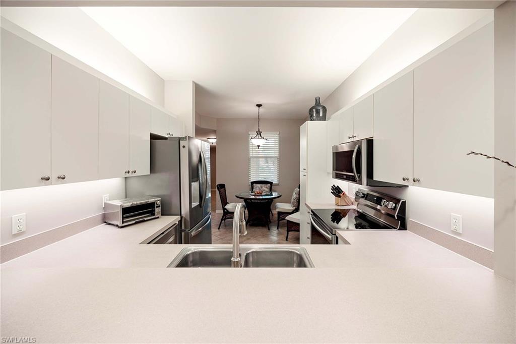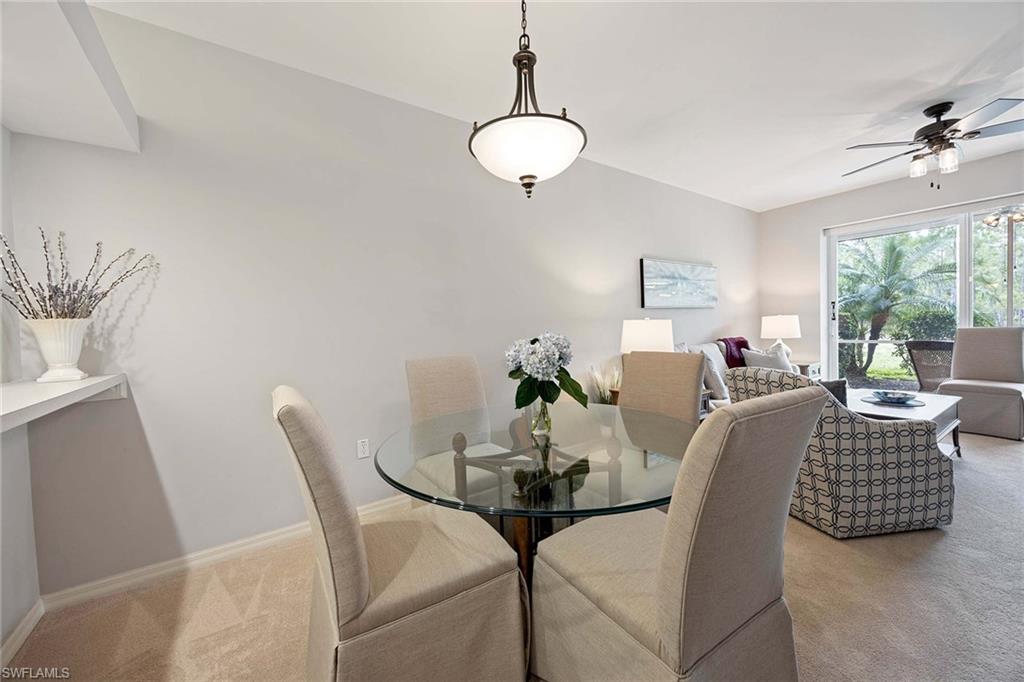 Over the top condition. Loaded with all the goodies. This unique home is like new condition . No carpet . Wood look tile flooring throughout over 20K for the flooring alone. New bathrooms. Look at the kitchen you will love it If you like entertaining you will enjoy the dining room off the kitchen which will allow dining for a few or 10 or more. Volume ceilings. Spectacular water views from most rooms. Attached garage. Dramatic foyer entry. Tennis, community pool, club house. Great location in the heart of Naples . No CDD. This is a must to see. could be a 3 bedroom. Bedroom converted to dining room