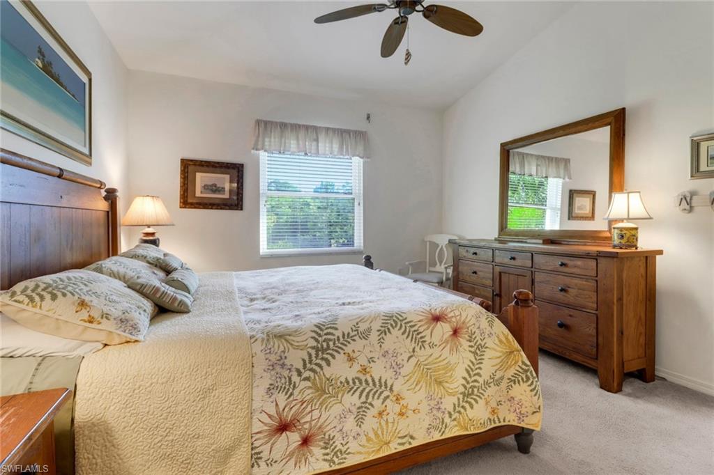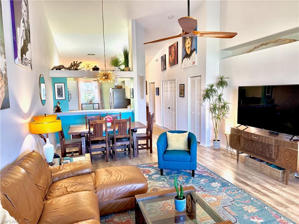 Move-In Ready Florida Retreat! Welcome to your perfect year-round home or sunny getaway! This beautifully maintained second-floor condo features vaulted ceilings, creating a bright and airy living space that feels open and inviting. Nestled in a quiet, charming community just minutes from the Gulf beaches, shopping, and the renowned dining of Southwest Florida, this home offers both comfort and convenience. Enjoy peaceful landscaped views from your private patio, or take a dip in one of two community pools—one just steps from your front door. Additional features include a one-car attached garage, hurricane shutters throughout, and a newer HVAC system for peace of mind. The community also offers pickleball and tennis courts, making it easy to stay active and social. This is a must-see for anyone ready to embrace the Florida lifestyle of sunshine, relaxation, and Gulf breezes!