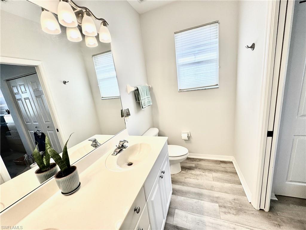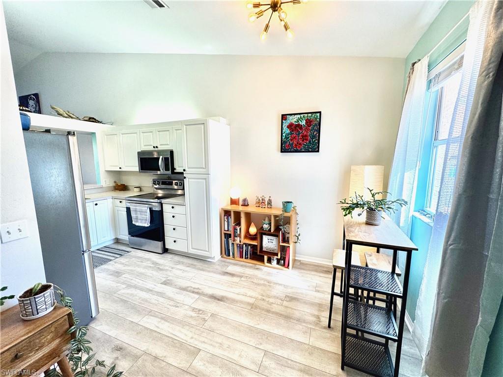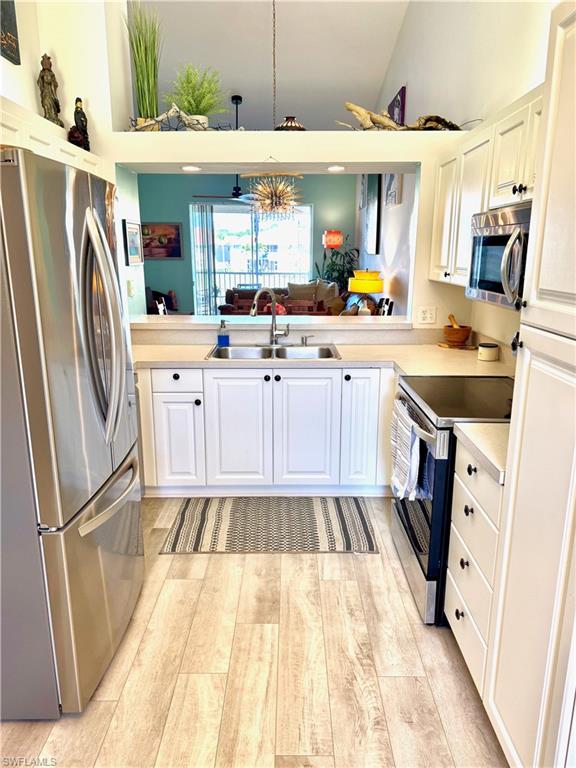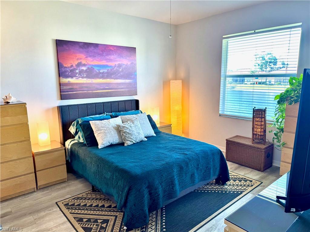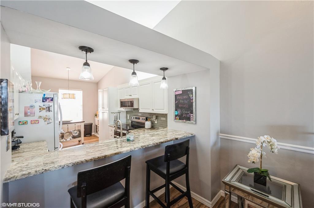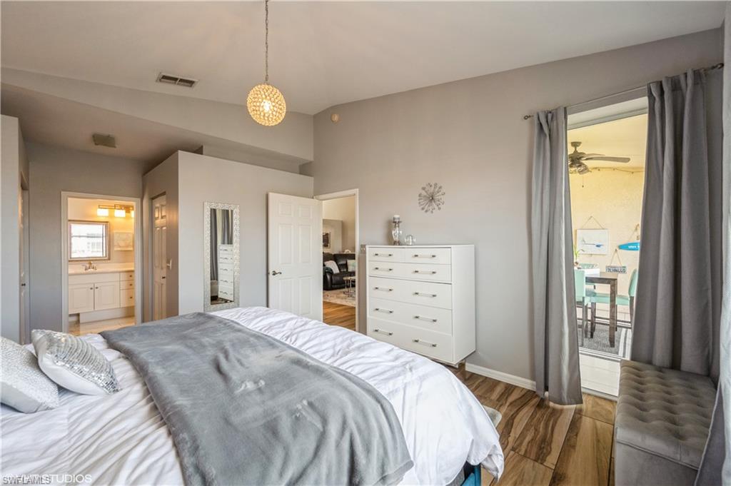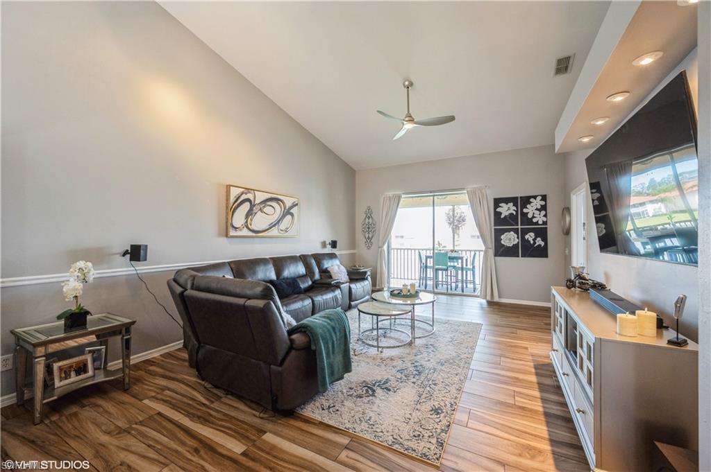 A must see nestled in a quiet neighborhood with 2 community pools, pickleball courts, and tennis courts as well. This second floor bright and airy condo with vaulted ceilings boasts vinyl plank flooring throughout the living area, and stainless steel appliances. Enjoy relaxing on the patio with serene views of the lake. This condo also has an attached 1 car garage, and enough room for two additional parking options in the driveway. Included with the dues is cable, internet, and water. Located close to I-75 for quick access to the airport, and also minutes from downtown shopping and dining, and beautiful Gulf beaches! Very motivated seller!