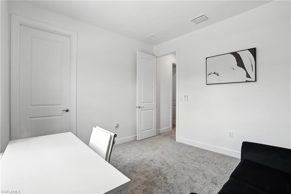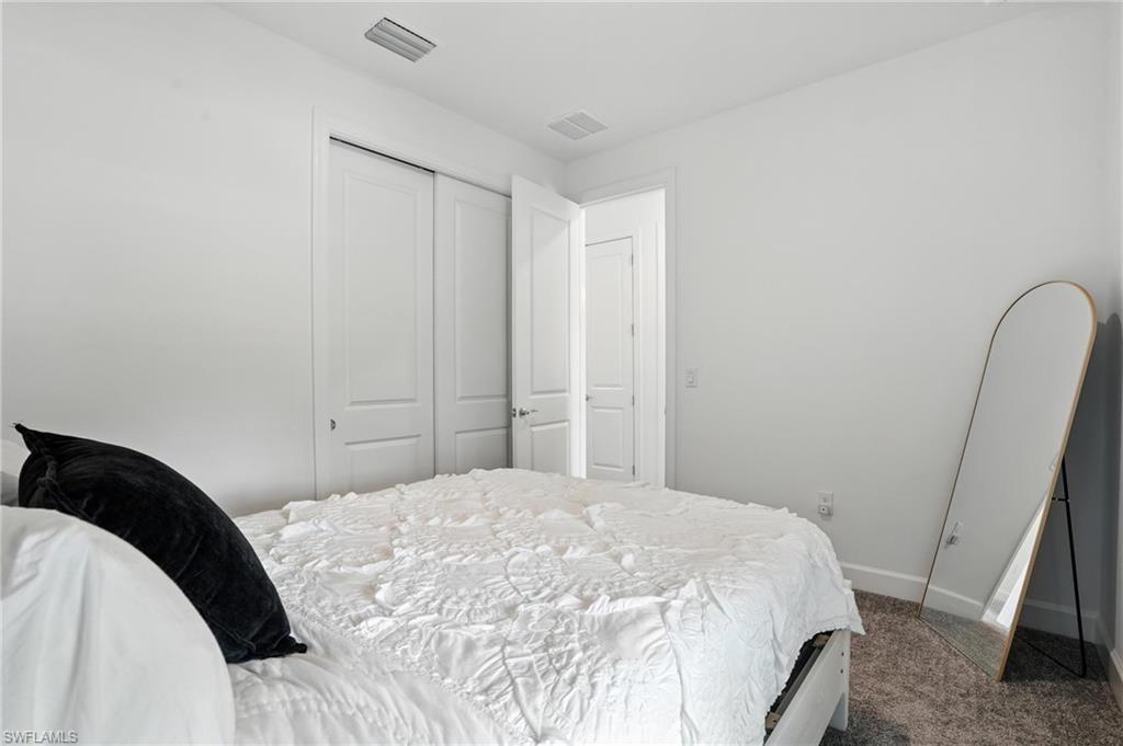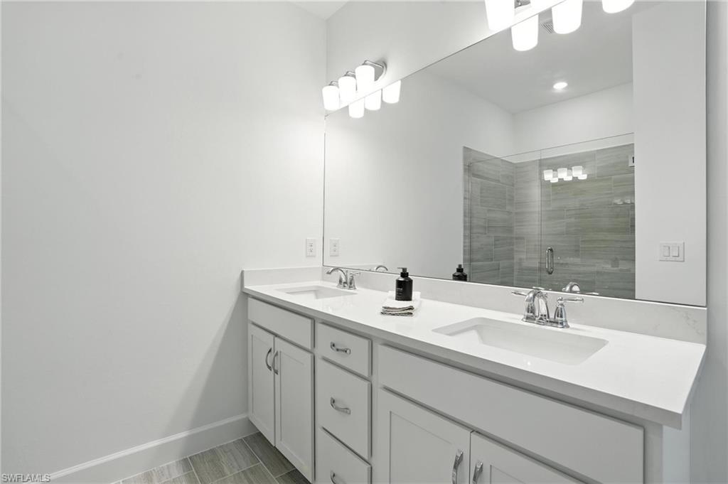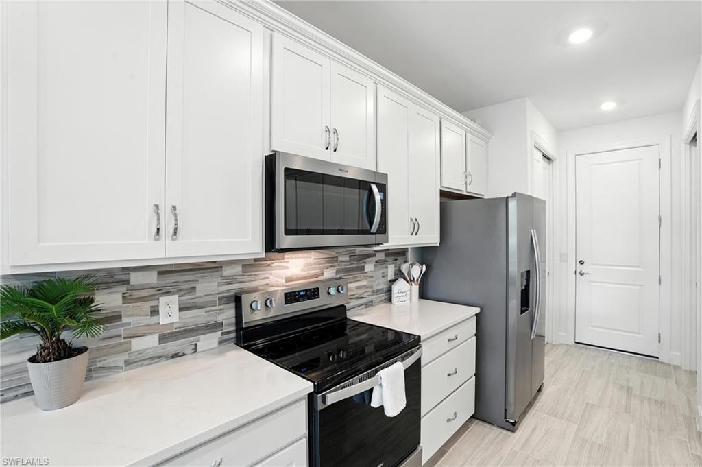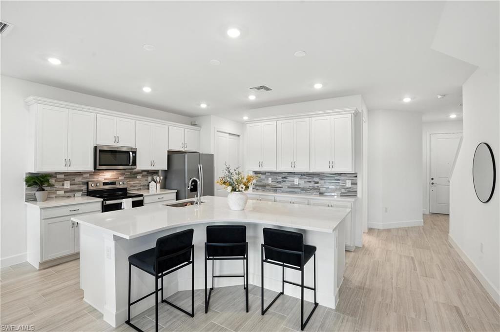Located directly within the gates to this North Naples community, this corner-end unit home is located perfectly. It's only a short walk to the community pool, cabanas, and mail boxes. This home offers a spacious open floor plan, with a large eat-in kitchen. The kitchen is equipped with stainless steel Whirlpool appliances, white cabinetry, and a stunning quartz countertop. The cabinetry provides a ton of storage, along with a full pantry closet. Upstairs, the master bedroom provides two large walk in closets, an on-suite, double vanity, walk in shower, and a private toilet. Two additional bedrooms allow for more even more space, and an additional walk in closet. There is also a laundry space, equipped with a countertop and sink. This community is located close to many great restaurants and beaches!