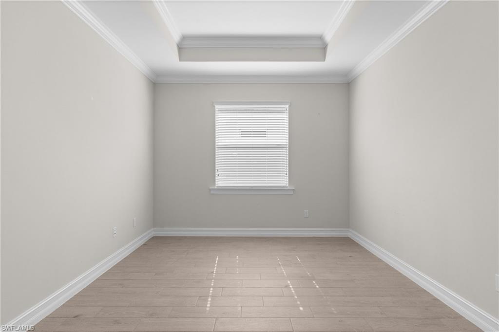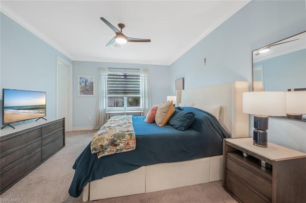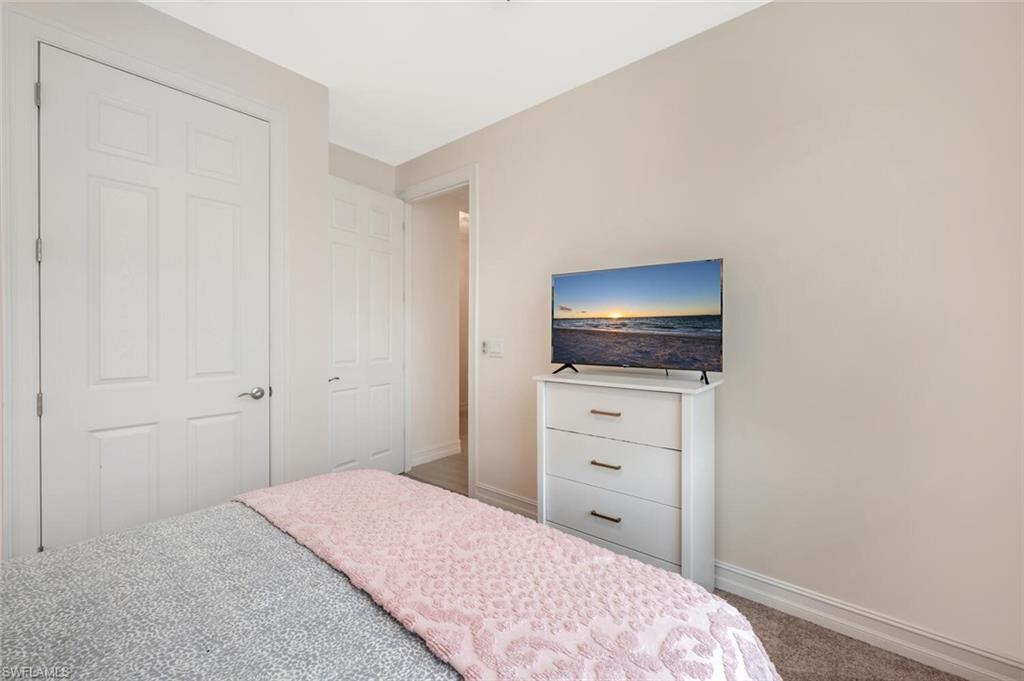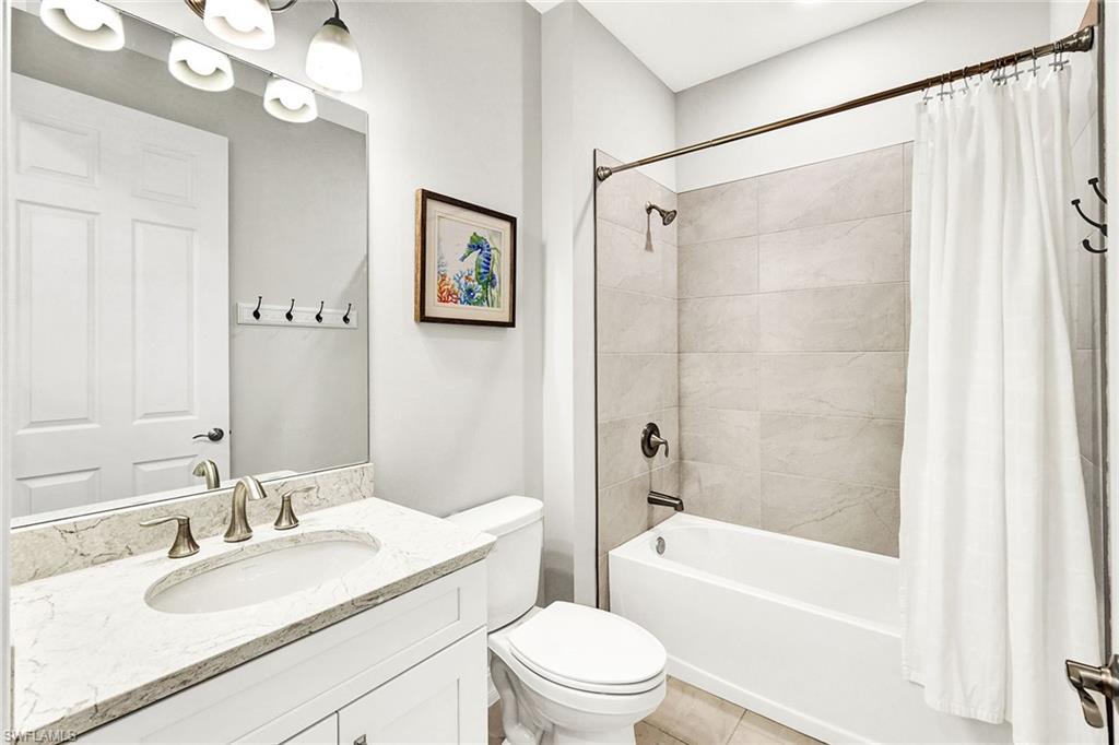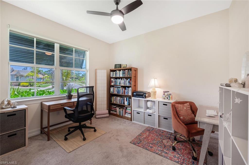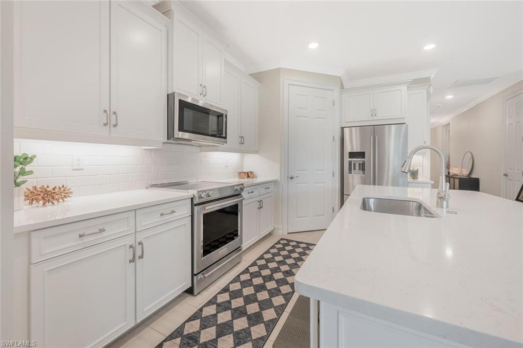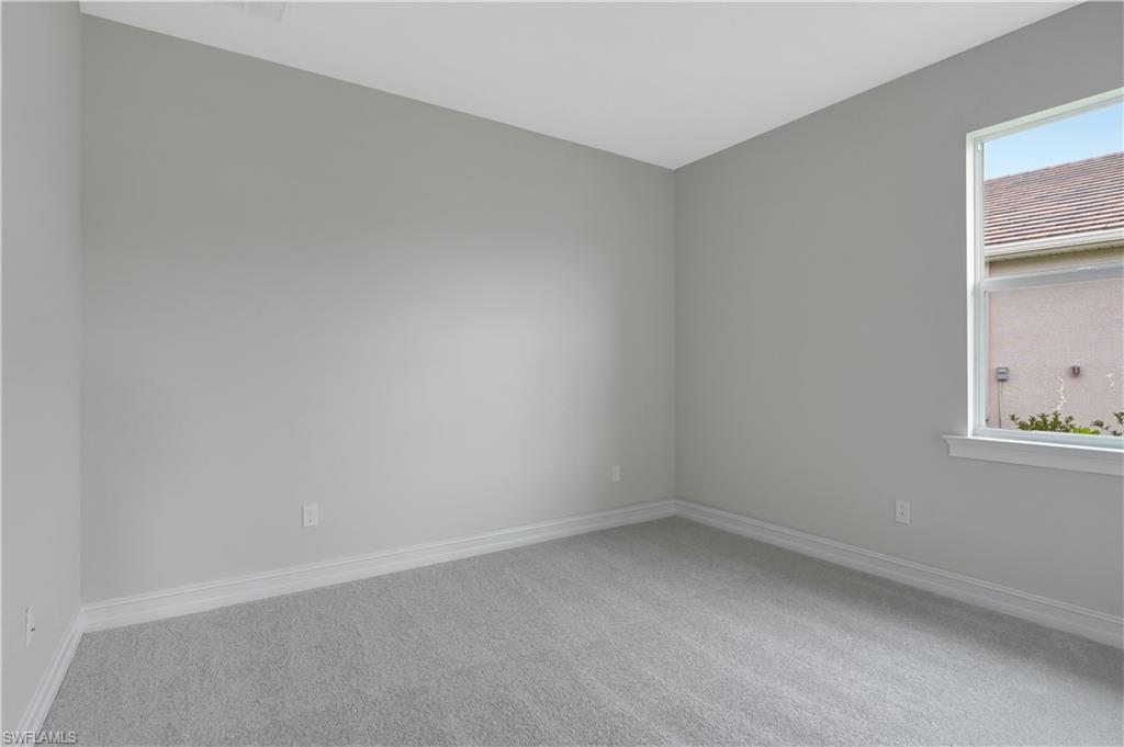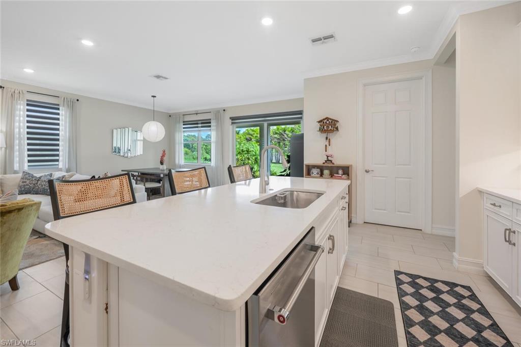 Newer construction 2023! This beautifully designed Shelby model features 3 bedrooms, a private den, and 2.2 baths(Outdoor Pool Bath), plus a spacious foyer and wide hallway for a bright, open feel. The well-planned layout offers the primary suite split from the secondary bedrooms, ideal for privacy. Set on a south-facing private lot in a premier South Naples location and Flood Zone X, this home is a standout choice for those who love the peace of mind, efficiency, and fresh finishes that new construction delivers. The open-concept design highlights high ceilings, crown molding, tray ceilings in both the living area and primary bedroom, and durable gray wood-look tile flooring throughout. The chef’s kitchen features a large quartz island with seating, Whirlpool stainless steel appliances, soft-close cabinetry with crown molding, a walk-in pantry, and designer pendant lighting—creating the perfect space for entertaining or relaxing at home. The expansive primary suite offers dual vanities with quartz countertops, a soaking tub, large walk-in shower with a bench, and a private water closet. The laundry room includes front-loading washer and dryer, upper cabinetry, and a utility sink. Additional highlights include impact windows, recessed lighting, a smart home system with Qolsys IQ panel, and an oversized 32.6’ deep garage—perfect for a golf cart, toys, or extra storage. Located in a smaller, well-maintained community of just 251 homes, this neighborhood offers a rare combination: resort-style amenities with low quarterly HOA fees. Enjoy a clubhouse, resort pool, pickleball, bocce, and game room—all included in a fee of just \$903/quarter, which also covers irrigation and lawn care. Additionally, flexible leasing allows for up to three rentals per year, each with a 30-day minimum. This home is conveniently located approximately 9 miles from 5th Avenue, 13 miles from Marco Island, and 5 miles from I-75, providing fast access to Naples' best beaches, dining, shopping, and medical services. Move-in ready, thoughtfully designed, and located in one of South Naples’ most accessible communities—don’t miss this exceptional opportunity.