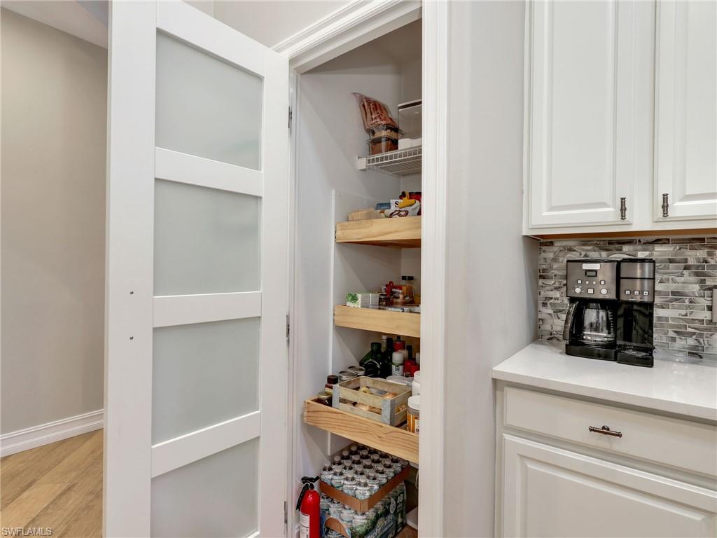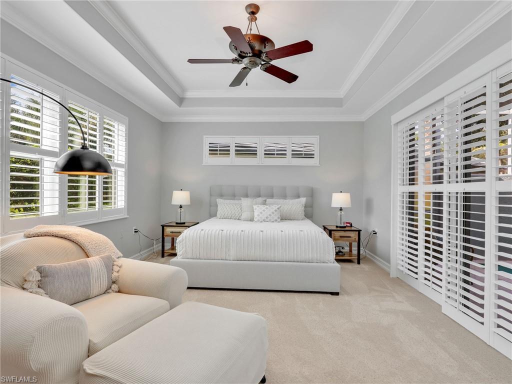 This stunning attached villa in Tarpon Bay offers a picture-perfect and peaceful paradise in prestigious North Naples. The property has been meticulously updated over the past few years, with no detail overlooked. The interior boasts neutral paint throughout, a chef's kitchen with gas cooking, newer appliances, popular white all-wood cabinets, quartz countertops, and a custom pantry door with slide-out shelving for convenience. High-end LVP flooring flows beautifully through the main living areas. The Plantation shutters offer wonderful privacy while highlighting the vast amount of windows throughout the home. Walking through the entry opens up to the spacious kitchen and the grand family room that features soaring ceilings and overlooks the sparkling blue pool. The primary bedroom and bath exemplify pure luxury. The primary bedroom is uniquely situated, surrounded by the deep blue lake on one side and the magnificent salt water pool on the other. The master bath is a bright and light oasis with a walk-in shower and neutral tones of whites, grays, and beiges, offering complete comfort. The primary bedroom closets feature custom cabinetry for maximum space and organization. The second and third bedrooms provide privacy and flexibility, ideal for a home office or accommodating family and friends. The second bathroom has also been redone in a chic combination of white with black accents, complementing any decor. Structural exterior updates include a new roof, exterior paint, hurricane-grade windows, and a whole-home generator for complete peace of mind. Additionally, the pool received a new surface and limestone decking in 2019. The garage has been re-imagined with custom coated flooring, extensive overhead shelving, and is fully air-conditioned.