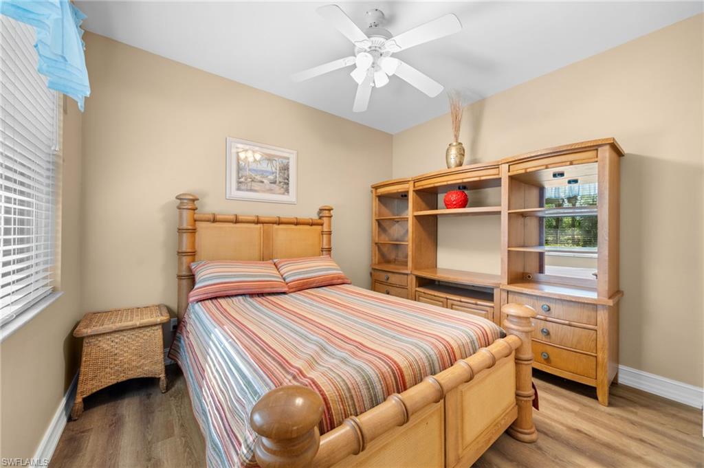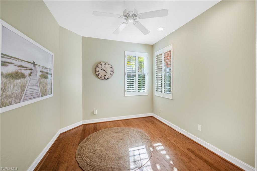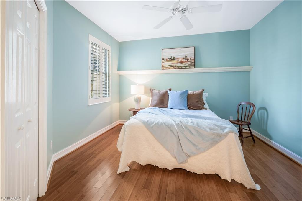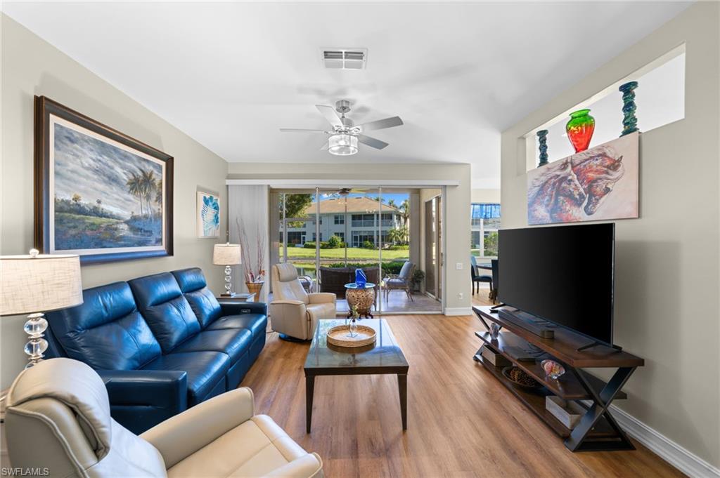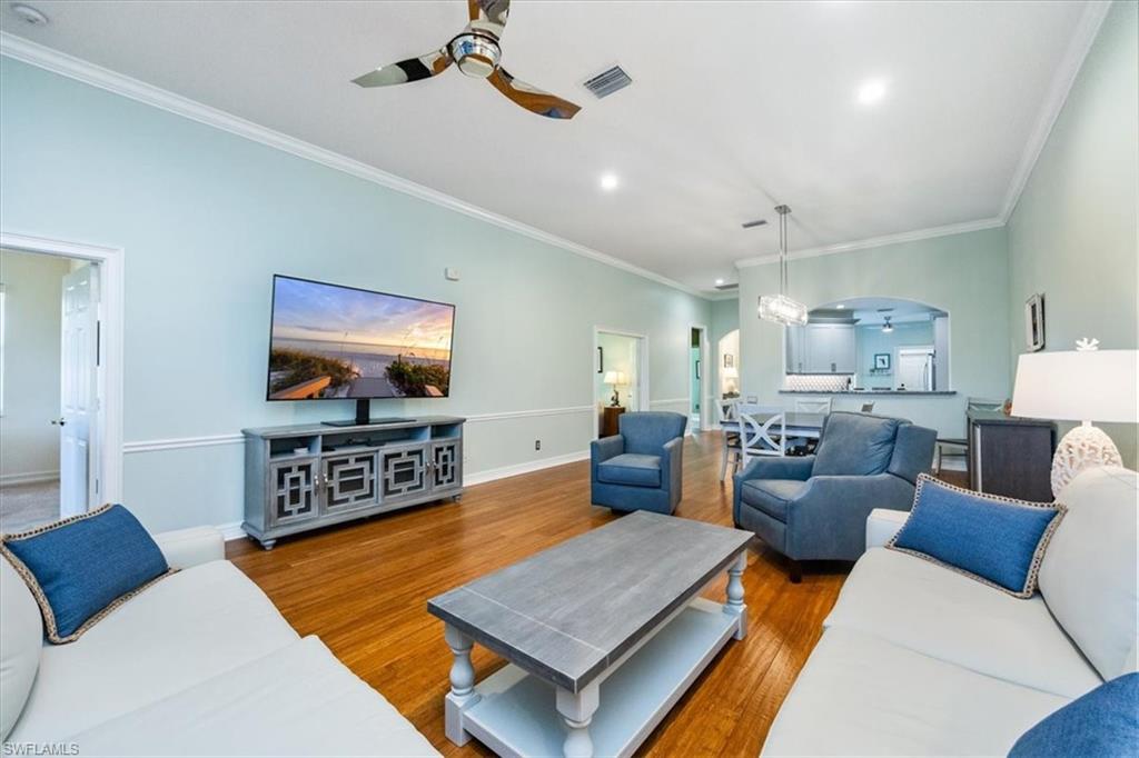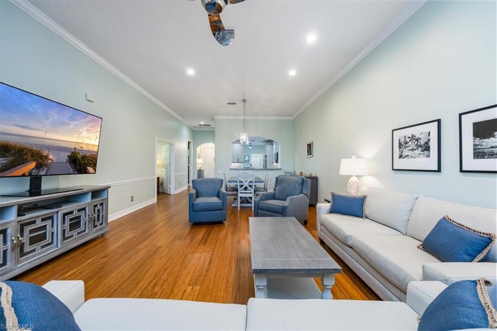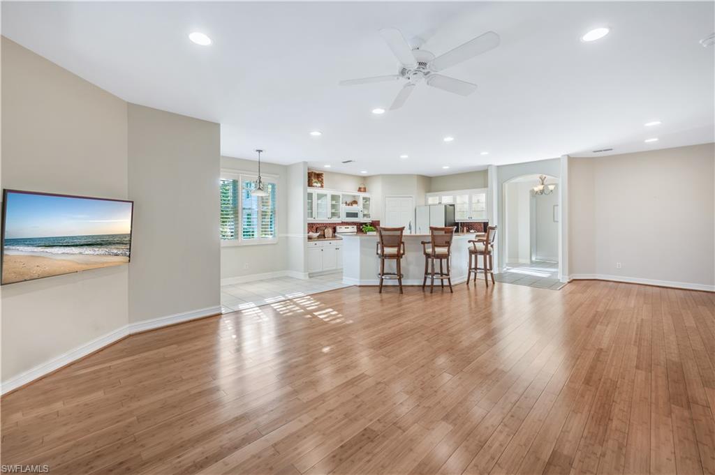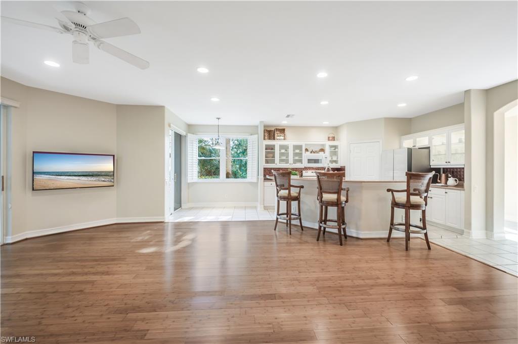 This end unit Coach Home with a SOUTHWEST view has a great New Price. Largest living space in Tarpon Cove. Enjoy the coastal breezes and spectacular water views of the lake and fountains from this enviable second-floor unit. Note the additional privacy offered by the adjacent green space separating you from your neighbors. The Entry features 3 windows and a gallery loft leading up to the spacious open floor plan. The hand-scraped engineered hardwood flooring flows throughout the den, hall, kitchen, main living area, and master bedroom. The white cabinet-packed kitchen features recessed lighting, a lighted ceiling fan, under cabinet lighting, a tiled backsplash, a walk-in pantry, white appliances, a breakfast bar, and a cozy nook for added space. Three generously sized bedrooms, each with a walk-in closet, corner windows for lots of light and cross-breezes, and ceiling fans. Loads of storage space. Den/Office is open and bright. The large Lanai is L-shaped, tiled, and is accessed from kitchen, master & living rm. The driveway provides an advantage because only two residents use it. Recent updates include: Bathroom faucet fixtures, dual master shower head, garage door motor, water heater, garbage disposal, Ecobee smart thermostat, ceiling fans in lanai and kitchen, A/C 2021. Ready to move in & furnished. Within biking distance of both Barefoot Beach and Delnor Wiggins State Park. Tarpon Cove community has 3 pools, a hot tub, and a community building with kitchen, library and social gatherings during season. If you want more activities/amenities, the Tarpon Cove Yacht & Racquet Club is mins up the road offering Tennis, fitness, bocce, inside/outside dining, boat taxi, pool, and great social events. The Marina has slips to rent or buy, make this your next location in SW Florida.