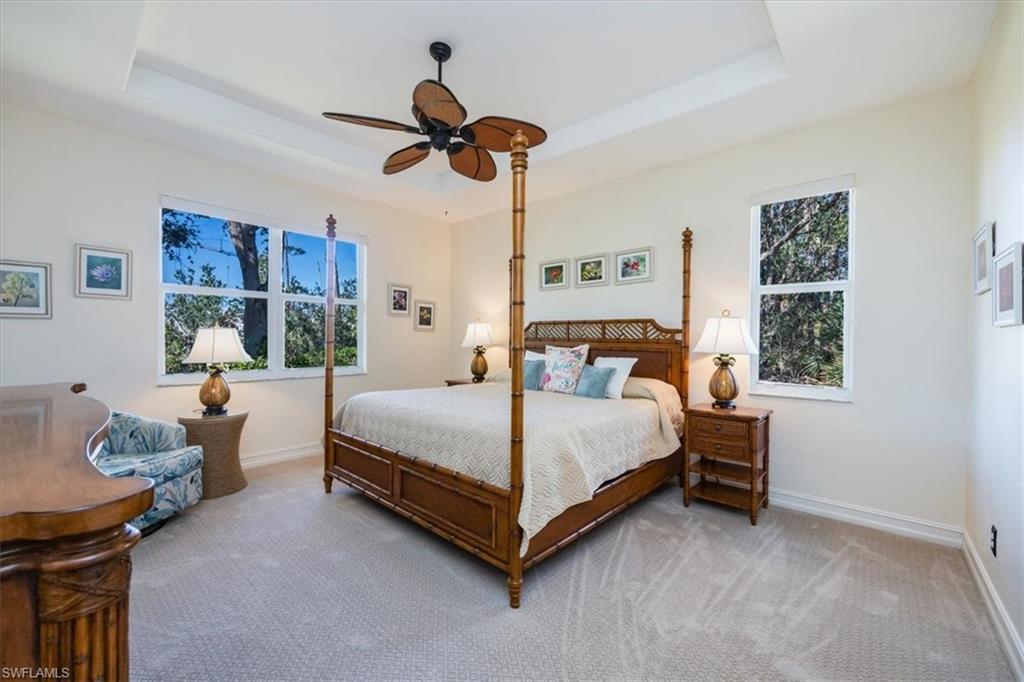 NEW ENERGIZED PRICE for this second floor BIMINI (largest floor plan) in TARPON COVE! Incredible value, updated and stunning, light and bright, open and airy, classy and comfortable, neutral, artful, and impeccable! The home features fabulous vaulted ceilings, crown molding, plantation shutters, luxury COREtec vinyl plank flooring and designer touches throughout. The open Kitchen offers white matte corian counters, Carrara marble backsplash, custom sliding drawer cabinetry accented with black pulls, pot filler faucet, Fisher Paykel SS double dishwasher, GE SS refrigerator, GE SS convection stove and microwave, spacious walk-in pantry, generous island and inviting breakfast nook. The Great Room allows for fabulous gatherings and opens to an expansive lanai that overlooks the lush preserve. A tranquil Primary Suite is quiet luxury at its best with soothing color palette, distinctive tray ceiling, rich hardwood flooring, floor to ceiling custom mirror, stunning bathroom with custom dual vanity and linen cabinet, and 3 ample closets! The opposite wing of the home offers a sunfilled den or study for work, crafts or relaxation. Two additional bedrooms, each with personal walk-in closets, updated Bath, separate laundry room and an attached 2 car garage complete the offering. TARPON COVE has been high and dry with an elevation of 11.5 ft above sea level, is surrounded by mature preserve, beautifully landscaped, has tree lined streets, 3 pools, hot tub and social clubhouse. Optional membership to Tarpon Cove Yacht and Racquet Club is available with tennis, bocce, fitness center, dining and beach shuttle. The Gulfs sandy white beaches are just 2 miles away. PRIME LOCATION, FANTASTIC NEW PRICE, MOTIVATED SELLER!