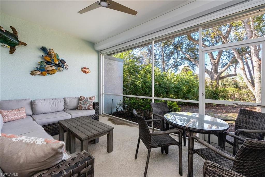 Prime Location • Turn-Key Furnished • Incredible Value • Positioned on one of the most desirable lots in Tarpon Cove, this beautifully updated first-floor end unit offers rare privacy with an expansive side yard and serene pond views with a water fountain feature out back. Offered turn-key furnished with designer pieces from Stickley, Fjords, and Divani—including power reclining sofas and loungers—this residence is the perfect blend of luxury, comfort, and effortless living. A private entry breezeway with newly installed porcelain tile sets the tone, leading into an inviting interior with warm vinyl plank flooring throughout. The open floor plan includes two bedrooms, two full bathrooms, and a versatile den with a large closet—ideal for use as a third bedroom, office, or media space. The updated kitchen and primary bath feature granite countertops, custom lighting, and quality finishes. Storm shutters on all windows and the fully tiled lanai offer peace of mind. Tarpon Cove is a gated, west-of-41 community with lush landscaping, three resort-style pools, a spa, and community clubhouse. Residents enjoy easy access to the Gulf—bikeable to the beach—and are just minutes from the vibrant shops and restaurants of Mercato. Proximity to the newly developed Kinsale Golf Club adds even more value and lifestyle appeal. With no history of flooding or water intrusion, this meticulously maintained "storm-surge safe" property is move-in ready and priced to sell. Rarely does a lot and location like this become available—schedule your private showing today.