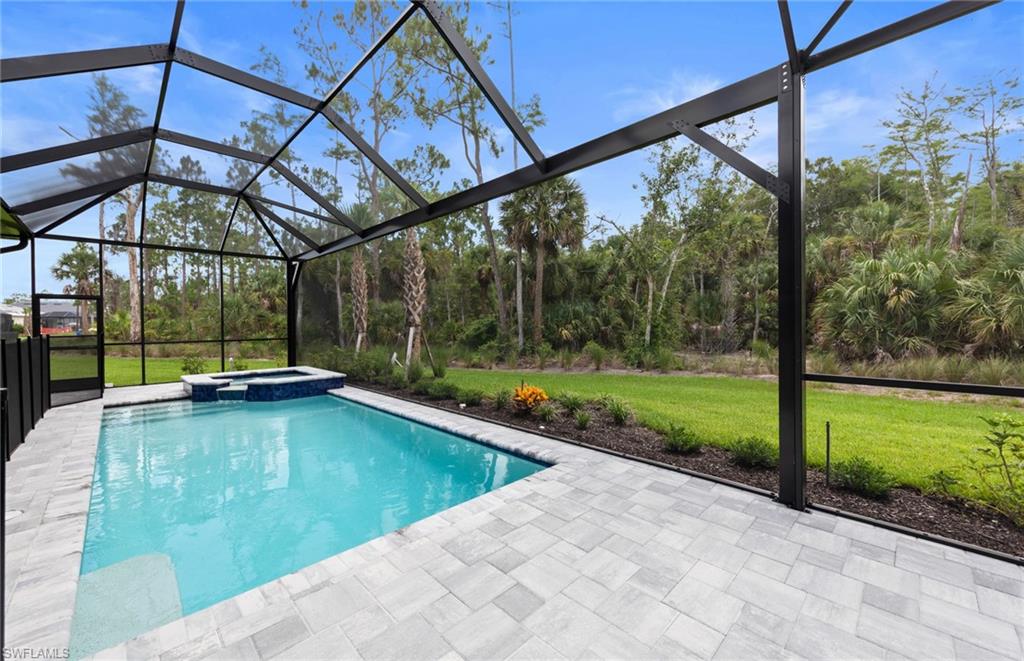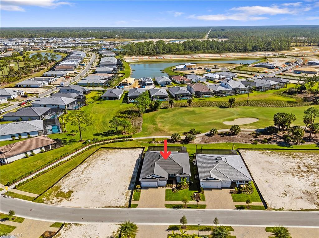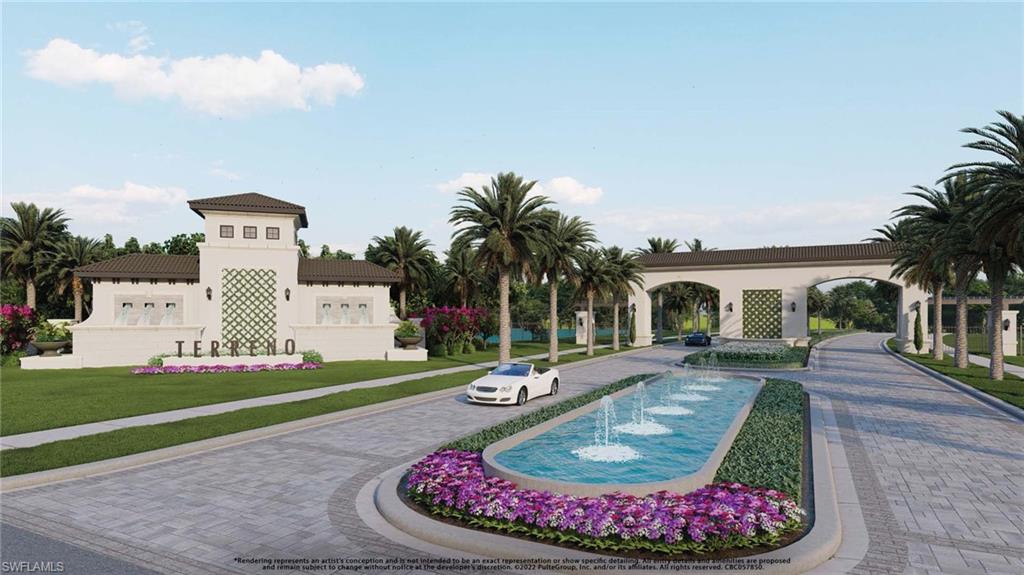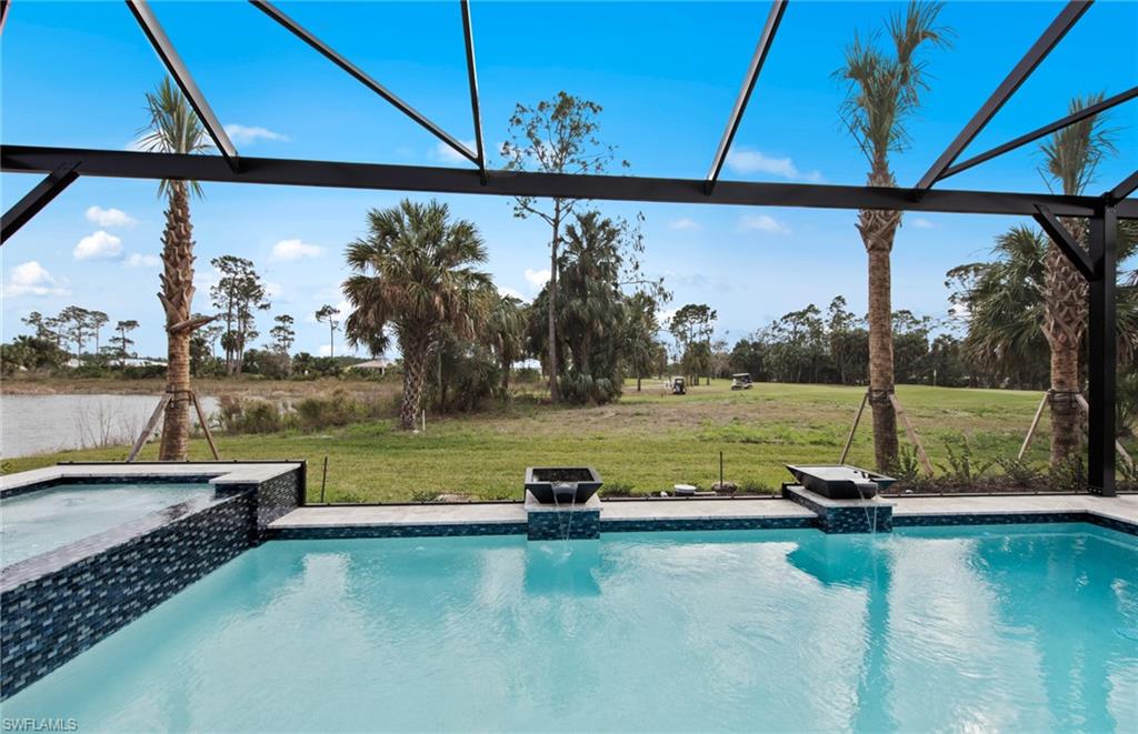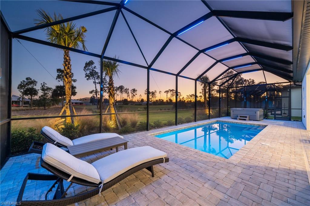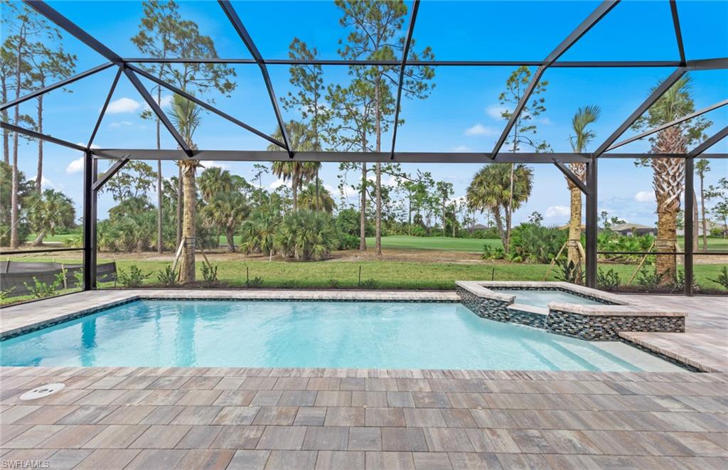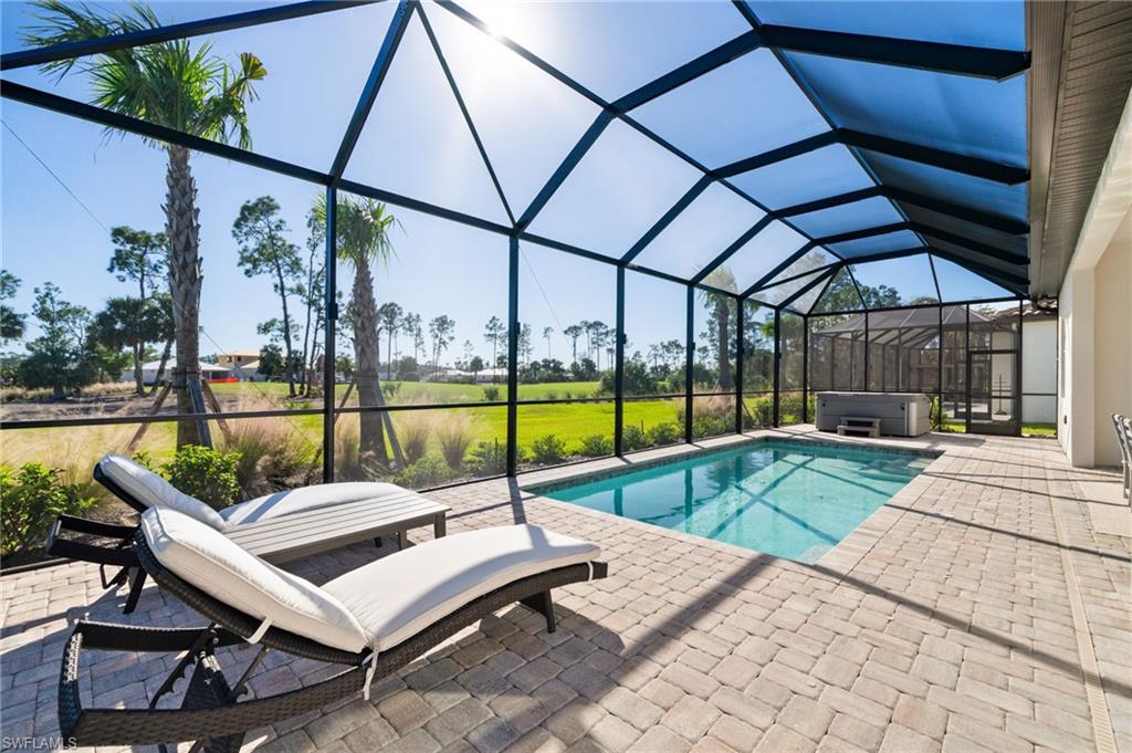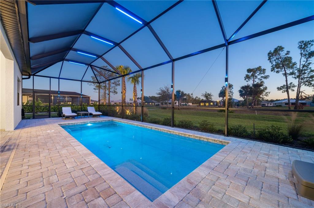New construction home available now! This Layton 3-car garage, 3 bath+den, screened stunning custom pool and spa home is on one of, if not thee best lots in Terreno. This gem sits within a cul-de-sac and has south facing views of the golf course and lake. Must see in person! This home has been built with a ton of upgrades including: enlarged owner's shower with dual showerheads, separate entry to the screened in lanai from owner's suite, full laundry upgrade including cabinets/countertops with a utility sink, tray ceiling in the enclosed flex room, group 4 countertops, group 5 cabinets, stainless steel appliances including KA 48" built-in refrigerator, floor outlets, under cabinet lighting, pendant pre-wiring, epoxy flooring finish and stucco on walls in garage & more. Terreno by DiVosta is a gated community offering a resort lifestyle with open floor plans, gourmet kitchens, and large outdoor living spaces. For those looking for resort lifestyle communities with private amenities and modern houses, or luxury homes for sale in Naples, FL, Terreno should be your top choice. Neighborhood features include 15,000 sq. ft. grand clubhouse with large community room for events, catering kitchen, state-of-the-art fitness center, exercise studio, 8 pickleball courts, 2 tennis courts, dog park, playground, firepit lounge, dog park, resort style pool, lap lanes, heated spa, full-service restaurant bar & grill, food truck drive-up, 18-hole public golf-course with golf-cart path next door & more!