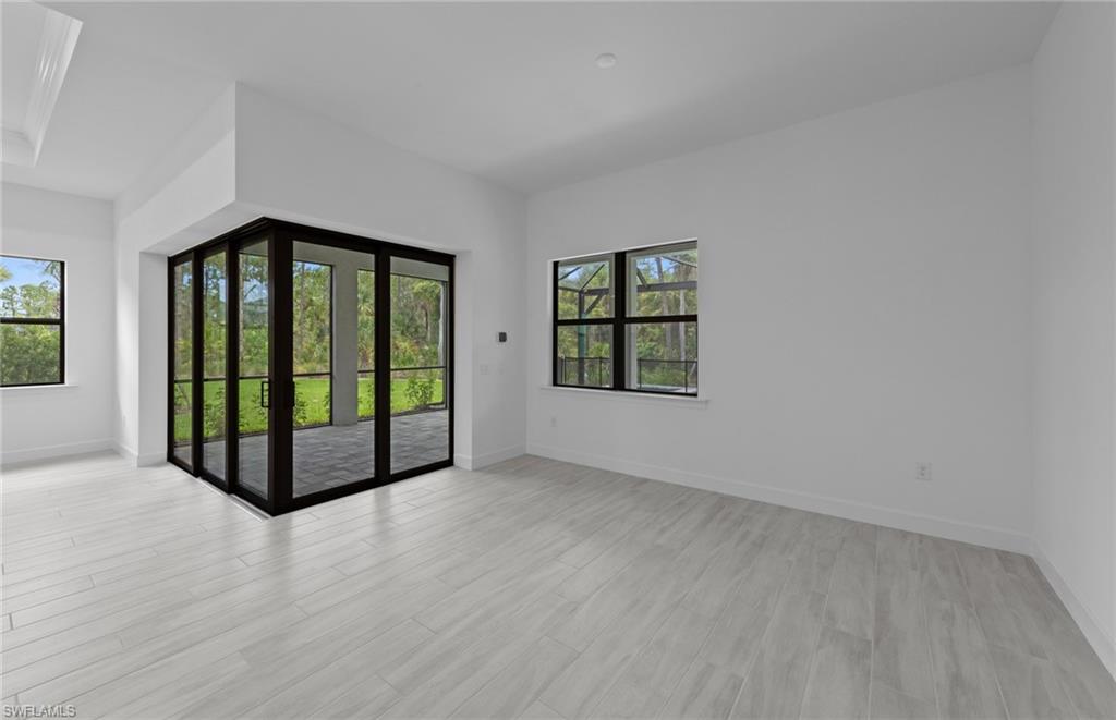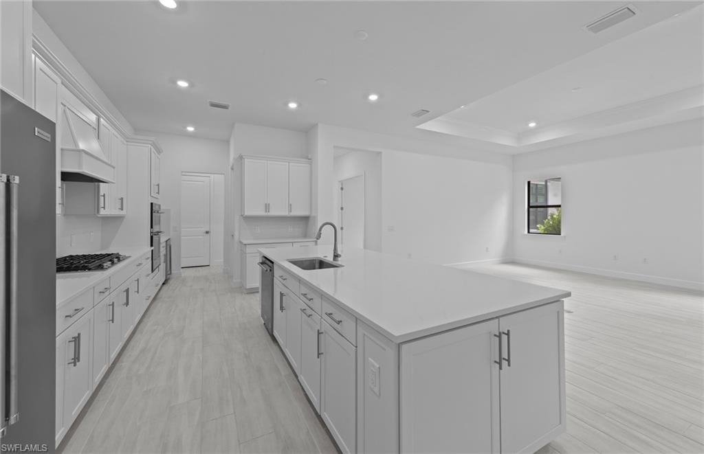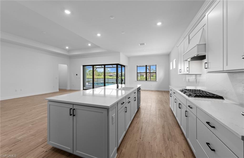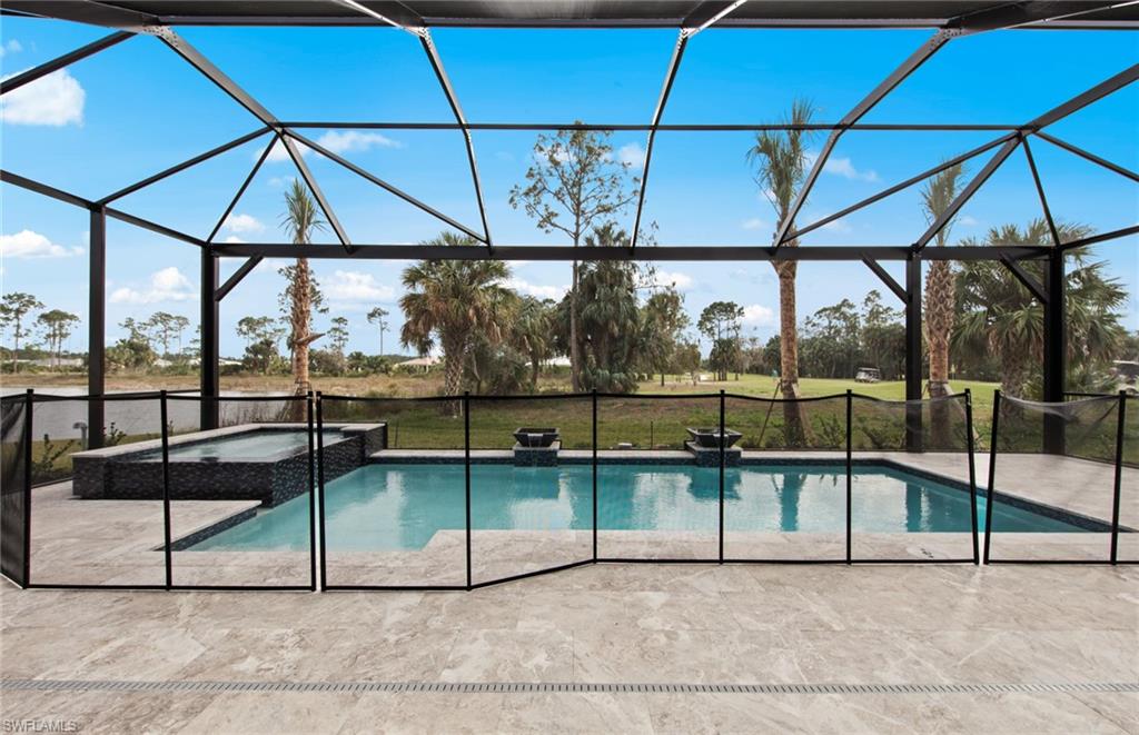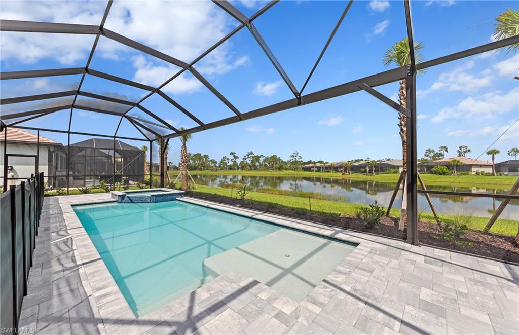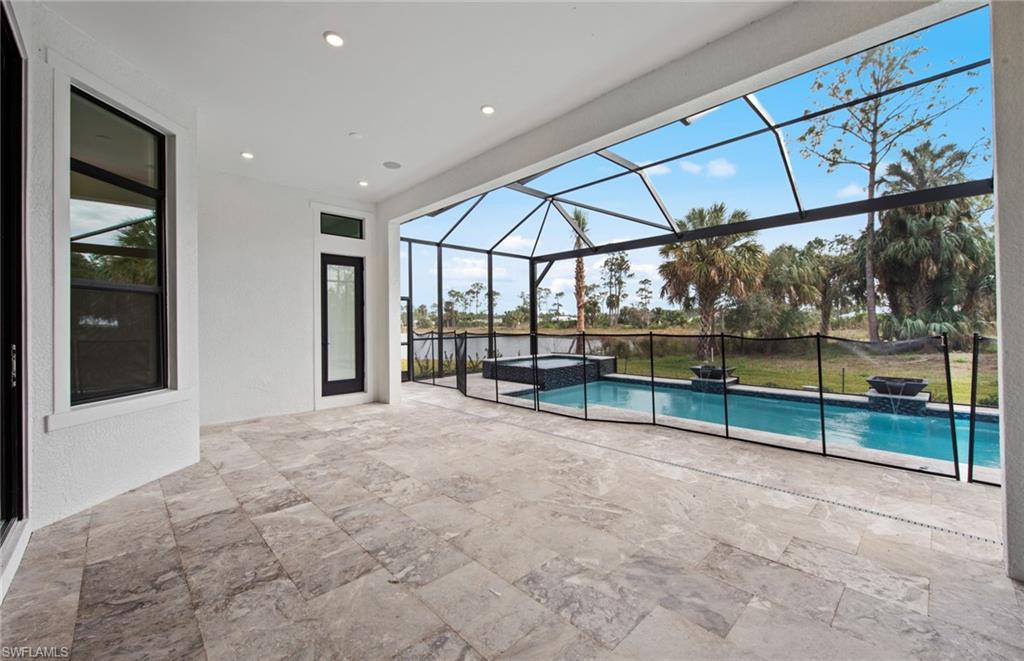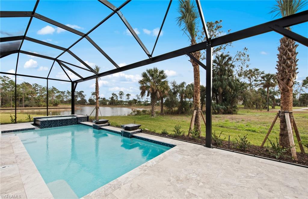 New construction Stellar plan with water views - AVAILABLE NOW! This Stellar pool & spa home features white cabinetry with matte black pulls and high end quartz countertops, impact windows, 10' zero corner sliding glass door (impact), built in kitchen appliances, beautiful wood look tile floors throughout, extended covered lanai with outdoor kitchen prep, 4' garage extension with epoxy finish, & so much more! Terreno by DiVosta is a gated community offering a resort lifestyle with open floor plans, gourmet kitchens, and large outdoor living spaces. For those looking for resort lifestyle communities with private amenities and modern houses, or luxury homes for sale in Naples, FL, Terreno should be your top choice. Neighborhood features include 15,000 sq. ft. grand clubhouse with large community room for events, catering kitchen, state-of-the-art fitness center, exercise studio, 8 pickleball courts, 2 tennis courts, dog park, playground, firepit lounge, dog park, resort style pool, lap lanes, heated spa, full-service restaurant bar & grill, food truck drive-up, 18-hole public golf-course next door & more!