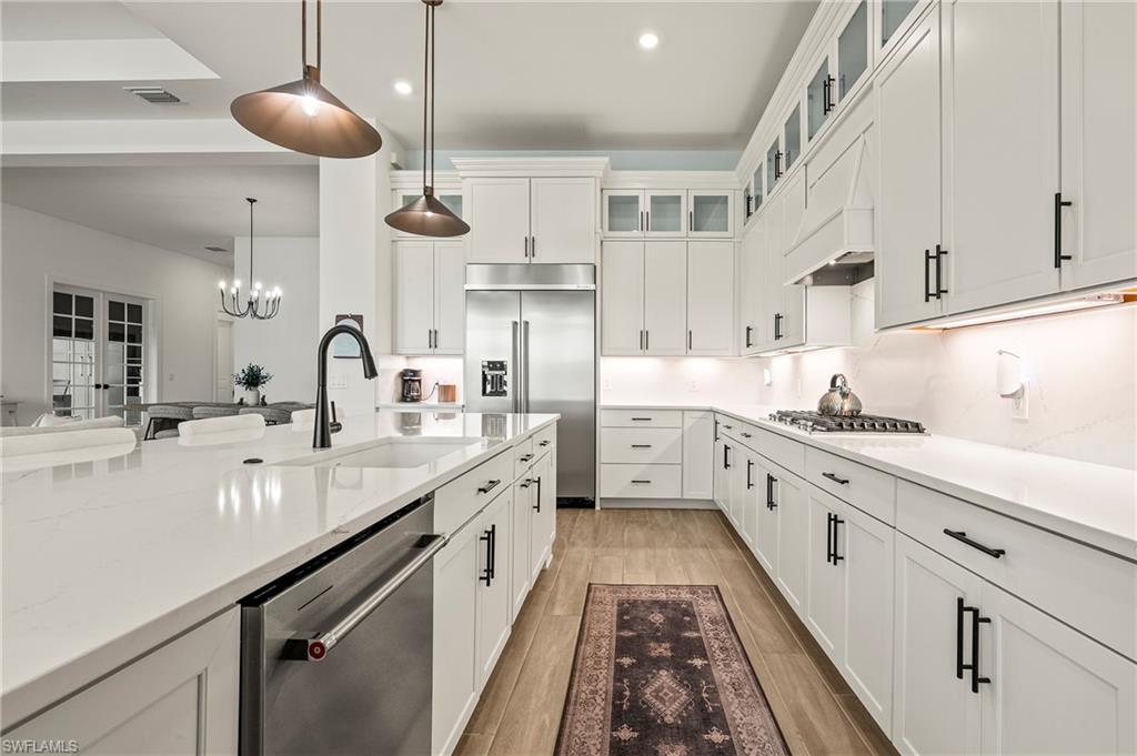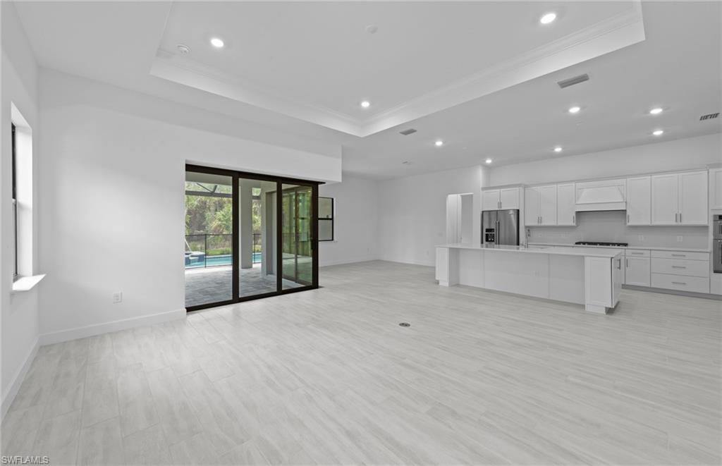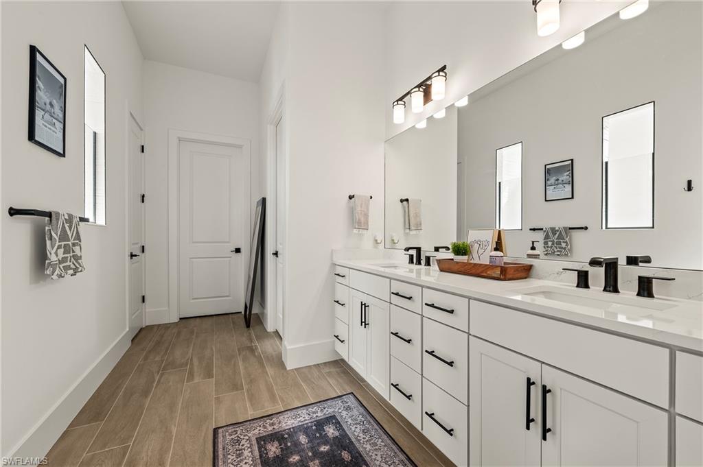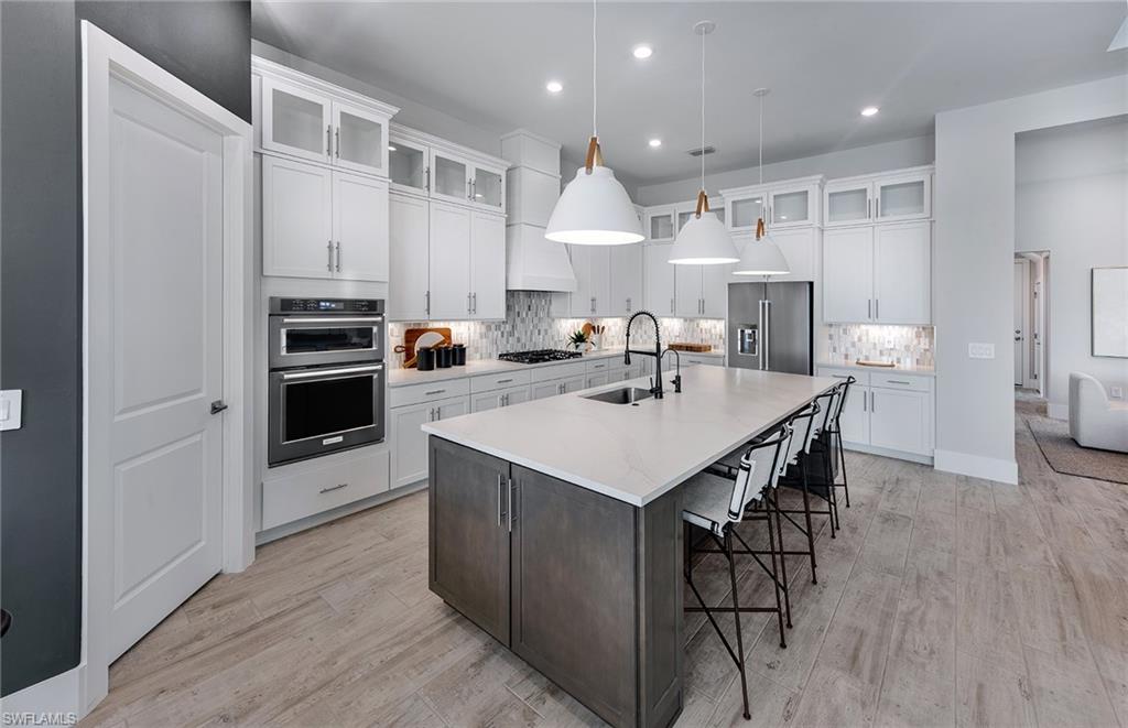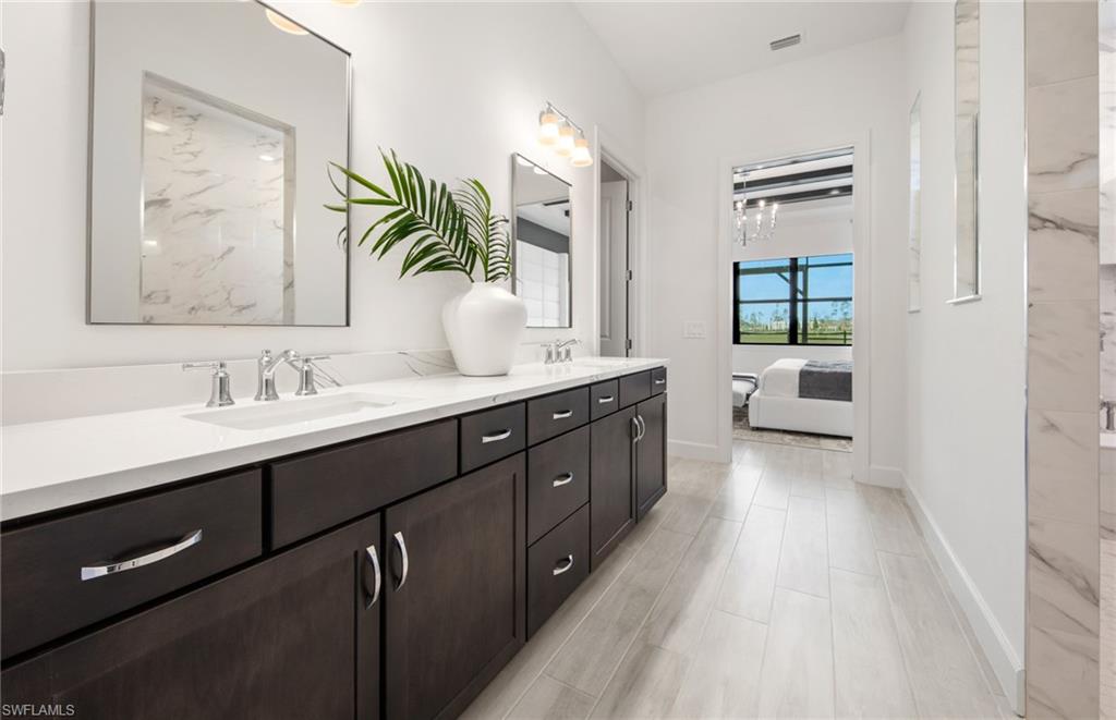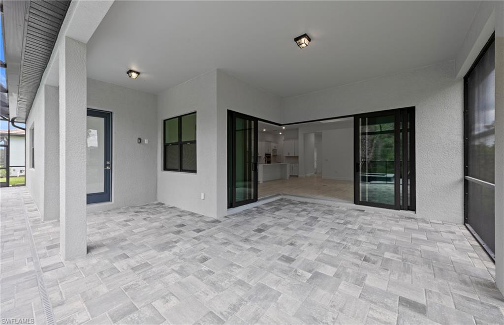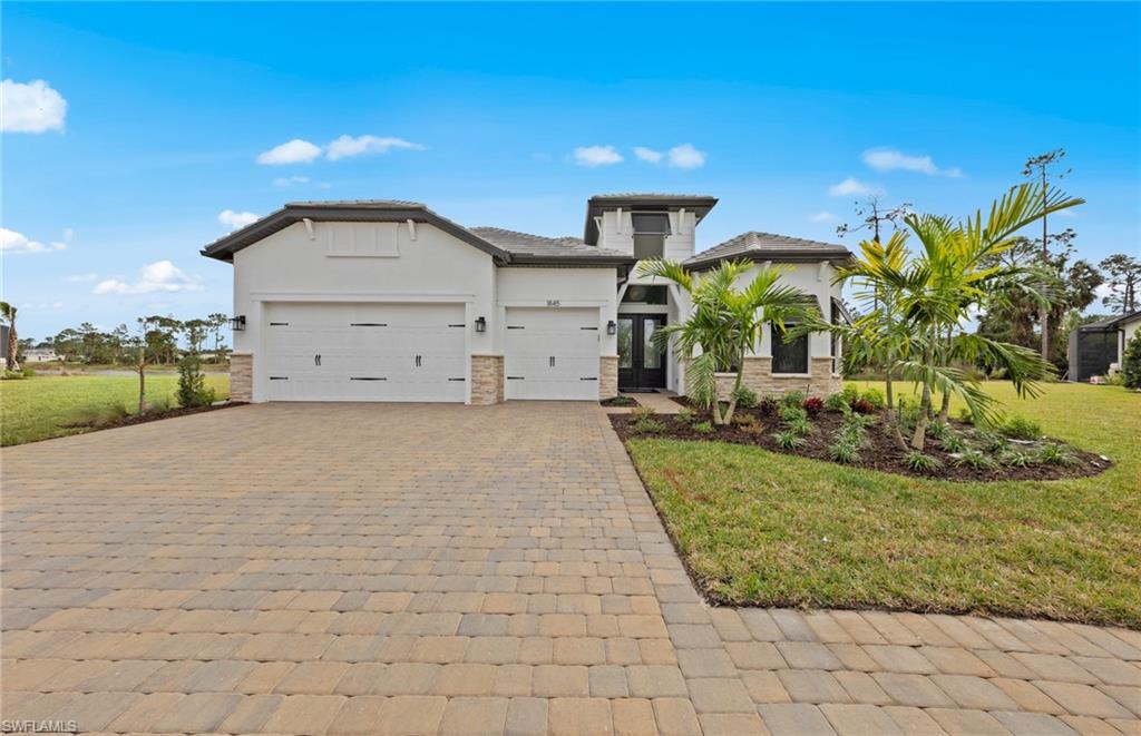 New construction Stellar plan with water views - AVAILABLE NOW! This Stellar pool & spa home features white cabinetry with matte black pulls and high end quartz countertops, impact windows, 10' zero corner sliding glass door (impact), built in kitchen appliances, beautiful wood look tile floors throughout, extended covered lanai with outdoor kitchen prep, 4' garage extension with epoxy finish, & so much more! Terreno by DiVosta is a gated community offering a resort lifestyle with open floor plans, gourmet kitchens, and large outdoor living spaces. For those looking for resort lifestyle communities with private amenities and modern houses, or luxury homes for sale in Naples, FL, Terreno should be your top choice. Neighborhood features include 15,000 sq. ft. grand clubhouse with large community room for events, catering kitchen, state-of-the-art fitness center, exercise studio, 8 pickleball courts, 2 tennis courts, dog park, playground, firepit lounge, dog park, resort style pool, lap lanes, heated spa, full-service restaurant bar & grill, food truck drive-up, 18-hole public golf-course next door & more!