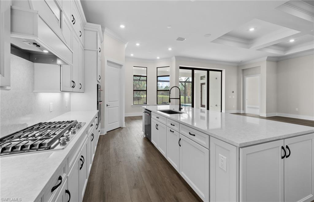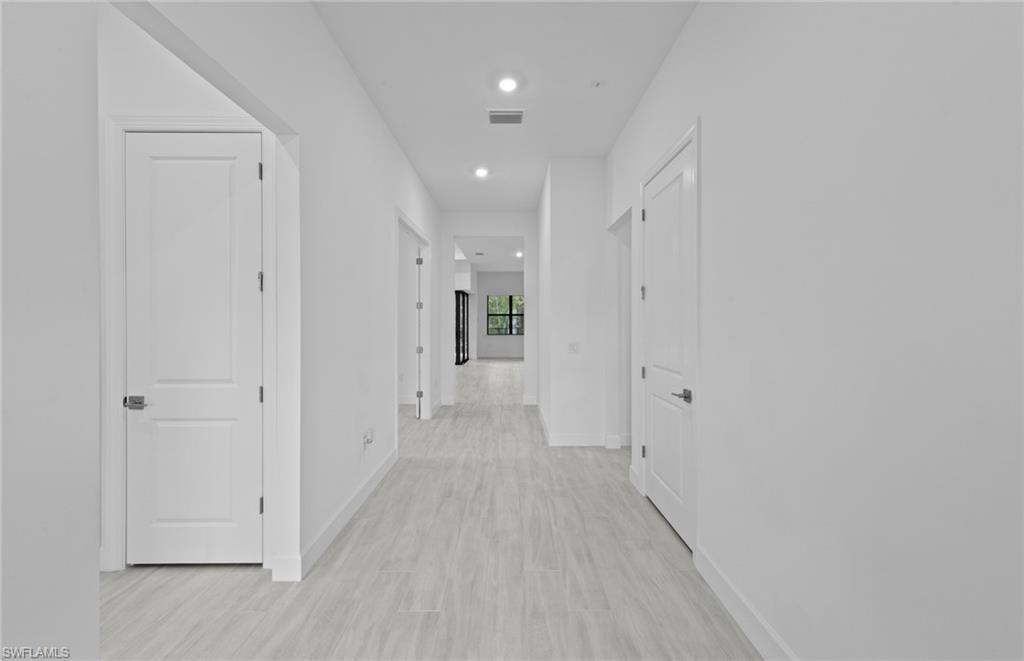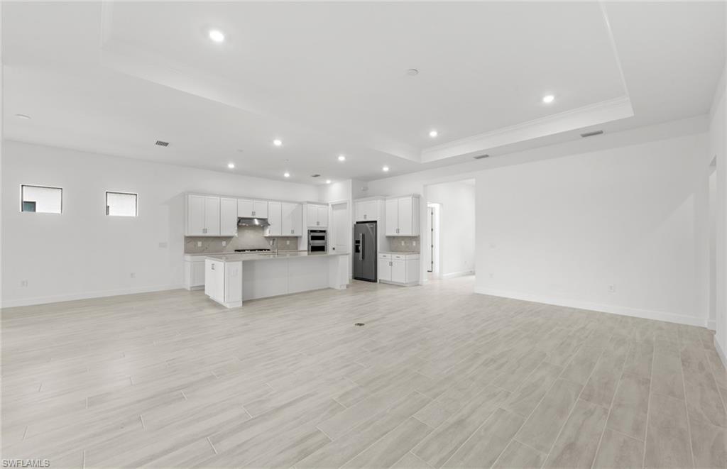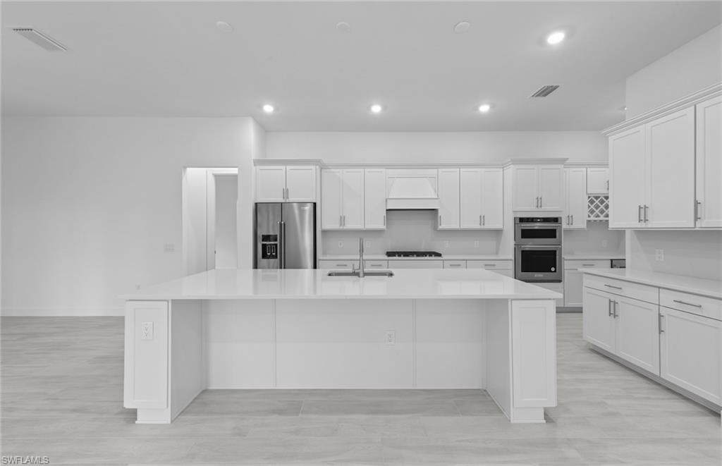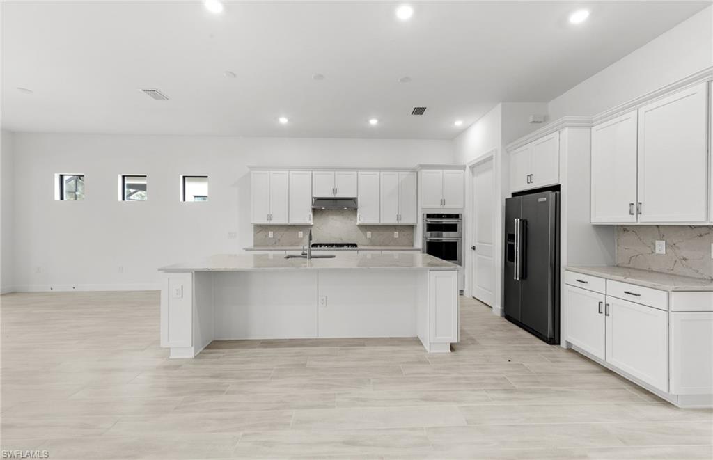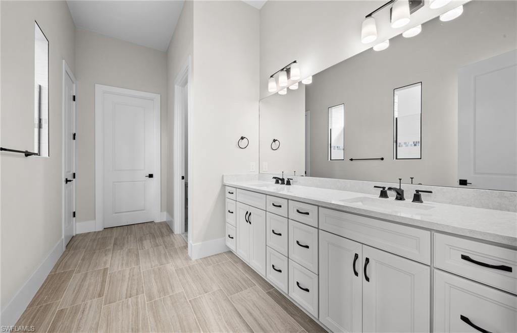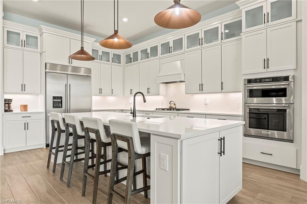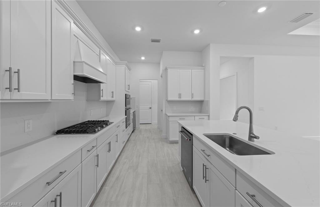 New construction Stellar plan with water views - AVAILABLE NOW! This Stellar pool & spa home features white cabinetry with matte black pulls and high end quartz countertops, impact windows, 10' zero corner sliding glass door (impact), built in kitchen appliances, beautiful wood look tile floors throughout, extended covered lanai with outdoor kitchen prep, 4' garage extension with epoxy finish, & so much more! Terreno by DiVosta is a gated community offering a resort lifestyle with open floor plans, gourmet kitchens, and large outdoor living spaces. For those looking for resort lifestyle communities with private amenities and modern houses, or luxury homes for sale in Naples, FL, Terreno should be your top choice. Neighborhood features include 15,000 sq. ft. grand clubhouse with large community room for events, catering kitchen, state-of-the-art fitness center, exercise studio, 8 pickleball courts, 2 tennis courts, dog park, playground, firepit lounge, dog park, resort style pool, lap lanes, heated spa, full-service restaurant bar & grill, food truck drive-up, 18-hole public golf-course next door & more!
