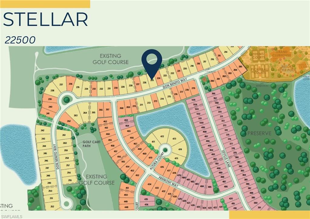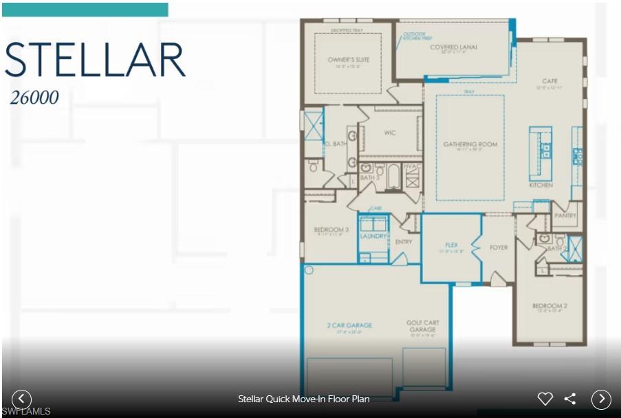 New construction Stellar plan with golf course views - AVAILABLE NOW! This Stellar pool & spa home with golf course view features impact windows, 10' zero corner sliding glass door (impact), natural gas appliances, laundry upgrade with appliances, beautiful group 6 48" tile floors throughout, extended covered lanai with outdoor kitchen prep, 4' garage extension with epoxy finish, & so much more! Terreno by DiVosta is a gated community offering a resort lifestyle with open floor plans, gourmet kitchens, and large outdoor living spaces. For those looking for resort lifestyle communities with private amenities and modern houses, or luxury homes for sale in Naples, FL, Terreno should be your top choice. Neighborhood features include 15,000 sq. ft. grand clubhouse with large community room for events, catering kitchen, state-of-the-art fitness center, exercise studio, 8 pickleball courts, 2 tennis courts, dog park, playground, firepit lounge, dog park, resort style pool, lap lanes, heated spa, full-service restaurant bar & grill, food truck drive-up, 18-hole public golf-course next door & more!