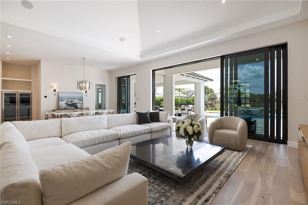 Stunning showcase home in The Enclave of Distinction, designed by renowned Naples firm Stofft Cooney Architects and brilliantly finished by Molly Hoover Interior Design. Set within a boutique gated community of just 27 residences, known for its paver streets, lush landscaping, sidewalks, and warm sense of privacy, this former model home offers 4,121 square feet of beautifully curated living space. The residence features 4 en-suite bedrooms, a den, a powder room, mud room, a second-floor family room, and a 3-car air-conditioned garage. Upon entering, a 15’ lofted ceiling with custom beam millwork, wide-plank white oak floors, and a full wall of sliding glass doors create a stunning welcome that flows seamlessly into the home’s outdoor oasis. The expansive 716-square-foot outdoor living area, complete with motorized bug screens and an outdoor kitchen, overlooks a custom-designed pool with sun shelf, sunken spa, and waterfall feature, all framed by updated tropical landscaping. Western exposure provides beautiful afternoon light and spectacular sunsets. The open chef’s kitchen includes Viking appliances with gas cooktop, custom wood cabinetry, wine cooler and a large walk-in pantry. The first-floor primary suite offers a luxurious retreat including a spacious bedroom with 12-foot ceilings and paneled feature wall, a spa-like 5-fixture primary bath with a freestanding soaking tub and three closets including two walk-ins with custom closets built-ins. Additional highlights include, designer lighting, custom trim details, draperies, impact glass throughout, a 24kW whole-home generator, a whole home water softener, reverse osmosis filter system in the kitchen. Home is located in the low risk X-500 flood zone where lenders do not require flood insurance. Technology upgrades include smart home automation with Alexa voice control for Sonos audio and Lutron lighting, two HVAC systems with dampers providing four zones of cooling, motorized shades, WiFi-enabled pool equipment and garage door control and a Vitax home security system. Recent outdoor enhancements include all new shellstone patio pavers that were also expanded around the pool, a pool handrail, an updated outdoor kitchen backsplash, improved landscaping and new landscape lighting. --- The Enclave of Distinction offers a refined Naples lifestyle with gated security, walkable sidewalks, and proximity to premier destinations including Seed to Table, Gulf beaches, Mercato, and Southwest Florida International Airport. Built by Distinctive Communities, the neighborhood is celebrated for exceptional craftsmanship, natural gas availability, and intimate community design. The community also features two lakes with lighted fountains and a charming gazebo overlooking the water, offering serene gathering spaces for residents. Perfectly positioned between Mediterra and Talis Park, this enclave benefits from impressive architectural consistency and a tranquil setting paired with low HOA fees.