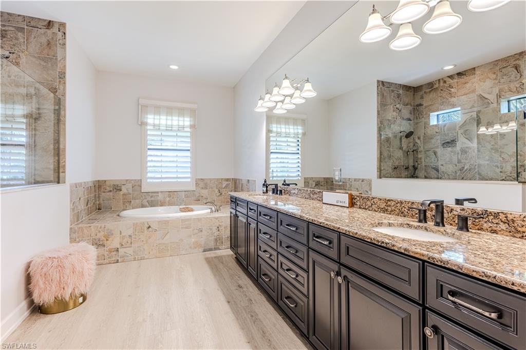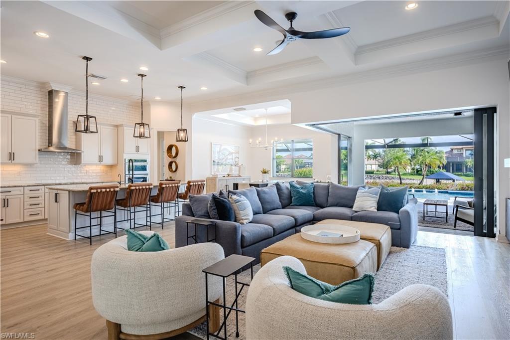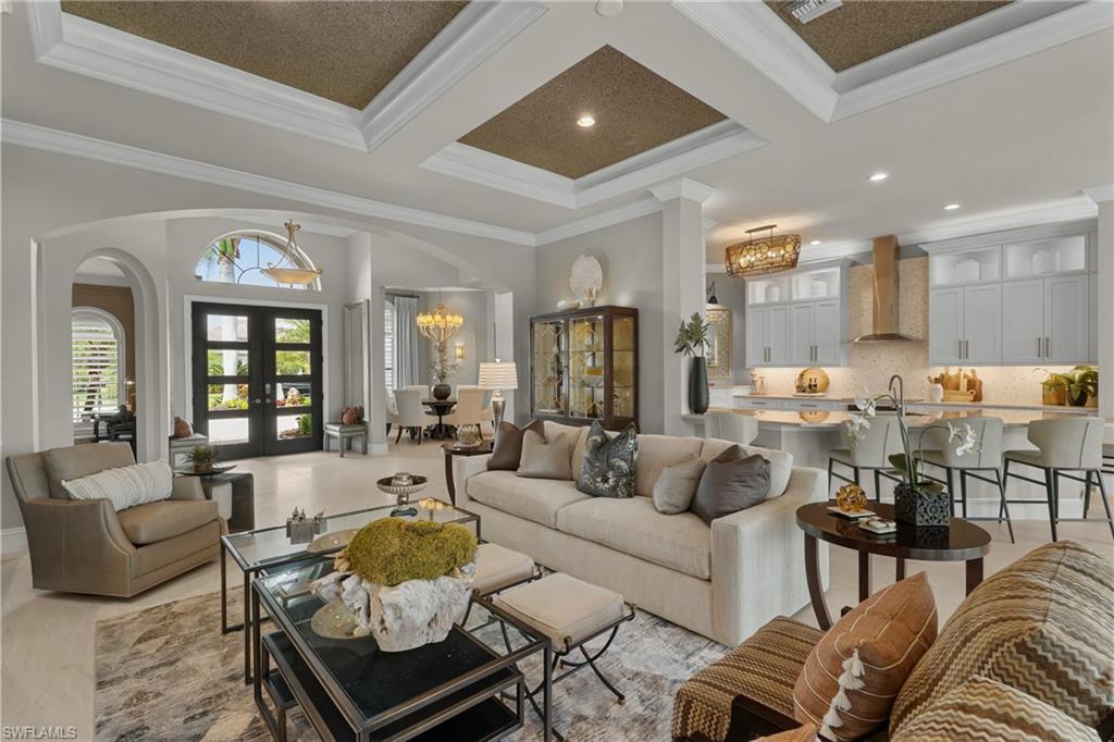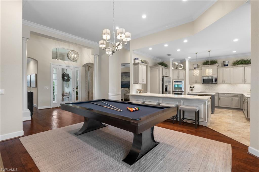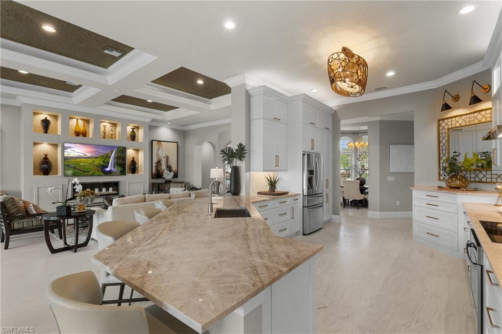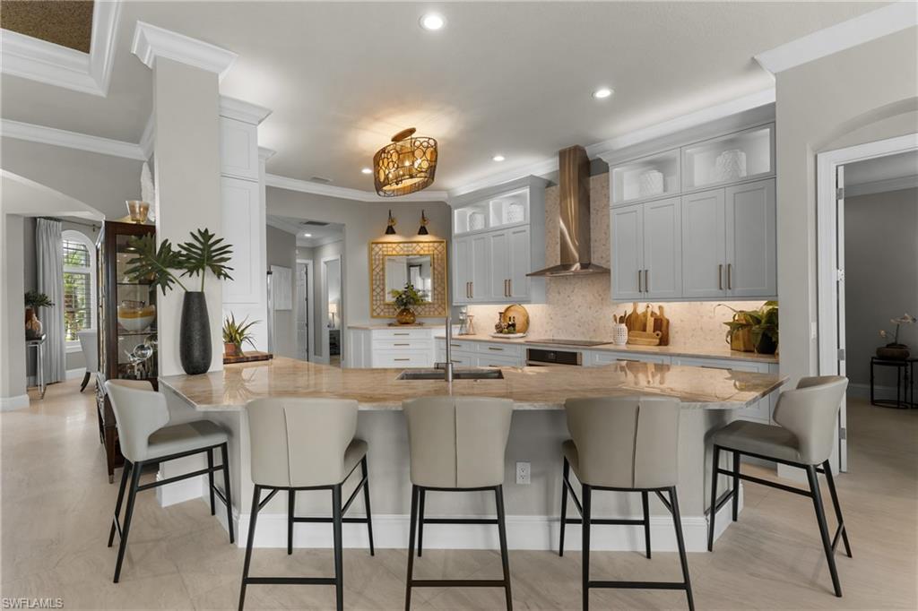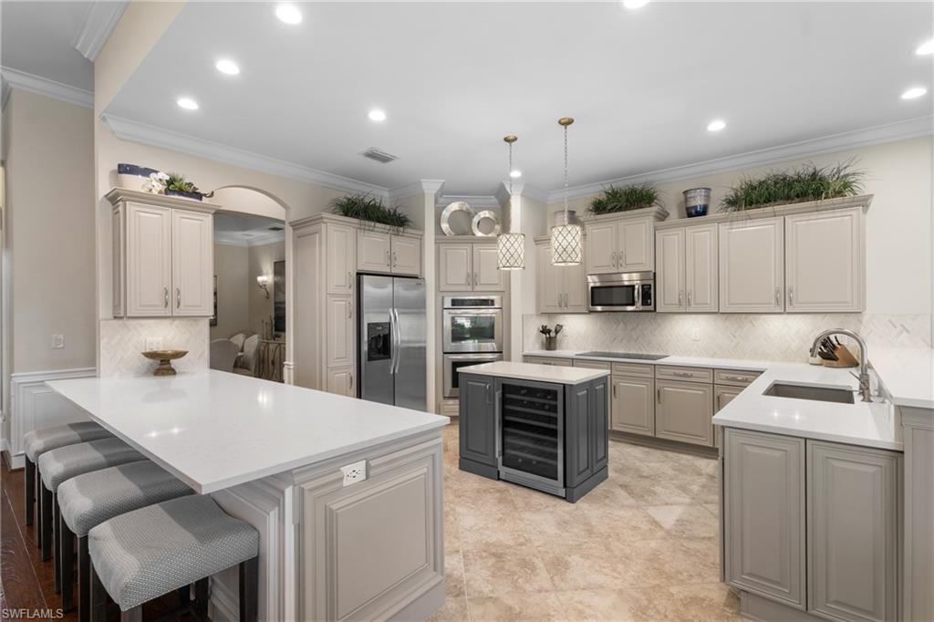 Live the Ultimate Vacation Lifestyle in The Quarry! This beautifully remodeled 4 Bedroom plus Den, 4 full bath, 3 car garage home is perfectly situated overlooking the 14th fairway with picturesque golf course, lake, and preserve views with no roof tops in sight! Custom features and professional design gives this home a model like feel and is a true one of a kind. From the moment you walk in the door, you are greeted with a wide open Great Room style floorplan with two sliding glass doors to the lanai and spacious pool area. The spacious kitchen is the heart of the home with center island, two breakfast bars with seating for 8, updated quartz countertops, custom tile backsplash, double wall ovens, wine cooler, and two additional beverage coolers, making this the perfect kitchen for entertaining. The luxurious Primary Suite features a sliding glass door to the lanai, spacious closets with cabinetry, and bath boasting dual sinks, walk in shower, soaking tub, and custom wall paper detail. Enjoy days around the heated pool/spa and al fresco dining on the lanai complete with travertine marble deck, raised sun deck, spa, and wet deck. Other fine appointments of this home include: wood floors throughout living room, dining room, den, and primary bedroom; custom window treatments throughout; custom wallpaper accents; special order chandeliers, lights, and fans; crown molding throughout; motorized roll down hurricane shutters on the lanai and front foyer; freshly painted interior; two brand new HVACs; air conditioned three car garage; and more! Furniture & decor package available! The Quarry is an exceptional lakefront community offering unparalleled amenities and a lifestyle like no other. Enjoy boating, golf, tennis, pickleball, bocce ball, a Tiki Bar, poolside food and drink service, a fully equipped gym, and a variety of social activities. The recently renovated and expanded “Lake Lodge & Beach Club” provides the perfect setting for relaxation, while over 500 acres of navigable lakes (with boat slips available for lease) offer endless opportunities for water enthusiasts. The private 18-hole golf club features optional golf and social memberships, providing an elite experience for golf lovers (full golf memberships available/no waitlist). Schedule your private showing today!