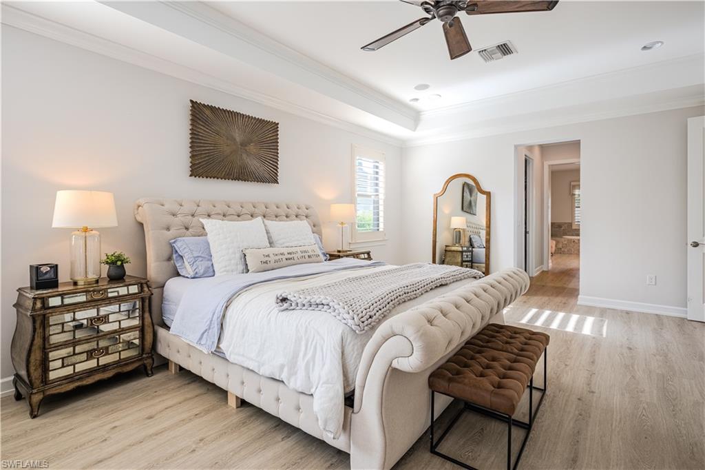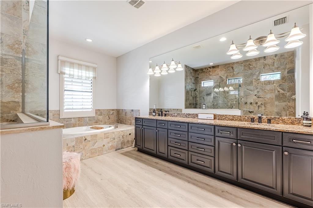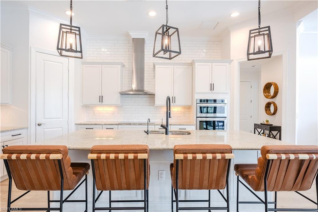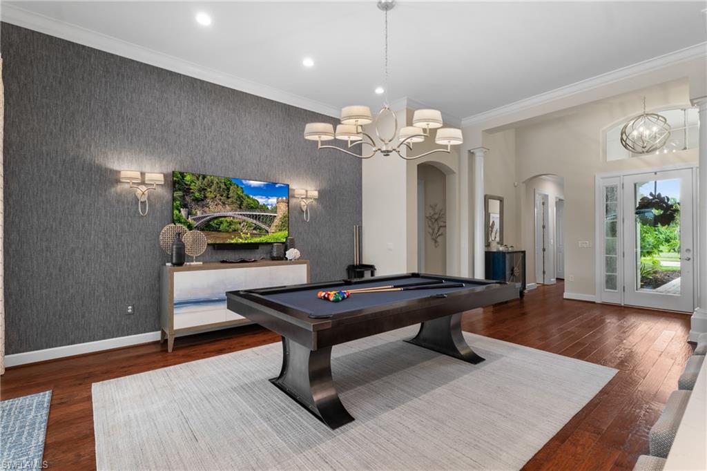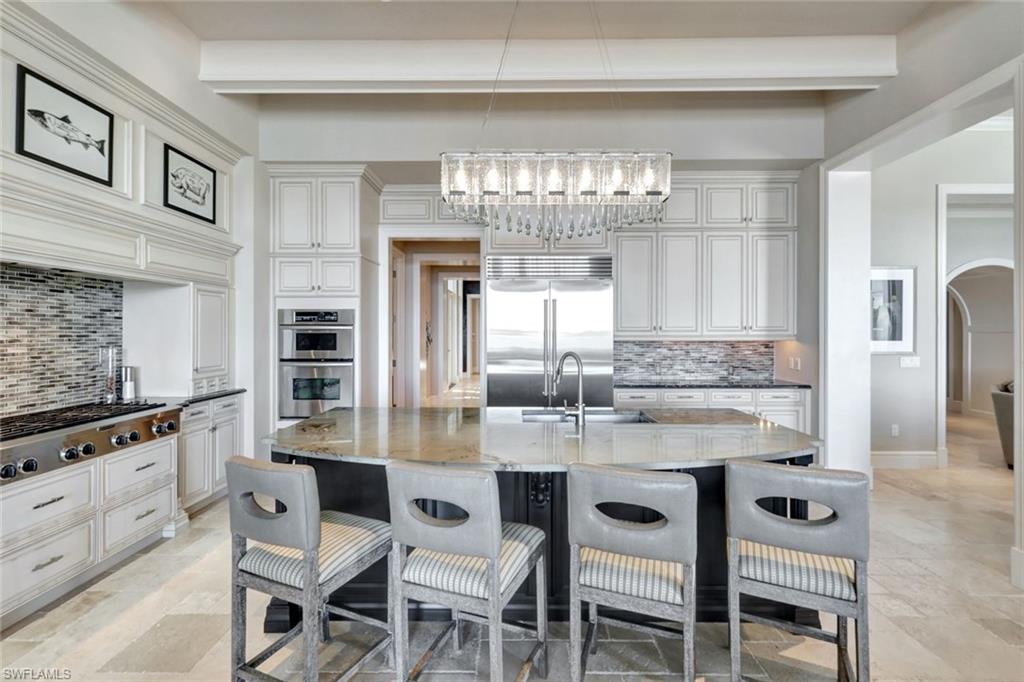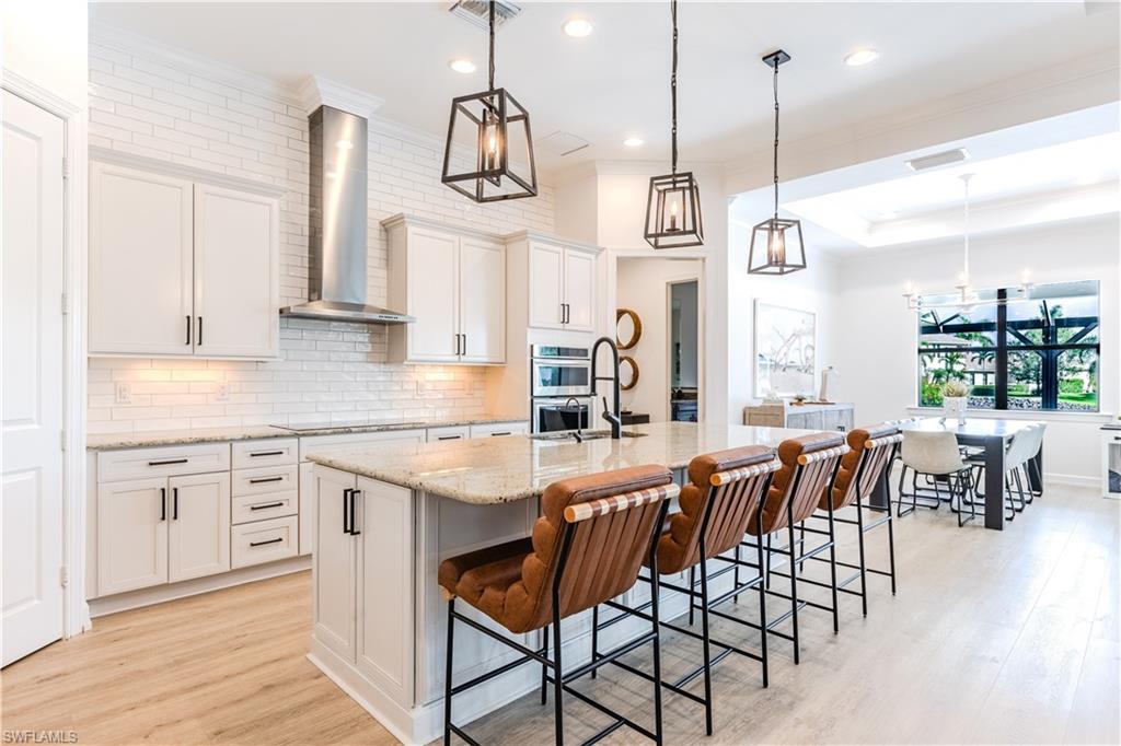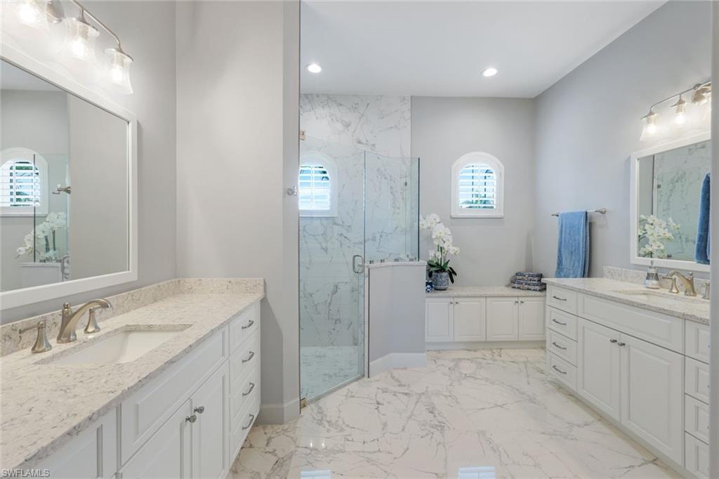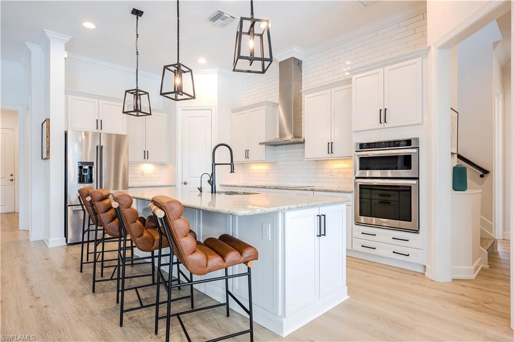 Live the Ultimate Vacation Lifestyle in The Quarry! This beautifully remodeled 4 Bedroom plus Den, 4 full bath, 3 car garage home is perfectly situated overlooking the 14th fairway with picturesque golf course, lake, and preserve views with no roof tops in sight! Custom features and professional design gives this home a model like feel and is a true one of a kind. From the moment you walk in the door, you are greeted with a wide open Great Room style floorplan with two sliding glass doors to the lanai and spacious pool area. The spacious kitchen is the heart of the home with center island, two breakfast bars with seating for 8, updated quartz countertops, custom tile backsplash, double wall ovens, wine cooler, and two additional beverage coolers, making this the perfect kitchen for entertaining. The luxurious Primary Suite features a sliding glass door to the lanai, spacious closets with cabinetry, and bath boasting dual sinks, walk in shower, soaking tub, and custom wall paper detail. Enjoy days around the heated pool/spa and al fresco dining on the lanai complete with travertine marble deck, raised sun deck, spa, and wet deck. Other fine appointments of this home include: wood floors throughout living room, dining room, den, and primary bedroom; custom window treatments throughout; custom wallpaper accents; special order chandeliers, lights, and fans; crown molding throughout; motorized roll down hurricane shutters on the lanai and front foyer; freshly painted interior; two brand new HVACs; air conditioned three car garage; and more! Furniture & decor package available! The Quarry is an exceptional lakefront community offering unparalleled amenities and a lifestyle like no other. Enjoy boating, golf, tennis, pickleball, bocce ball, a Tiki Bar, poolside food and drink service, a fully equipped gym, and a variety of social activities. The recently renovated and expanded “Lake Lodge & Beach Club” provides the perfect setting for relaxation, while over 500 acres of navigable lakes (with boat slips available for lease) offer endless opportunities for water enthusiasts. The private 18-hole golf club features optional golf and social memberships, providing an elite experience for golf lovers (full golf memberships available/no waitlist). Schedule your private showing today!