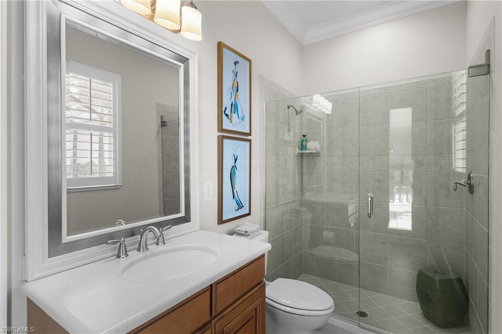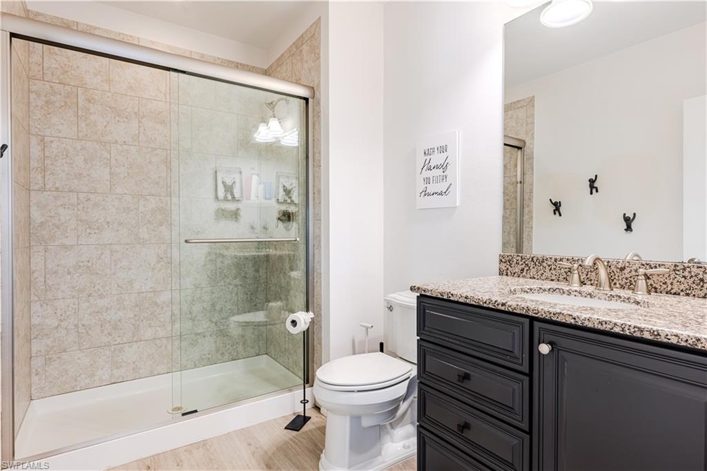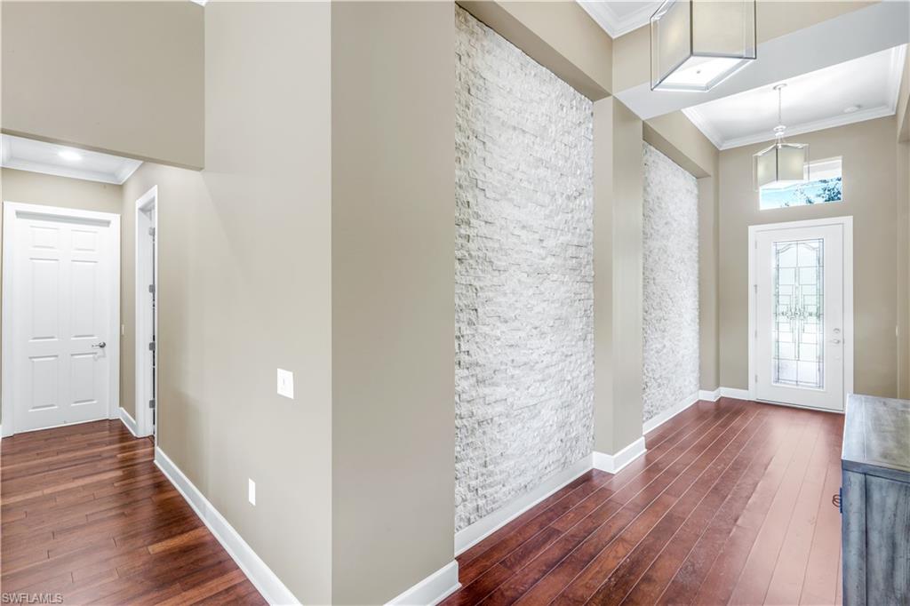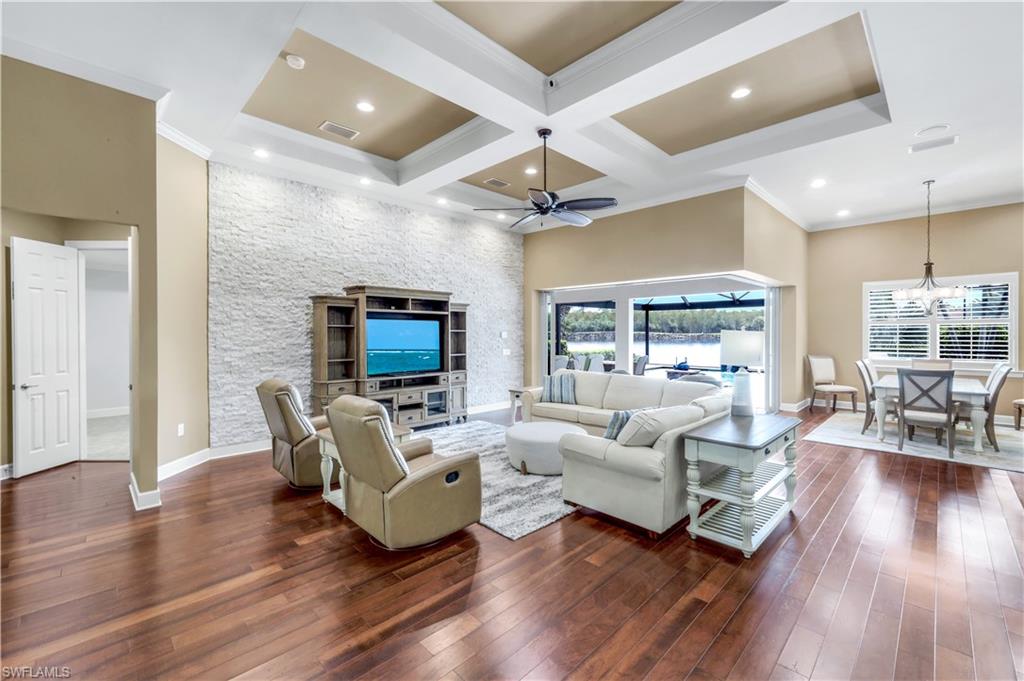 Welcome to your Naples waterfront lifestyle in The Quarry — Located in the EXCLUSIVE gated community of Breakwater Drive close proximity to the amenity-rich beach club where every day feels like vacation. This beautifully enhanced Modified Windsor floor plan featuring 5 Bedrooms (4 Ensuites), 4 full baths and a 3 car garage blends resort living with everyday comfort, offering a flexible layout and stunning lake views that make coming home feel like a getaway. Thoughtfully expanded to include a fifth bedroom with ensuite bath and an added den, this home lives large and feels light, bright, and updated throughout. The freshly painted interior (2025), custom light fixtures, and hardwood floors in the primary suite, guest bedroom, and den give a polished coastal feel. A frosted glass barn door adds privacy and style to the guest suites, while custom closet systems and remote-controlled room-darkening blinds provide everyday luxury. The main living area centers around a custom TV feature wall with a built-in fireplace, creating a warm and welcoming space for gatherings. Surround sound in the main living areas and outdoor lanai enhances movie nights for entertaining. The kitchen includes an induction stovetop and a reverse-osmosis water system, blending practicality with modern convenience. Step through the sliders and into your private outdoor oasis. Enjoy a saltwater infinity pool and spa overlooking PANORAMIC views of Stone Lake, framed by a picture-window lanai screen. A newer outdoor kitchen (2020) makes entertaining easy, while a private beach and deeded boat dock (#5) open the door to boating, kayaking, fishing, water-skiing, or simply watching the sunset over the lake. Behind the beauty, the home is built for lasting comfort and peace of mind with a newer AC handler (2021), whole-house surge-protector (2020), and whole-house generator (2024). Life at The Quarry is all about lifestyle. This gated, amenity-rich environment is perfect for boating, jet-skiing, and water sports, but it doesn’t stop there. The Beach Club features a resort pool, lap pool, hot tub, tennis, pickleball, and bocce courts, plus a Tiki bar with poolside food and beverage service, a state-of-the-art wellness center, and a full-time activities director who curates social events year-round. Golfers will love the optional golf membership at The Quarry Golf Lodge, which currently has NO WAITLIST and offers a limited-time 3-year payment plan for the PGA-level Hurdzan-Fry 18-hole course. Whether you’re a dedicated player or simply love the golf-course lifestyle without the obligation, The Quarry offers the best of both worlds. This move-in-ready waterfront home combines comfort, craftsmanship, and convenience in one of Naples’ most desirable resort communities. It’s a place where you can boat in the morning, golf in the afternoon, and unwind by the pool as the sky glows over the lake — the perfect expression of the Naples lifestyle at The Quarry!