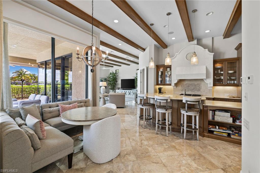 Golf and boating highlight this rare waterfront estate in The Quarry. This custom Arthur Rutenberg estate is perfectly positioned on a .38 acre home site with sweeping views of Stone Lake and the beach. A private dock and boat lift provide direct access to over 500 acres of navigable lakes and waterways, delivering an unmatched boating lifestyle right from your backyard. Step inside through wrought-iron doors and be greeted by picture windows showcasing the forever lake views and an open floor plan designed for entertaining. Highlights include a wet bar and wine bar, a chef’s kitchen with gas cooktop, exposed stained beams, multiple tray ceilings, and pocketing sliding glass doors that blend indoor and outdoor living. Notable upgrades include impact-rated windows and doors, a whole-house water softener, air-conditioned garage, two gas fireplaces, motorized roll-down hurricane and bug screens, tile and wood flooring throughout, and a custom pool with tiki torch ambiance. The Quarry is a gated, resort-style community with something for everyone: boating, championship golf, tennis, pickleball, bocce, multiple dining options, a tiki bar, poolside food and beverage service, a fitness center, and a full social calendar led by an on-site activities director. Golf membership is optional, and a $20 million renovation of the Lake Lodge and Beach Club was recently completed. A pontoon boat is also available for purchase.