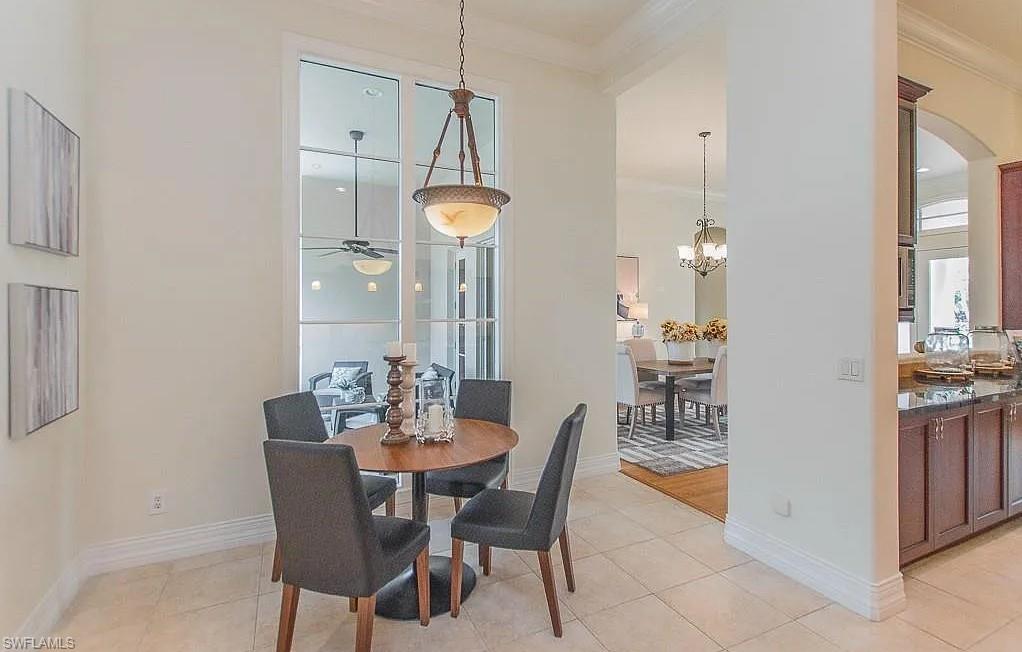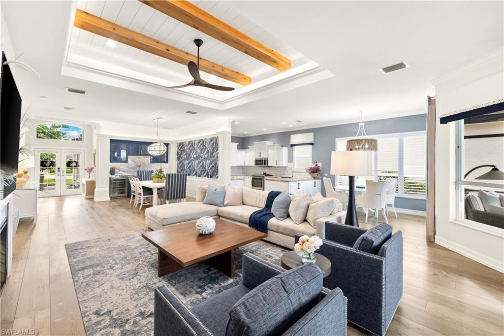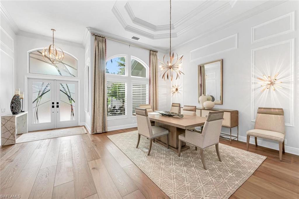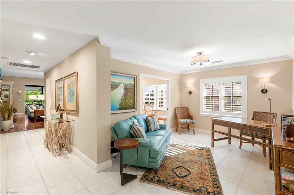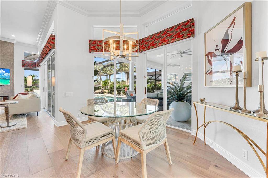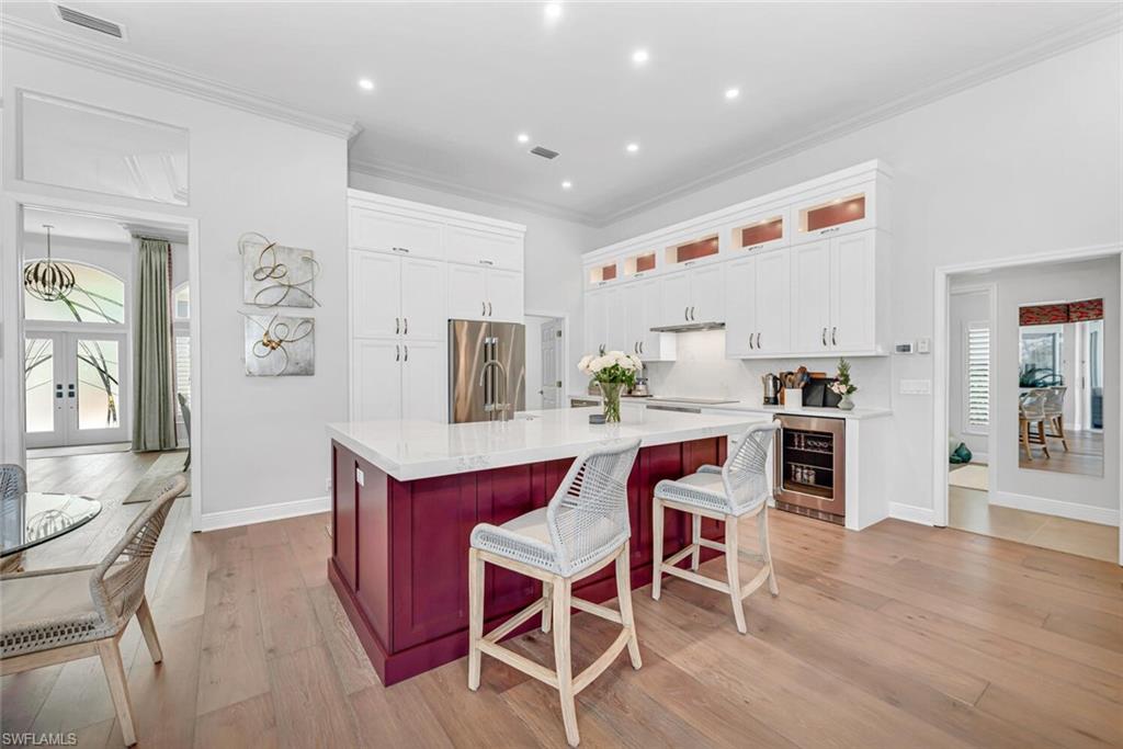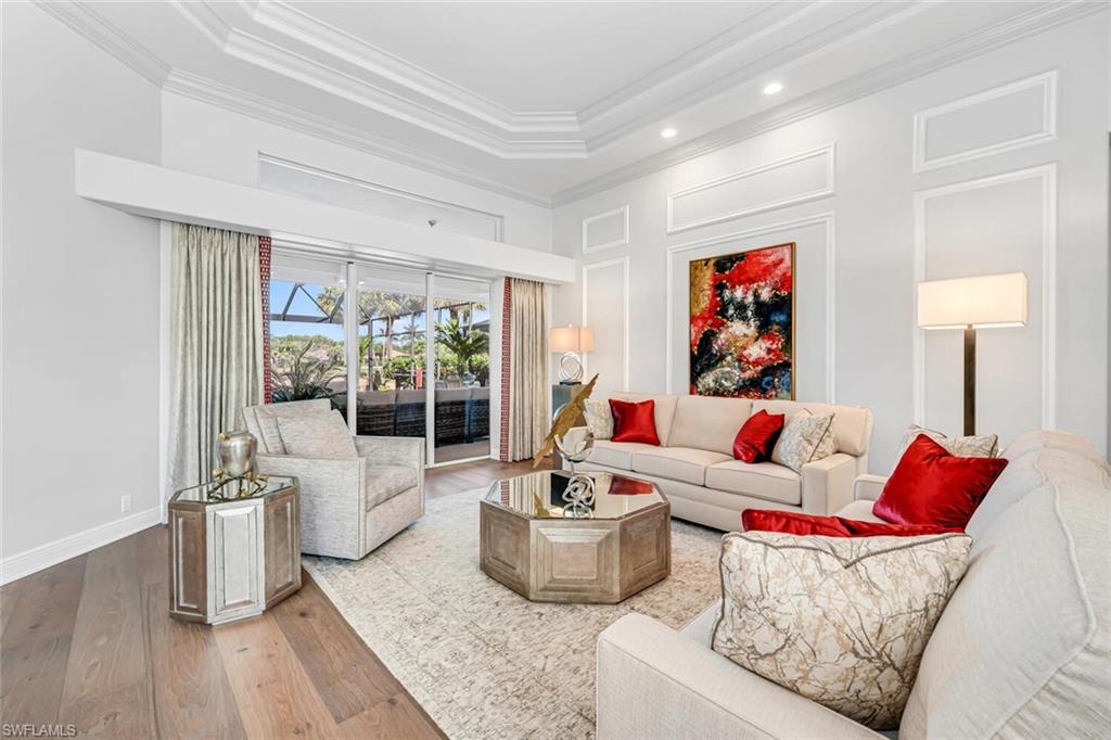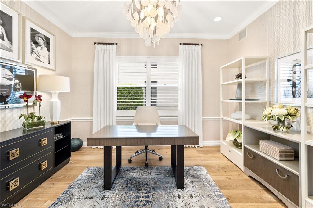 This stunning residence has been completely reimagined by the award winning team at Design West and presents a true “close today and entertain tomorrow” opportunity. Every detail of this three-bedroom plus den, South-facing pool home has been professionally curated and finished to the highest of standards, creating one of the most exceptional turnkey offerings here in Naples. Interiors showcase DuChateau hardwood flooring, a Cristallo Italian backlit quartzite wine bar, designer furnishings and window treatments, striking wallcoverings, custom ceiling inlays, refined lighting, and luxurious accessories that harmonize seamlessly throughout the entire property. The gourmet kitchen, dining, and great room flow effortlessly for entertaining, complete with custom chandeliers, area rugs, and accent furnishings. The primary suite includes a full Design West furnishing package with custom closets, wallcoverings, rug, lighting, and a wood ceiling inlay, while guest rooms and baths are equally tailored with coordinated furniture, mirrors, and finishes. Peace of mind comes with a brand-new tile roof (2019), electronic hurricane shutters with accordion shutters on remaining windows, and a custom epoxy-finished garage with cabinetry plus an extended bay for a golf cart. Outdoor living is equally refined, with a south-facing saltwater pool, sectional seating, dining areas, and designer furnishings overlooking tranquil golf course views. Offered fully furnished and accessorized, this home represents the most effortless and sophisticated move-in experience available in The Strand. Residents enjoy resort-style amenities including a full-service spa, pickleball, tennis, bocce, dining, an active social calendar, and 27 holes of championship golf. Schedule your private tour today to experience the best of Naples living.