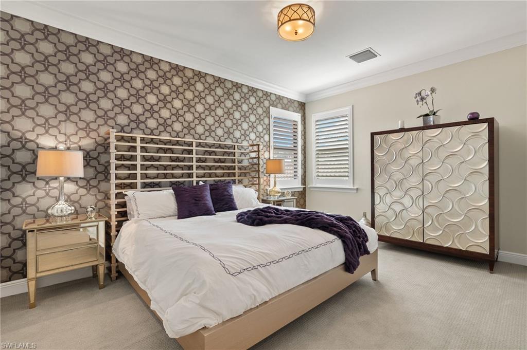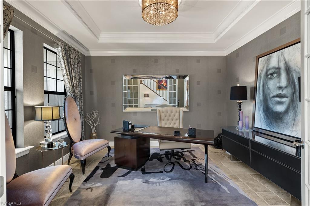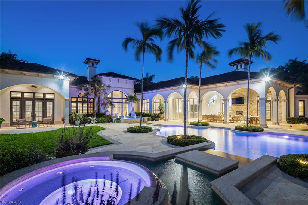 Welcome to this exquisitely designed estate home, where timeless architectural elegance seamlessly merges with spacious and comfortable living. Every facet of this residence showcases meticulous attention to detail, creating a harmonious blend of style and functionality. Nestled in a secluded and private location on over half an acre in the tranquil cul-de-sac of Marsala at Tiburon, this property is truly a sanctuary. The lushly landscaped grounds envelop a striking oversized pool, complete with a spa and cascading waterfalls, offering a serene outdoor oasis. The manicured lawn behind the pool area is fully fenced and backs onto the prestigious Greg Norman 36 hole championship golf course, ensuring both privacy and picturesque views. Step inside to discover an open floor plan adorned with elegant neutral tones and beautifully detailed ceilings. The main living areas boast stunning marble and wood floors, enhancing the sophisticated ambiance. The luxurious master suite, a guest suite, and a dedicated home office are conveniently located on the ground floor, while a small den and two additional guest suites—one featuring a private balcony—await you upstairs. For added convenience, a private one-bedroom, one-bath guest casita can serve as an exercise studio or a comfortable retreat for visitors. The expansive lanai features retractable screens, a cozy fireplace, and an outdoor kitchen, perfect for entertaining. Beautiful travertine flooring graces both the lanai and pool deck, creating an inviting atmosphere for gatherings. Light the fire bowls by the pool and relish in sunset soirées with family and friends. Additionally, this estate includes a spacious garage outfitted with a professional-grade car lift, mini - split AC, perfect for the automotive enthusiast or for providing extra storage space for your prized vehicles. Residents enjoy exclusive access to Ritz-Carlton hotel amenities, with options to join the Tiburon Golf Club. GOLF MEMBERSHIPS are IMMEDiATELY AVAILABLE, not required, concierge beach shuttle provides effortless access to the sugar-sand beaches of the Gulf, and the vibrant downtown Naples is just a short drive away. This home encapsulates the essence of luxurious living in a prime location, making it a true gem in the heart of Naples.