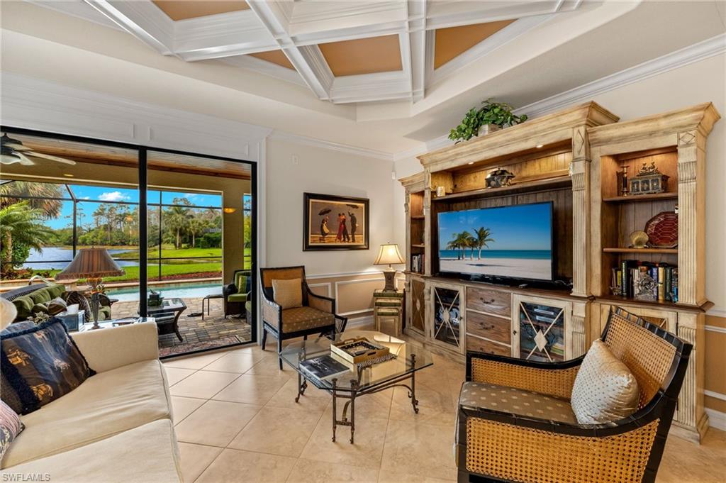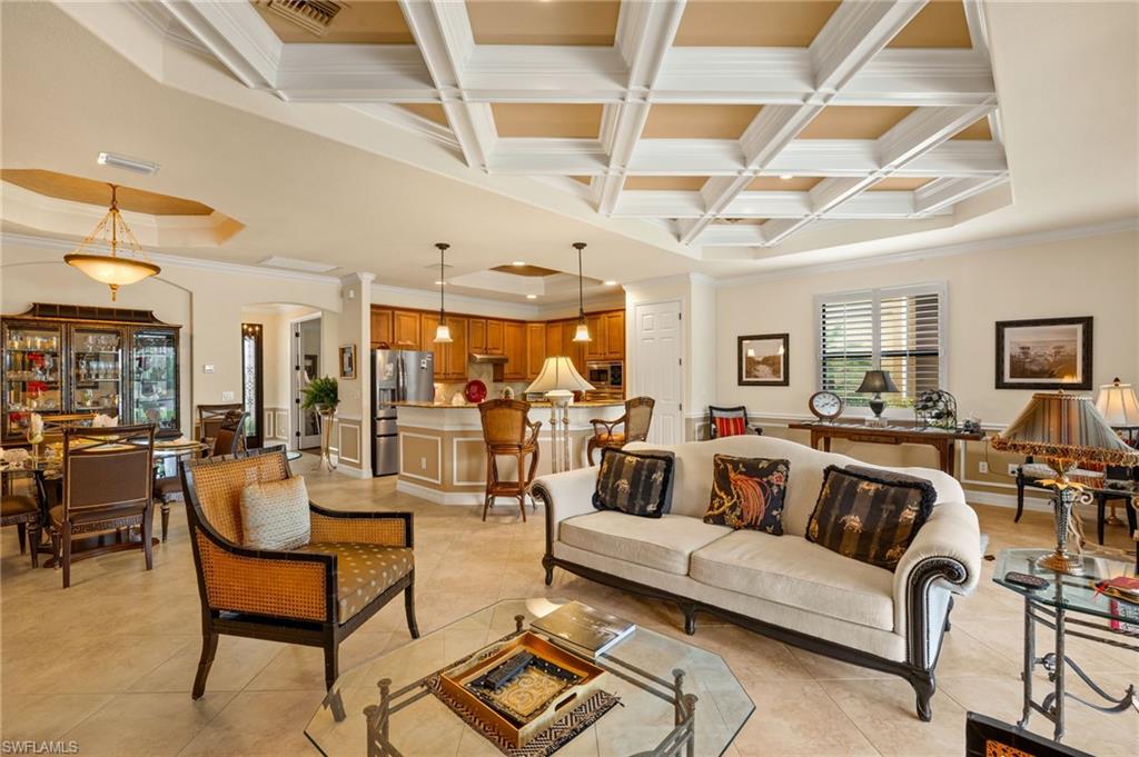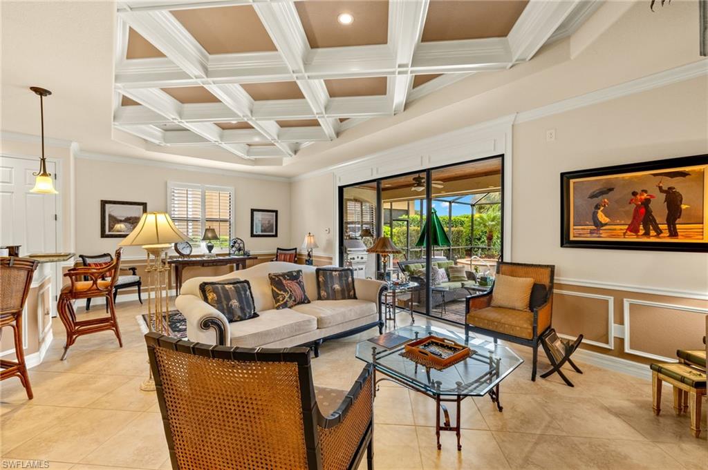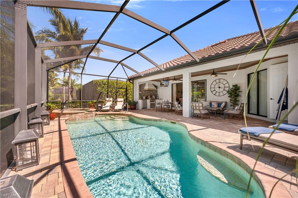 From the moment you arrive, the home’s inviting curb appeal and impact-resistant glass entry door set the tone for what lies beyond — a bright, open interior brimming with natural light and refined architectural touches. The entryway opens to soaring coffered ceilings, crisp wainscoting, and a welcoming layout that blends timeless design with modern sensibility. The kitchen, a true focal point of the home, features sleek white cabinetry, gleaming quartz countertops, and upgraded appliances — perfect for both everyday living and entertaining guests. The seamless transition from the indoor living area to the outdoor oasis through wide glass sliders creates the ideal Florida flow. Outside, a private retreat awaits. The screened lanai is complete with a built-in outdoor kitchen, a sparkling pool, and a rejuvenating spa — all framed by lush tropical landscaping for privacy and tranquility. Whether hosting friends for cocktails or enjoying a quiet evening under the stars, this is the ultimate Naples lifestyle setting. As part of Treviso Bay’s coveted social membership, residents enjoy access to the exclusive Villa Rilassare club, offering a resort-style lagoon pool, lap pool, poolside restaurant and bar, luxurious spa, fitness center, and courts for tennis, pickleball, and bocce. The TPC golf clubhouse provides additional dining, events, and community gatherings that make Treviso Bay one of Naples’ most sought-after communities. Located just five miles from Naples’ renowned white-sand beaches and the upscale shopping and dining of Fifth Avenue South, this exceptional property combines comfort, elegance, and an unbeatable location. It’s more than a home — it’s your private piece of paradise.