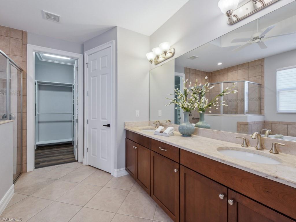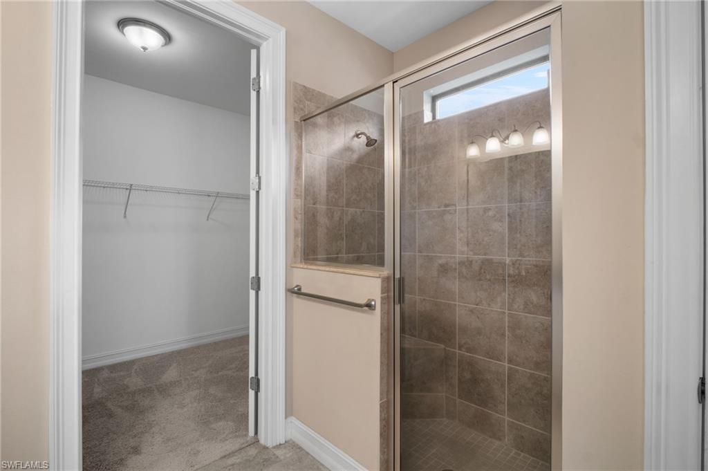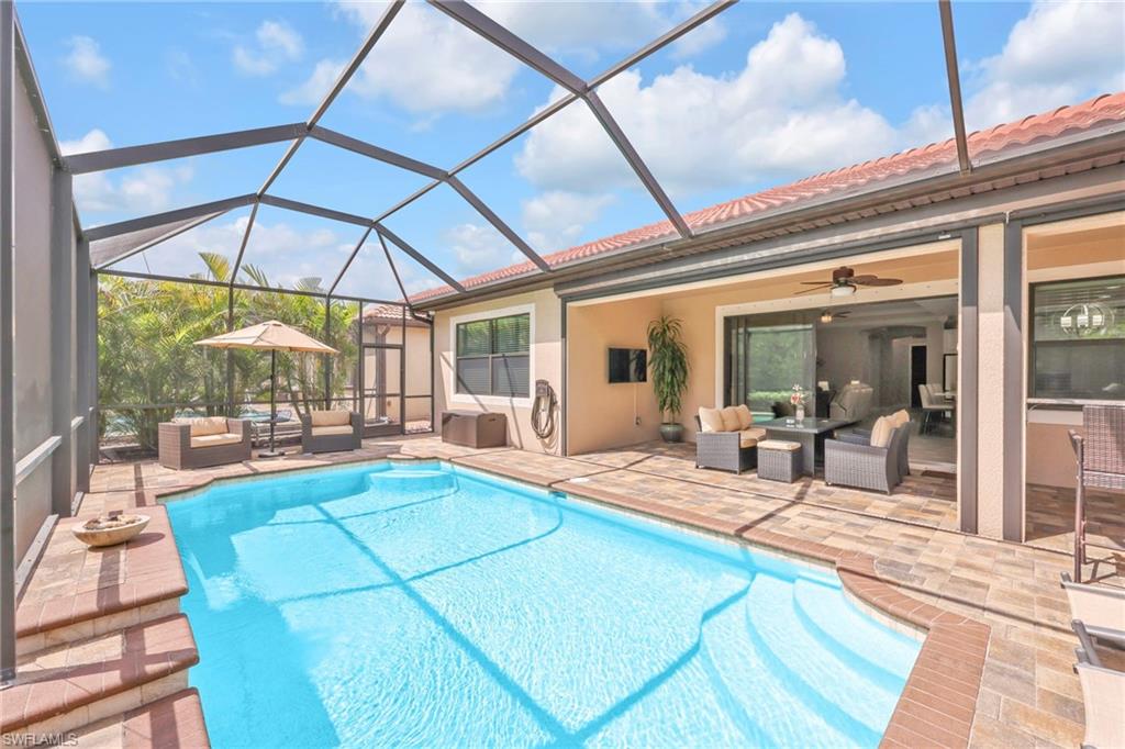 Nestled in the peaceful enclave of Tuscany Pointe in North Naples, this beautifully upgraded 3-bedroom plus den, 3-bathroom pool home offers a perfect blend of style, functionality, and modern comfort. Thoughtfully designed for easy living, the home features a spacious first-floor primary suite with new carpeting, a versatile bonus loft upstairs, and a well-appointed den ideal for a home office or additional guest space. The gourmet kitchen is a true centerpiece, showcasing elegant Cherry Bordeaux cabinetry, granite countertops, and modern appliances, including a brand-new refrigerator and dishwasher. The open-concept living area is enhanced by a custom-built 177-inch cabinet and counter system under the TV, adding both sophistication and practicality. Every closet throughout the home has been upgraded with California Closet systems, ensuring effortless organization, while the permanent shelving in the garage provides smart storage solutions. Additional highlights include an ADT security system for peace of mind and a cleverly designed dry wine closet and bar discreetly tucked into a former coat closet. Step outside to your private oasis, where a heated pool and spa, recently resurfaced for a fresh look and feel, invite relaxation year-round. The large screened-in lanai and spacious backyard provide ample space for lounging, entertaining, and enjoying the Florida sunshine. With pool service, landscaping, trash, and recycling all included in the community, this home offers low-maintenance living in a serene setting—just minutes from the best of North Naples.