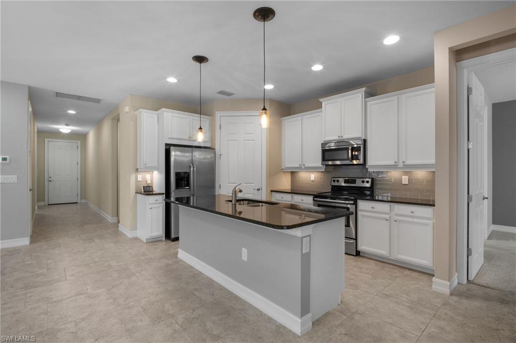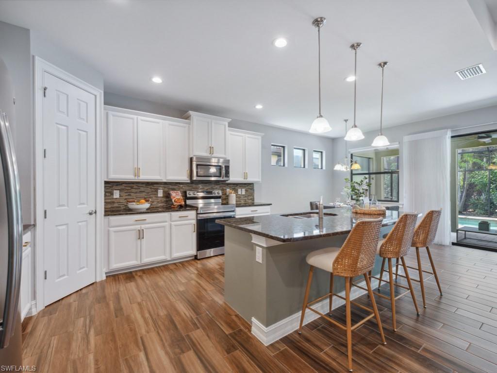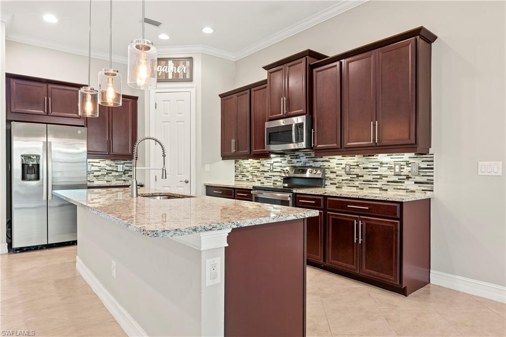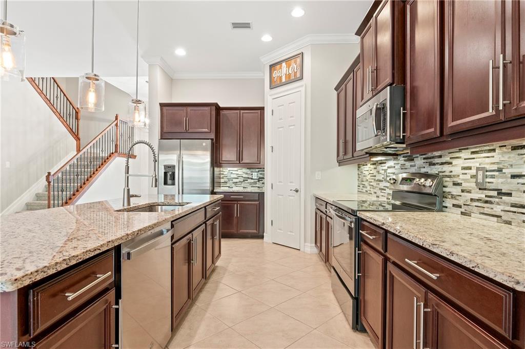 Welcome home! Discover elegance and comfort in this stunning 5-bedroom, 3.5-bathroom home, featuring a spacious 2.5-car garage and a versatile loft. Built in 2016, this 3,609 sq. ft. This "Silverton" floor plan masterpiece blends modern sophistication with timeless charm, perfect for family living and entertaining. As you step inside, the open-concept layout welcomes you with abundant natural light, highlighting a grand staircase that serves as the home’s focal point. Premium vinyl plank flooring and diagonal porcelain tile elevate the ambiance, creating a seamless blend of style and durability. The gourmet kitchen is a chef’s delight, boasting 42-inch cherry java cabinets, sleek granite countertops, and top-of-the-line stainless steel appliances, including a new Samsung Smart glass-top range and microwave. A glass and stone mosaic backsplash adds a touch of elegance, making this kitchen both functional and a work of art. Unwind in the first-floor primary suite, a tranquil haven with a generous walk-in closet and thoughtful design for ultimate relaxation. Upgraded 8-foot hollow core interior doors throughout enhance the home’s luxurious feel. Outside, a brick paver driveway, walkway, and lanai create an inviting setting for gatherings or quiet evenings. The tile roof and manual hurricane shutters ensure durability and peace of mind. With ample space for a pool, you can craft your own backyard retreat! Nestled in the exclusive, gated community of Tuscany Pointe, this home offers a serene lifestyle with low HOA fees. Located in vibrant North Naples, you’re steps away from Founders Square, dining, Publix, Walgreens, and more, all easily accessible by foot or bike. This is more than a home—it’s a lifestyle. Move in and start making unforgettable memories today!