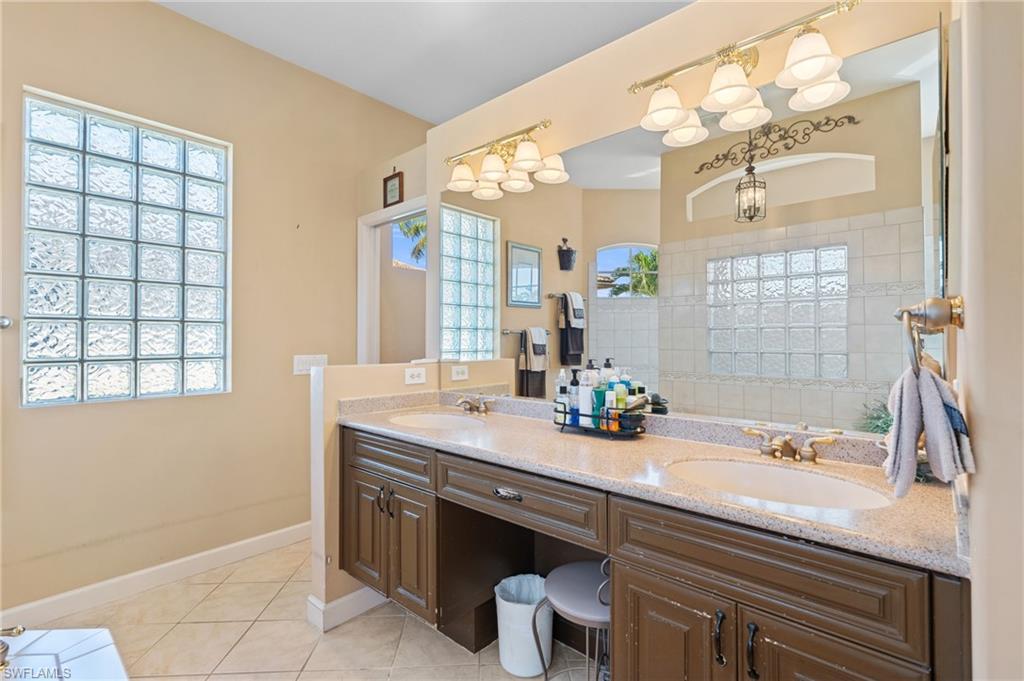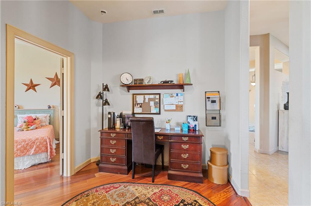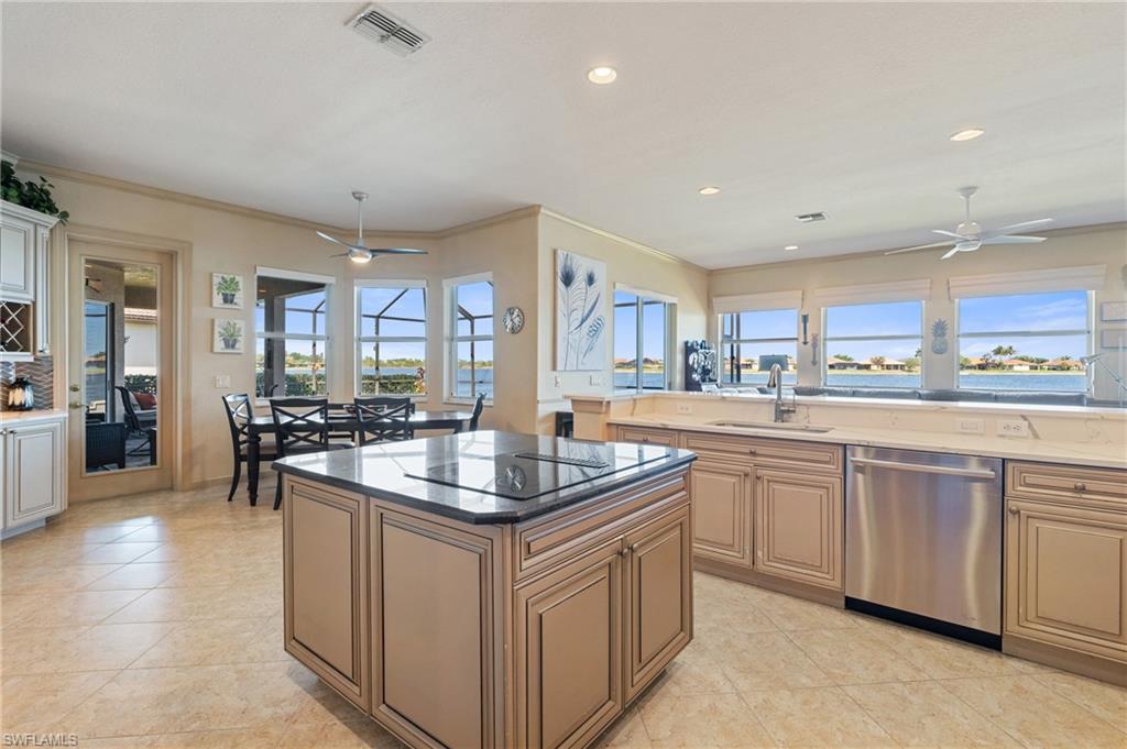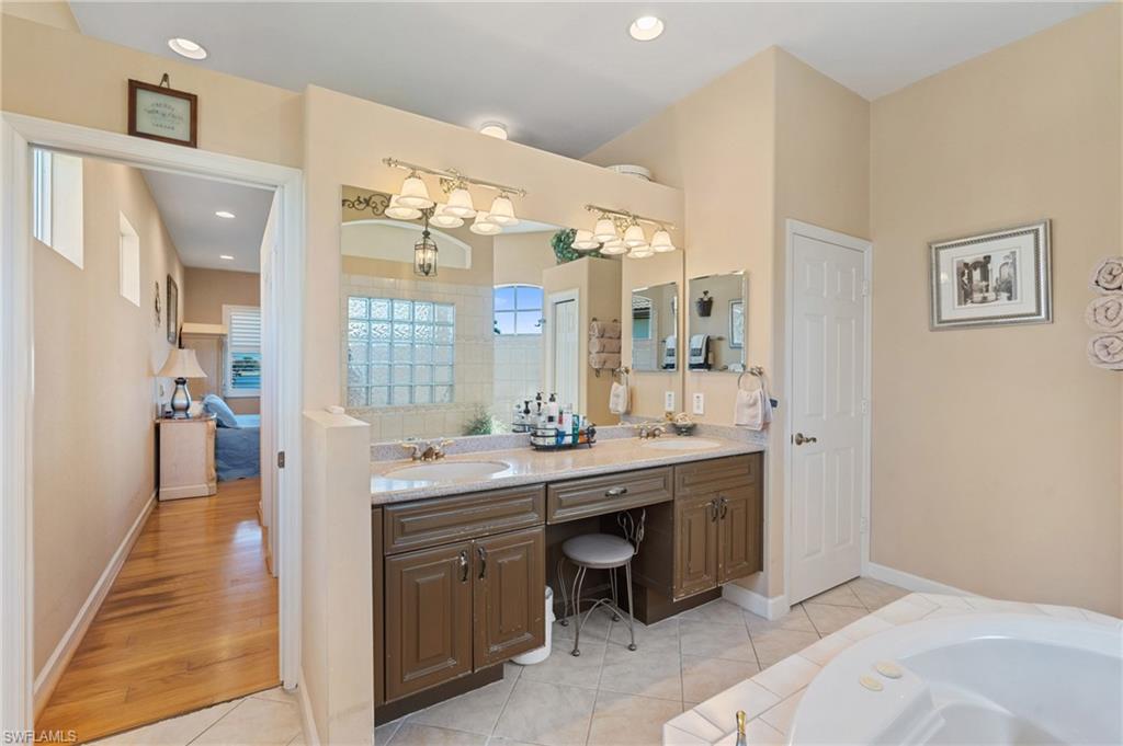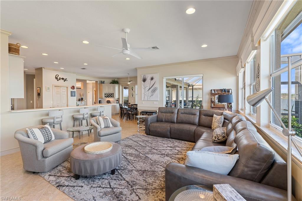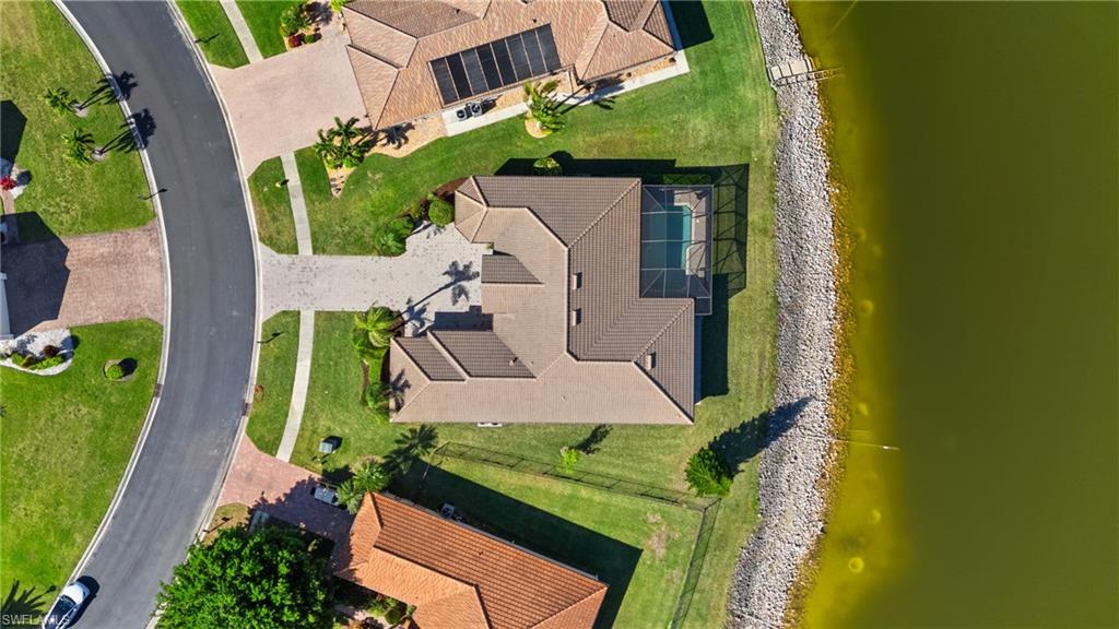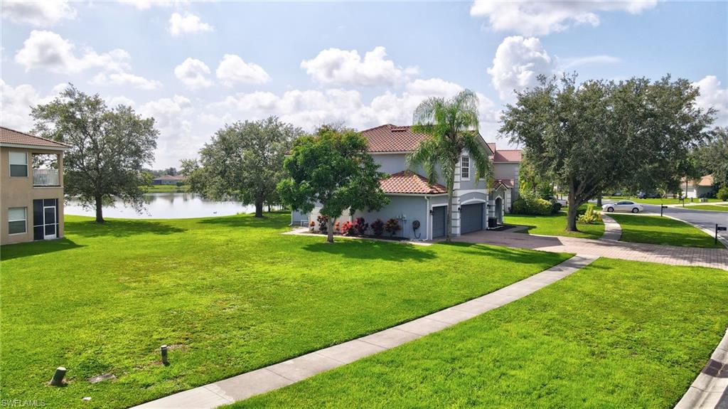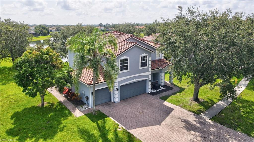 Step through the front door and you’re immediately greeted by 10 foot ceilings, a striking mosaic tile inlay, and an open, airy floor plan that feels both grand and welcoming. The layout is designed for how people actually live today—offering connected spaces for gathering, plus quiet areas for work, guests, and downtime. Just off the main living area, the first-floor den can function as a dedicated home office or hobby room, and can also be utilized as a true first-floor guest suite with an adjoining bathroom—a valuable option for multigenerational living or visiting family and friends. Upstairs, the loft flexes easily as a media room, playroom, fitness area, or second office. Thoughtful details throughout reinforce a sense of comfort, quality, and ease: an oversized 3-car garage for cars, golf gear, and storage; numerous alabaster ceiling fans; window treatments on every window; and plantation shutters in the kitchen and family room that frame the pool and wide lake views. The generously sized lot and landscaping flanking both sides of the pool create a private, resort-like oasis that feels tucked away from neighbors. The large kitchen is intentionally positioned as the heart of the home. An island offers space for prep and casual dining, while granite counters, 42 inch cabinets, a tile backsplash, and abundant cabinet and counter space support everything from quick weeknight meals to holiday gatherings. The kitchen and adjoining family room flow seamlessly to the lanai, where walls of glass invite in natural light and lead your eye straight to the peaceful water view. Upstairs, the spacious primary suite feels like a private retreat. Two walk-in closets provide ample storage, and the en-suite bath features raised dual sinks, a separate shower, and a jetted jacuzzi tub—creating a spa-like place to unwind at the end of the day. Outdoor living is a major highlight. The screened lanai, pool, and raised spa are perfectly oriented with southwest exposure, capturing warm afternoon light and memorable sunsets over the lake. The extra yard space is ideal for pets, gardening, or play, while the wide lake view adds an uncommon sense of openness and tranquility. Valencia Lakes residents enjoy low HOA fees along with a community pool and clubhouse, new Pickleball Courts fitness center, recreation room, children’s playground, basketball court, and tennis court—all in a convenient Naples location close to schools, shopping, dining, and just a short drive to the beaches. Meticulously maintained, generously sized, and set on a premier lakefront lot, 2239 Grove Drive is a compelling opportunity in Valencia Lakes for buyers seeking space, flexibility, and an indoor–outdoor Florida lifestyle. All information is believed to be accurate but is not guaranteed. All measurements, square footage, room dimensions, lot sizes, ages, fees, taxes, school information, HOA rules, and any other details are approximate and/or subject to change without notice