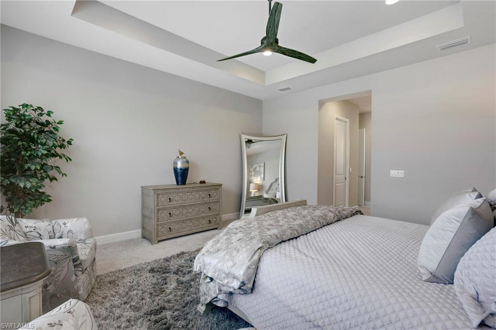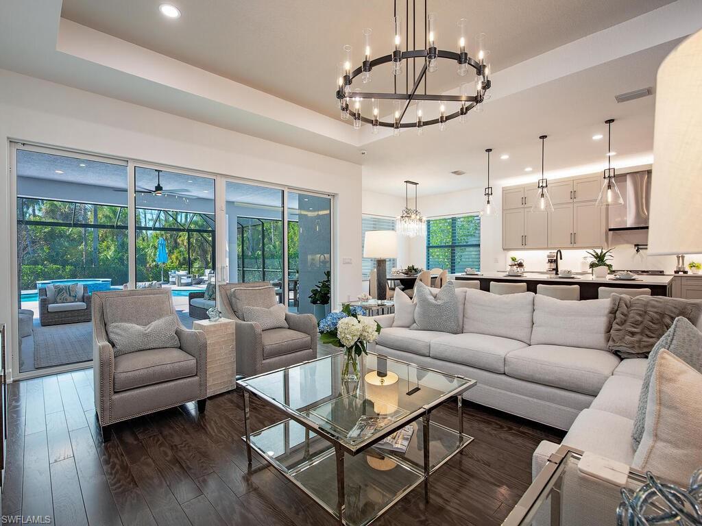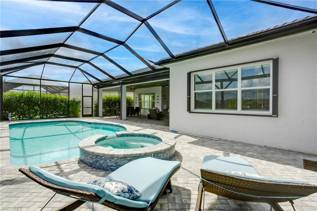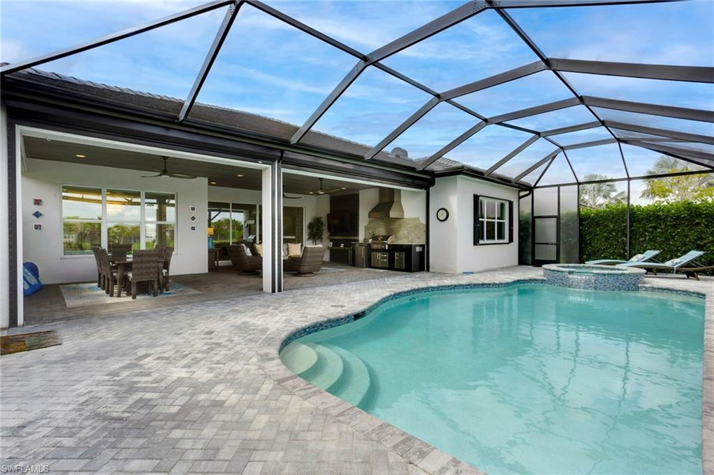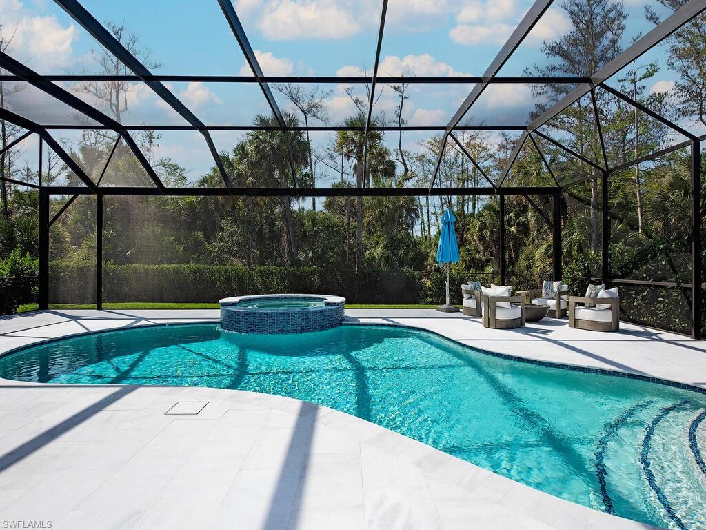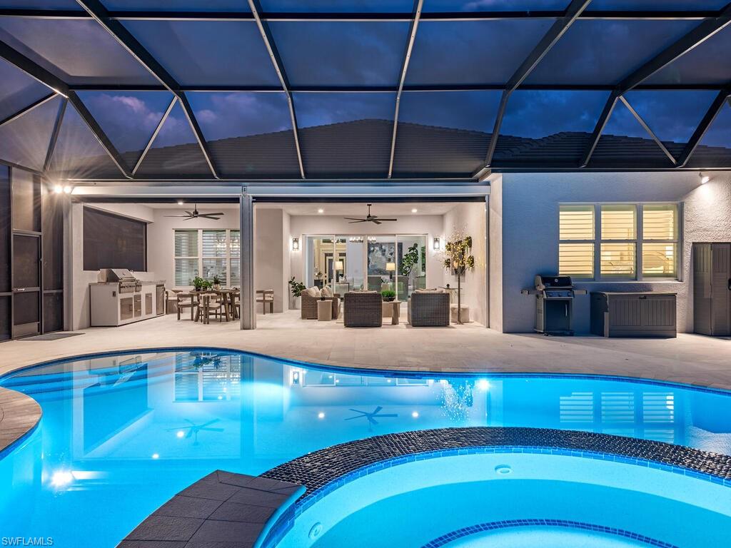 Discover unparalleled luxury in Naples' premier 55+ community, Valencia Trails, with this exquisite Captiva floorplan home, a highly sought-after design by GL Homes. Built in 2023, this newly constructed residence boasts professional decor and nearly every premium builder upgrade available. Situated on one of the largest lots in the community—nearly half an acre—this corner property on a private cul-de-sac street offers both space and serenity. The renowned Valencia Trails clubhouse is just a short stroll around the corner. This expansive home features 4 bedrooms, each with its own en suite bathroom, plus an additional half guest bath for ultimate convenience. Car enthusiasts will appreciate the air-conditioned, extended-length 3-car garage, perfect for your collection. Step outside to the iconic Captiva covered lanai, measuring an impressive 37 x 22 feet, complete with a state-of-the-art summer kitchen and exceptional outdoor living space. The custom saltwater pool and spa create a refreshing daytime oasis and transform into a dazzling nighttime retreat with a lighted spa waterfall and elegant spill-over bowls. Valencia Trails is equipped with natural gas, and this home includes a natural gas cooktop, water tank, and pool heater for added efficiency and comfort.