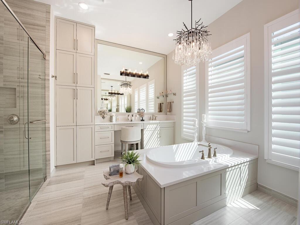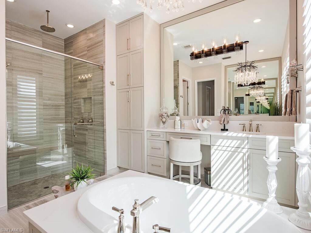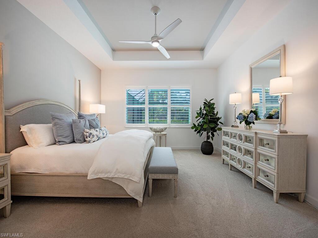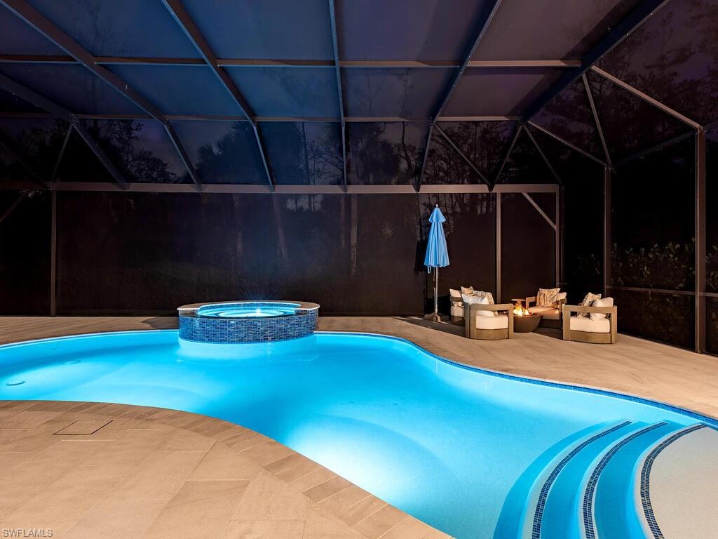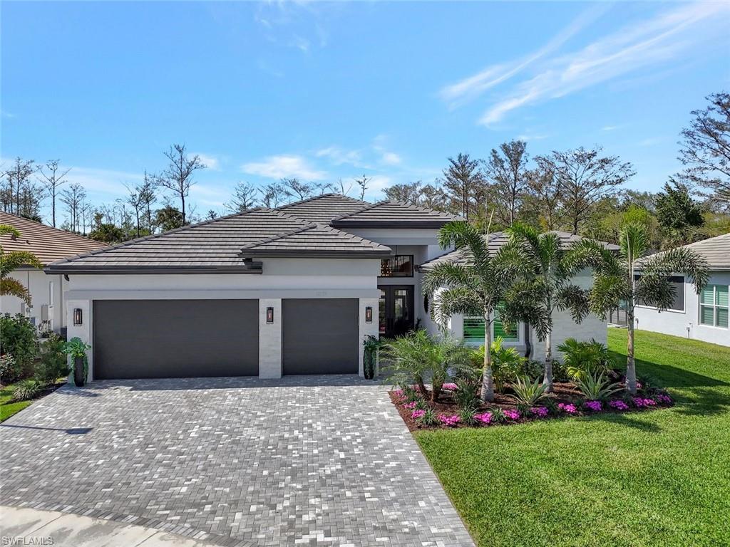 Discover unparalleled luxury in Naples' premier 55+ community, Valencia Trails, with this exquisite Captiva floorplan home, a highly sought-after design by GL Homes. Built in 2023, this newly constructed residence boasts professional decor and nearly every premium builder upgrade available. Situated on one of the largest lots in the community—nearly half an acre—this corner property on a private cul-de-sac street offers both space and serenity. The renowned Valencia Trails clubhouse is just a short stroll around the corner. This expansive home features 4 bedrooms, each with its own en suite bathroom, plus an additional half guest bath for ultimate convenience. Car enthusiasts will appreciate the air-conditioned, extended-length 3-car garage, perfect for your collection. Step outside to the iconic Captiva covered lanai, measuring an impressive 37 x 22 feet, complete with a state-of-the-art summer kitchen and exceptional outdoor living space. The custom saltwater pool and spa create a refreshing daytime oasis and transform into a dazzling nighttime retreat with a lighted spa waterfall and elegant spill-over bowls. Valencia Trails is equipped with natural gas, and this home includes a natural gas cooktop, water tank, and pool heater for added efficiency and comfort.