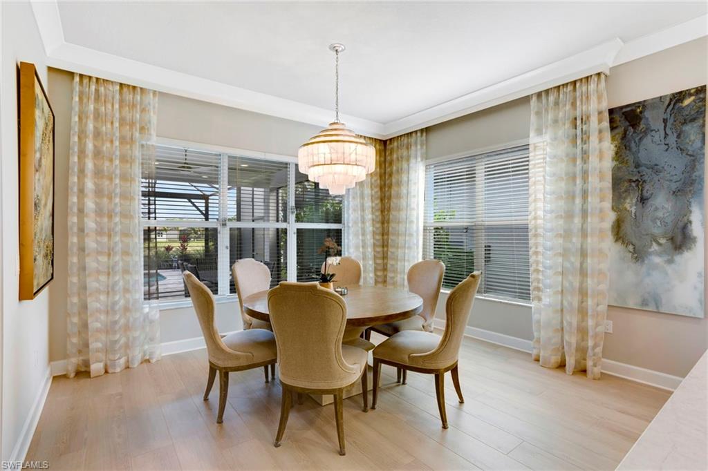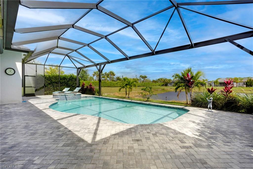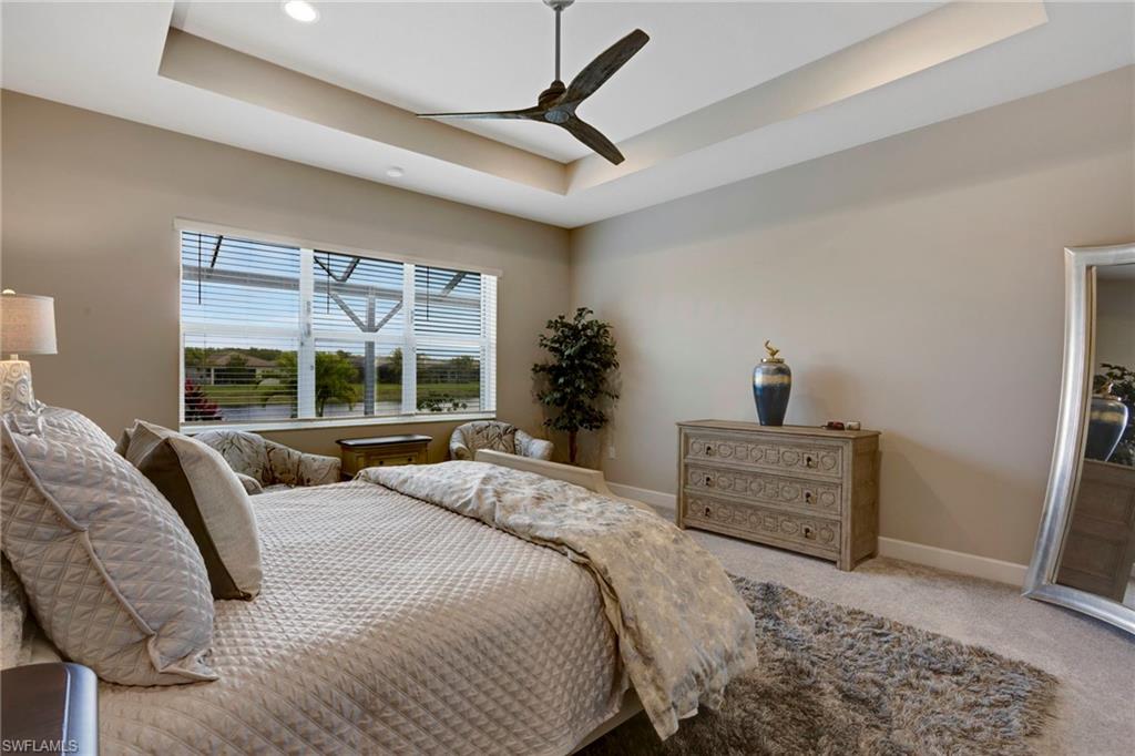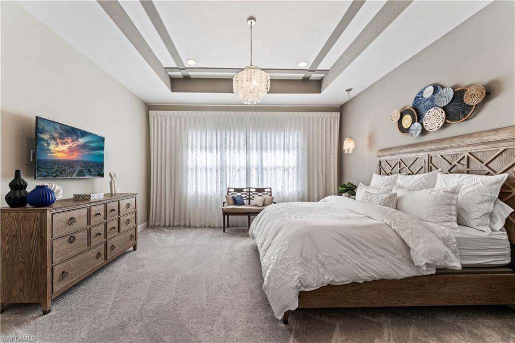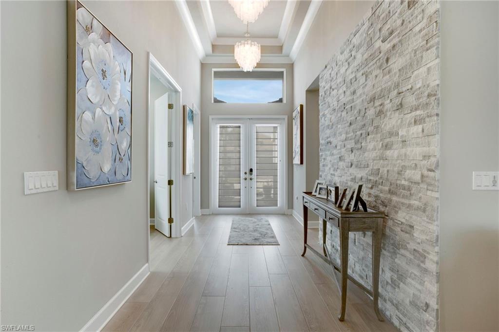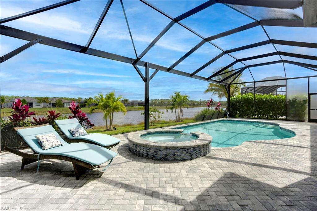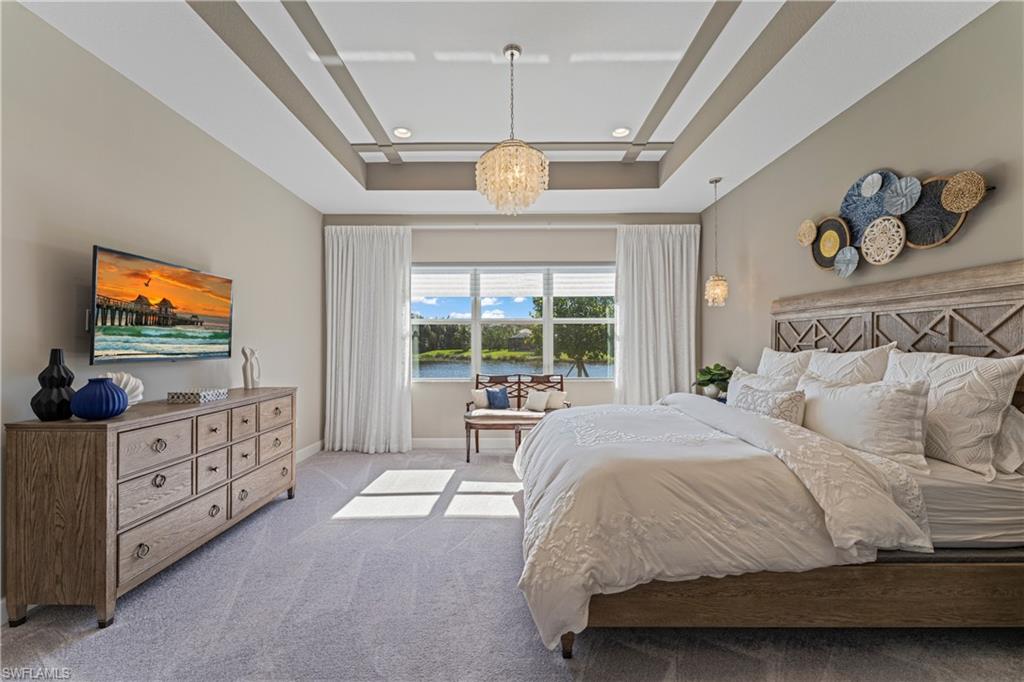 This stunning Sunrise model home offers an unparalleled blend of luxury and comfort in the highly sought-after Valencia Trails, Naples’ premier 55+ community. From the moment you step inside, the soaring 14-foot ceilings with a custom focal wall create an immediate sense of sophistication. The open-concept design seamlessly connects the kitchen and living areas, making it ideal for everyday living and elegant entertaining. The combination of luxury vinyl flooring throughout and cozy carpeting in the bedrooms ensures both style and comfort. The chef’s kitchen is a true showpiece, featuring quartz countertops, quartz backsplash, a natural gas stove, instant hot water, premium stainless steel appliances, an upgraded pantry, upgraded from cabinets to drawers, and pullout trash bins. Cabinetry with soft-close functionality and elegant molding adds a touch of refinement, while ample recessed lighting enhances the space. Just outside the glass sliding doors is an outdoor oasis retreat, complete with an extended covered lanai, private saltwater pool with gas heater, outdoor kitchen, pool cage, and breathtaking views of the pond. For peace of mind, the home has security cameras and an alarm system. Whether you’re enjoying a quiet morning coffee or hosting guests for an evening gathering, this tranquil retreat offers a seamless blend of indoor-outdoor living. Beyond your doorstep, Valencia Trails offers world-class amenities designed to enhance an active and social lifestyle. The impressive 43,000-square-foot clubhouse features a full-service restaurant and bar, a state-of-the-art fitness center, a full-service salon and spa, and multiple recreational spaces, including card rooms, an art studio, and a learning kitchen. For those who love outdoor activities, the community boasts a resort-style pool, a lap pool, a resistance pool, six tennis courts, eight pickleball courts, and scenic walking and biking trails. Even your four-legged companions will feel at home with two dedicated dog parks. This is more than just a home—it’s an opportunity to embrace a luxurious, resort-style lifestyle in one of Naples’ most exclusive communities. Homes like this are rare, and demand for Valencia Trails continues to grow. Don’t miss your chance to own a piece of paradise. Call today to schedule your private tour and experience the elegance, comfort, and breathtaking lake views for yourself."