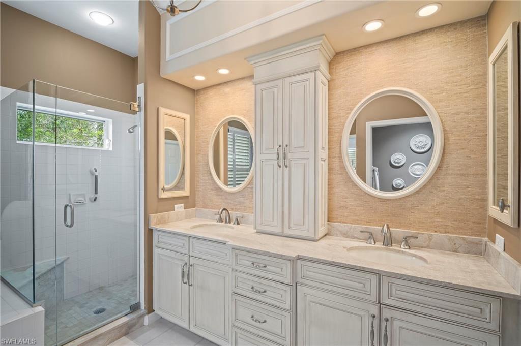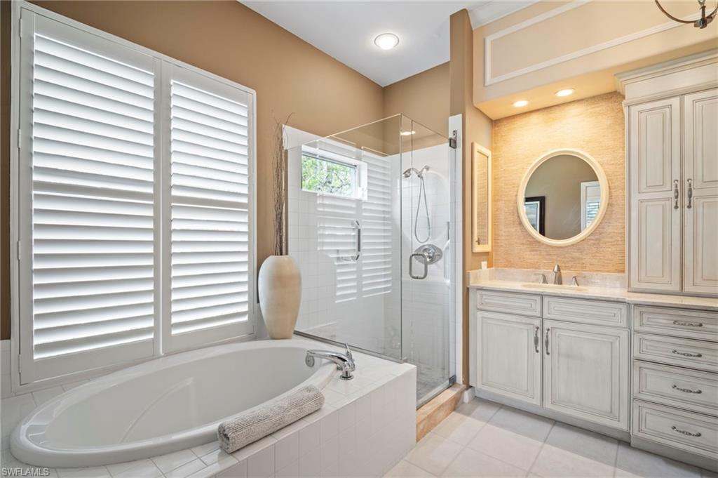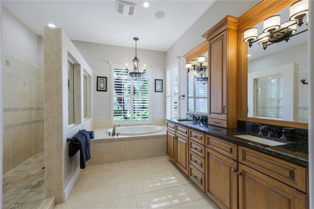 Enjoy your lanai oasis surrounded by mature landscaping, lakeview and distant tee boxes of the second hole in this amazing bundled golf community. This serene setting enhances the indoor and outdoor living experience with a covered outdoor living space with extended canopy, and multiple sitting areas with firepits. The heated salt water pool has a sitting shelf and an adjacent hot tub creates a zen atmosphere. This four bedroom turnkey home offers a split bedroom floor plan for privacy and has all the bells and whistles. Perfect for entertaining with spacious rooms, volume ceilings and appointed with crown molding, plantation shutters, built in cabinetry, upgraded lighting, fans and arched doorways. The kitchen is a chef's dream with oversized granite island, backsplash with design, stainless steel farmers sink, double wall oven, electric cook top and wine fridge. The livingroom has slider doors to the lanai to enhance your indoor-outdoor living experience. The primary bedroom suite offers direct lanai access, walk in closets, oversized walk in tiled shower, soaking tub and double sinks. Additional bedrooms are spacious, ensuite baths and pool bath with tiled walk in shower also has custom countertop. The garage has a golf cart access door, built in shelving and cabinetry and portal generator and the home has hurricane shutters. Vanderbilt Country Club is an active bundled community that has exceptional amenities, offering a resort pool, 3 satellite pools, casual and formal dining, clubhouse, stand alone fitness facility with daily classes, tennis and bocce. With golf and tennis clinics, you will improve your game!