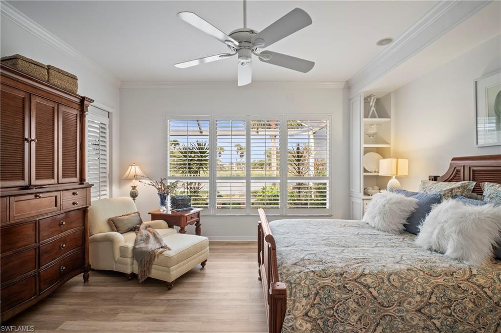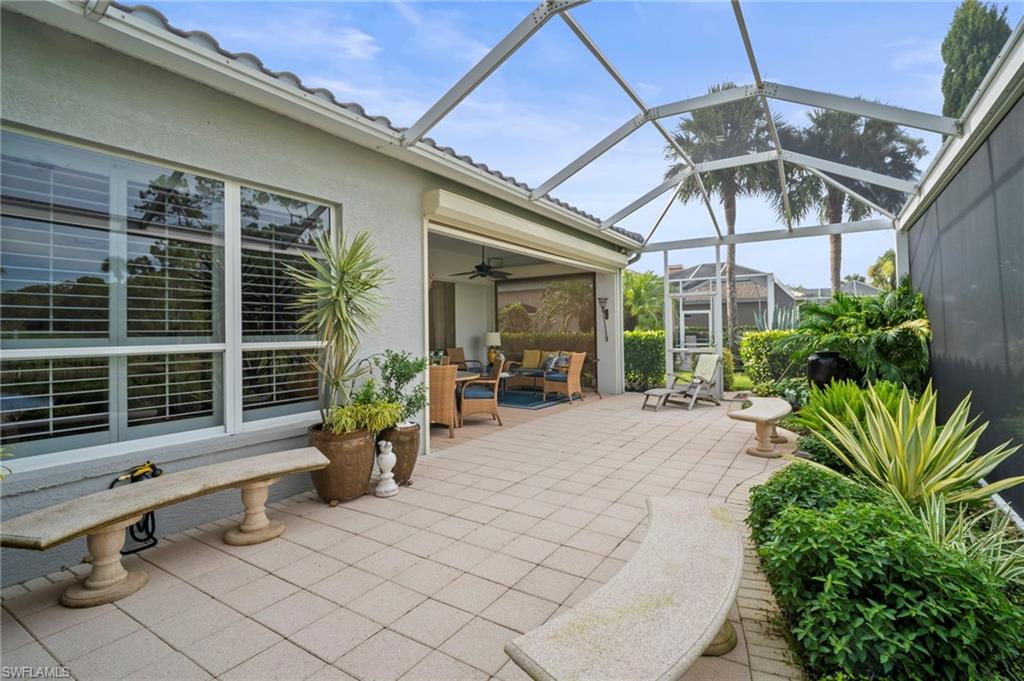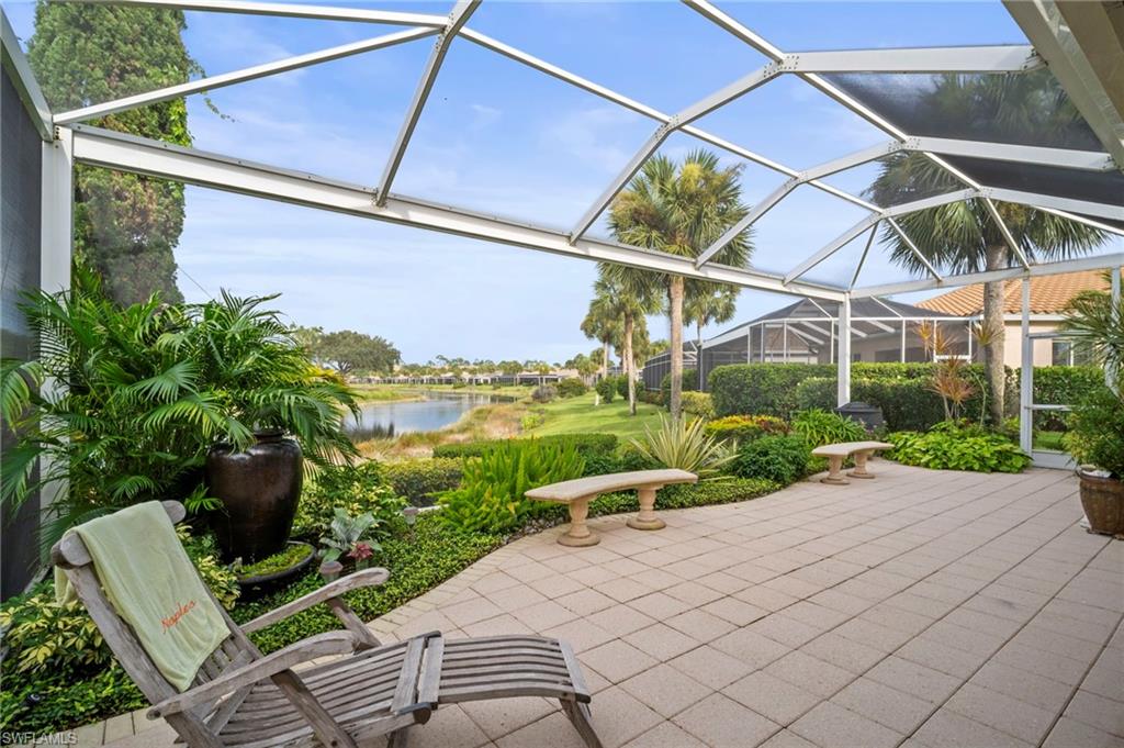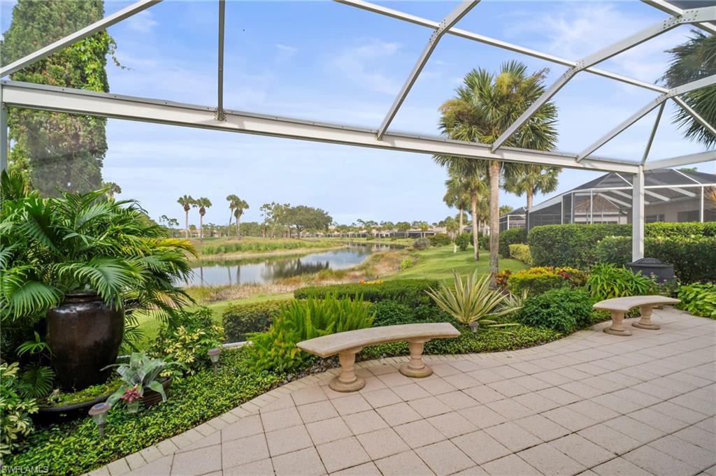 This is the sought after AUGUSTA floorplan. We call it VILLA BELVEDERE (“beautiful view”) with the spectacular and unequalled “Million Dollar “ view of the meandering lake waters and golf course . Here on your LANAI is where you will enjoy incredible sunrises over the 12th hole while sipping your morning coffee. The BREAKFAST NOOK in KITCHEN features a custom designed banquette with extra storage space as well. GUEST BATH is updated with custom cabinetry topped with Carrara marble and white Subway tiled Shower . Toilet fitted with LUXE Bidet MASTER BEDROOM features on either side of the bed custom built-in bookshelves and cabinets . CALIFORNIA CLOSET in MBR maximizes every inch of space . MASTER BATHROOM has custom cabinets topped with Travertine Marble (not granite) A wall of Travertine forms the counter to ceiling height backsplash . The bathroom contains a soaking tub and tiled glass enclosed shower . Toilette fitted with LUXE Bidet. OFFICE/DEN contains an endless amount of cabinet space and display bookshelves . A custom made file cabinet allows for a slide out printer shelf and slide out paper shredder . HOME TECH Service contract for appliances is transferable and includes Dishwasher, Garbage disposal, Refrigerator, Range, Washer & Dryer, Microwave, Hot Water Heater, AC. Extended warranty expires 2028. Full house sound system with ceiling speakers in Den, MBR, LR, and Lanai. FRONT DOOR is equipped with a Phantom Screen which allows for cross ventilation. Landscape Architect designed LANAI GARDEN features custom made Garden Benches and automatic irrigation system. The LANAI has a Motorized retractable Hurricane screen effective up to winds of 150 mph. Rain or shine, you can enjoy the lanai year 'round. These screen shutters retain about 75% of the air conditioning. Power outages are a thing of the past, thanks to the newly installed "$20,000 WHOLE HOUSE GENERAC GENERATOR