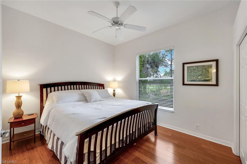 Full golf membership included with purchase and green fees for two members are covered by HOA fees. This 3 bdm villa home has an updated open concept kitchen, luxury wood flooring and fresh paint throughout. The sunny lanai offers a wide open sunset view overlooking the 3rd hole tees, a lake and the 2nd hole green. The oversized lanai offers a large covered seating area and plenty of additional outdoor space with picture window screening for a more open view. There is plenty of room to add a pool if desired. The large living space opens directly to the lanai with wall to wall sliders that open up fully. Vanderbilt Country Club is a premier bundled golf community that is financially stable and very social with extensive and updated resort-like amenities. The main Clubhouse and the Terrace Cafe and Bar at the pool offer many dining options. The 5100 sq ft Fitness Center has a 2200 sq ft gym with state of the art equipment and personal training. The facility also houses a large exercise room with many fitness classes as well as treatment rooms for physiotherapy, massage and facial services. There is an large tennis community with six lighted Har-Tru tennis courts. Bocce courts have recently been added to the newly built pool area. Pickleball also has active participation and plans are in the works to expand those facilities.