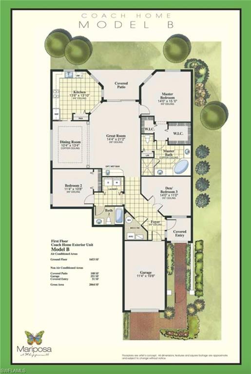 Exceptional Value! One of the most affordable units in Mariposa! Seize this rare chance to own this chic 2+Den bedroom, 2-bathroom coach home with an attached 1-car garage in a prime North Naples location. This gated treasure is steps from shopping, dining, I-75, beaches, and Physician's Regional Hospital. The inviting first-floor unit is offered with Furnishings Negotiable, meticulously maintained, and features granite countertops, tray ceilings, updated tile flooring, dual closets, and more! Enjoy a convenient, stair-free layout, situated directly across from the community pool and fitness center. Move-in ready!