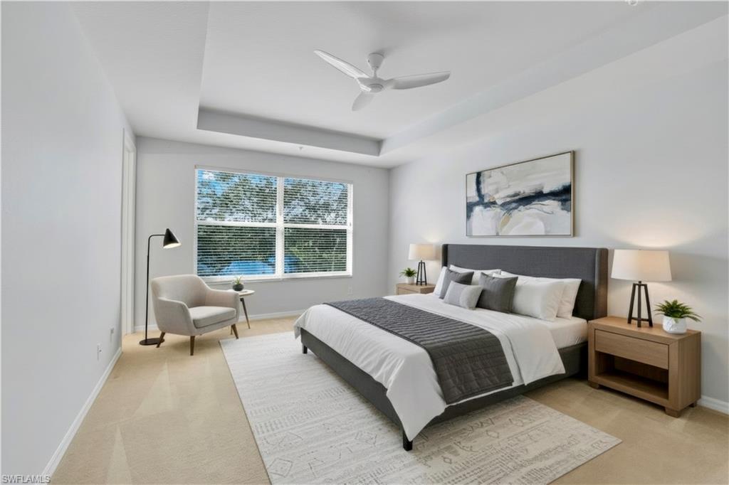 This spacious 2334 sq. ft. townhome features three bedrooms, two-and-a-half baths, 2 car garage and a large loft to fit your needs. The laundry room is on the second floor for convenience to the bedrooms. The well-laid-out first floor features the kitchen with plenty of white cabinetry and new stainless steel appliances with breakfast bar overlooking the eat-in kitchen and great room. In addition there is a formal dining room for entertaining. Enjoy the long lake view and beautiful sunsets from your lanai. You will have peace of mind with Impact Hurricane Windows. This home features very neutral colors so you can add your own decorating and color palettes. Mariposa is a small gated community with only 180 homes and is centrally located with access to Livingston Road and shopping. The community features community pool, clubhouse, and exercise room. Great value in a premier location.