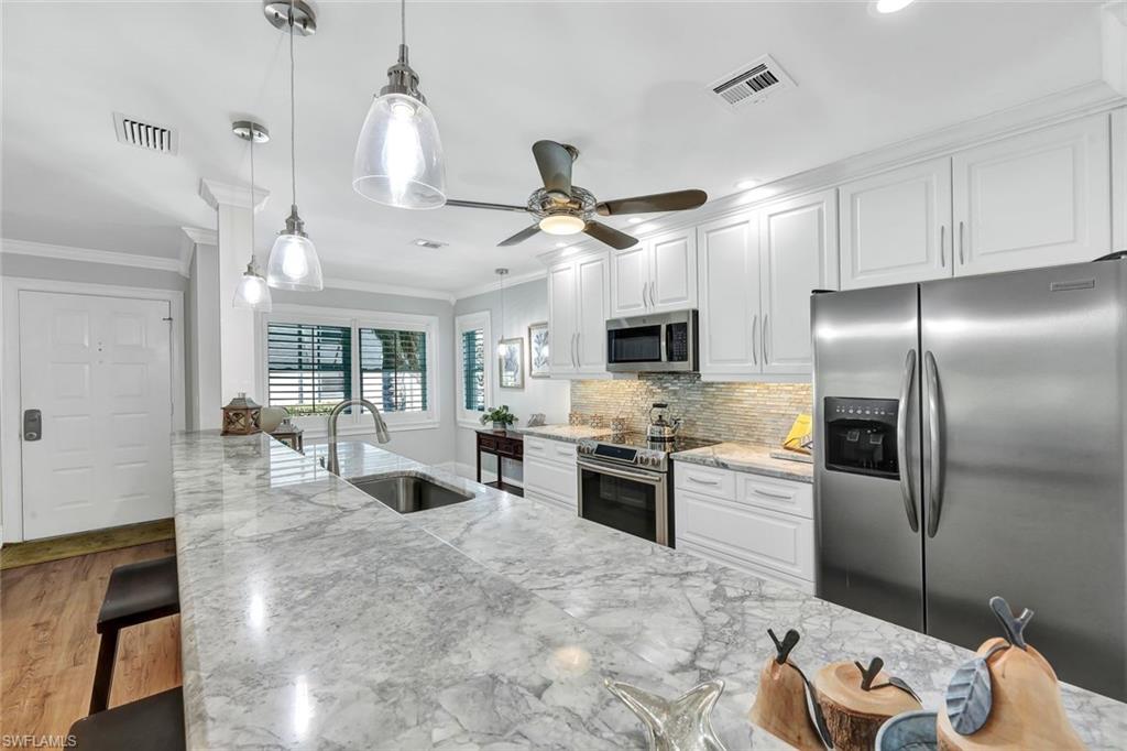 PRICE REDUCED! SLLER SAYS SELL! Just minutes away from the Gulf of Mexico, this rarely available spacious 2 Bedroom plus den, end-unit has been beautifully renovated and offers a fabulous open living plan that seamlessly flows from the front of the home out onto your oversized screened lanai. Offered TURNKEY, this home is ready for new owners with a redesigned and renovated light, bright and open kitchen with off white shaker cabinets, quartz countertops, undermount sink, and new appliances including a slide in range and extra storage galore! The master bathroom (2 yr old) offers a walk in shower, undermount dual sinks with light quartz & neutral cabinetry. The 2nd bath offers newer cabinets and quartz tops. NEW TRANE A/C (May 2025)Flooring was updated to LVP flooring throughout making this home move in ready.. IMPACT WINDOWS & DOORS have been installed allowing for peace of mind. Bermuda Cove at Wiggins Bay features a community pool, spa & bbq area. Just walking distance away to Vanderbilt Beach, public boat launch, Gulf Shore Dr as well as Mercato & much more! An optional membership at the Tarpon Cove Yacht Club provides a luxury resort lifestyle right inside Wiggins Bay, A private beach shuttle, clubhouse w/poolside bar, fire pits, dining, bocce ball, tennis, fitness center & members have reciprocal golfing and club privileges.