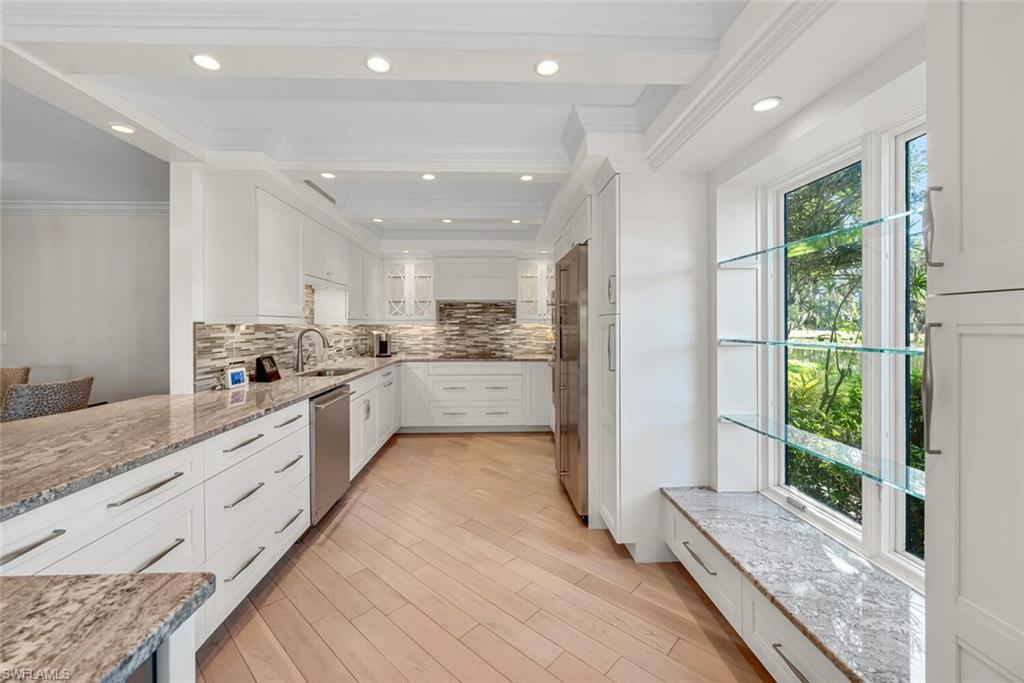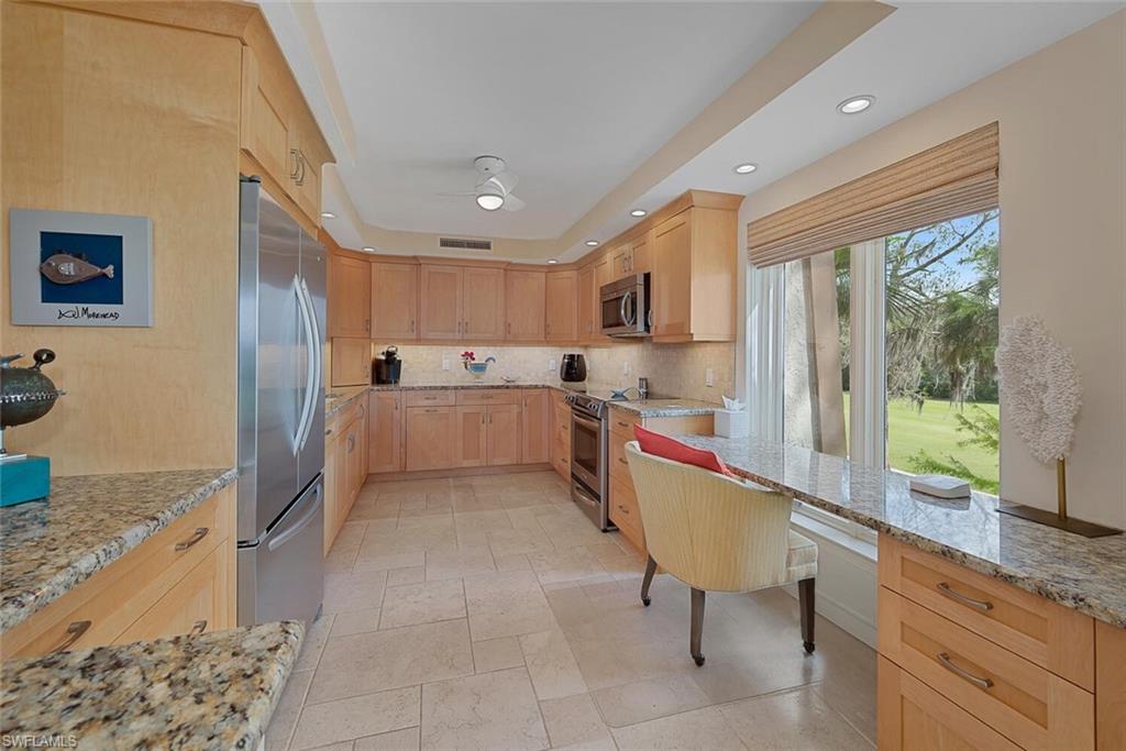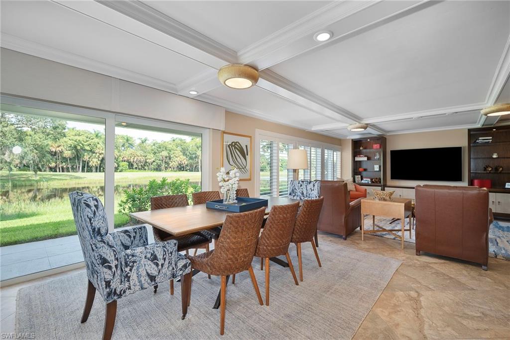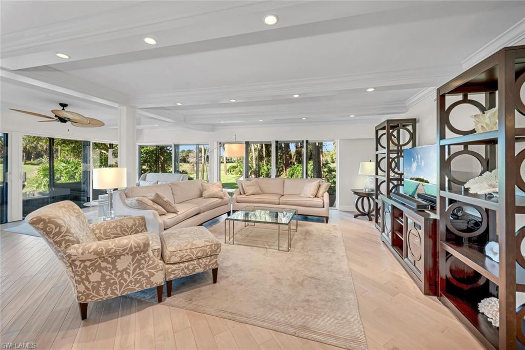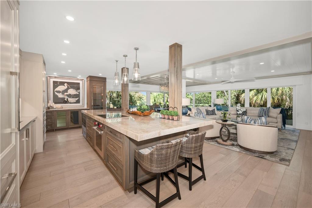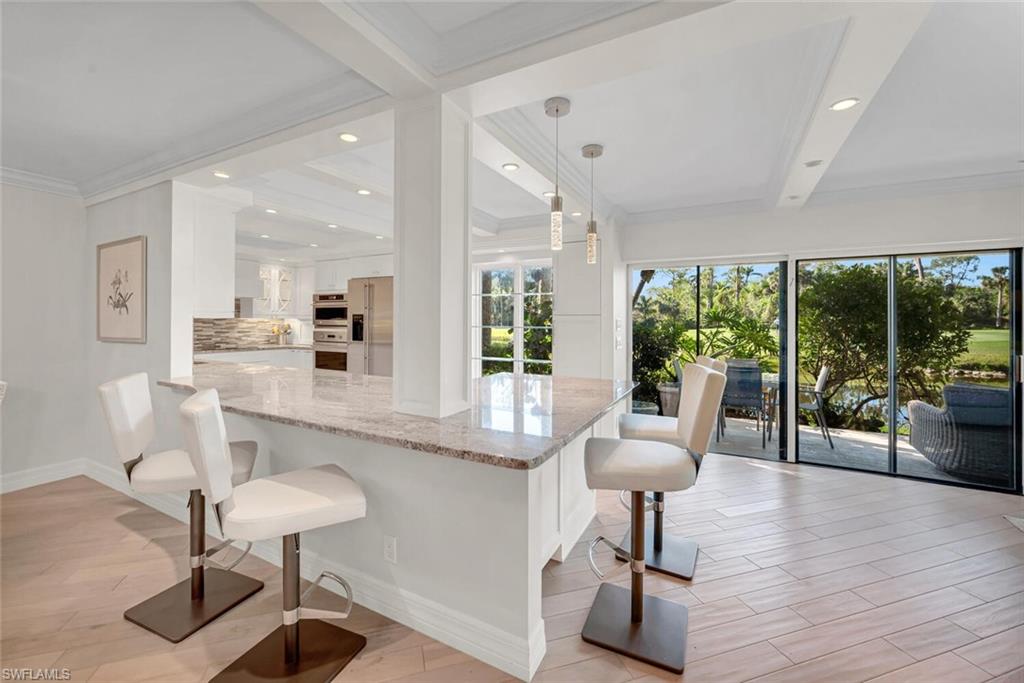 This coastal contemporary home features a fully remodeled open-concept design, enhanced by natural light, pristine flooring, and custom trim work and ceiling treatments. The kitchen includes extended Quartz countertops, Bosch stainless steel appliances, and contrasting white Shaker-style upper cabinets with dove grey lower cabinets. A wine cooler is included for convenient entertaining, with views overlooking the 18th hole and western exposure. Kitchen and bathrooms have been updated with new cabinetry, counters, and wood-look tile flooring runs throughout. The master bathroom offers expanded closet space and custom built-in features for added storage. The property includes a golf cart garage, covered parking, and a newer golf cart. Furnishings are negotiable for flexible move-in options. Wilderness Country Club offers an 18-hole Arthur Hills golf course within a certified Audubon Cooperative Sanctuary, along with amenities such as bocce, Har Tru tennis courts, Pop-Tennis, croquet, fitness groups, five saltwater pools, a dog park, and a newly rebuilt clubhouse and restaurant. The community is centrally located near Naples’ beaches, shops, and dining. A Wilderness Country Club golf membership is required and available with purchase.