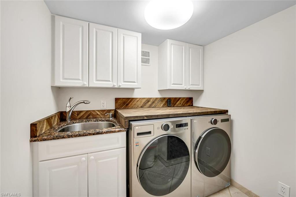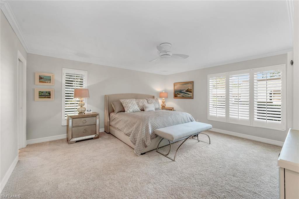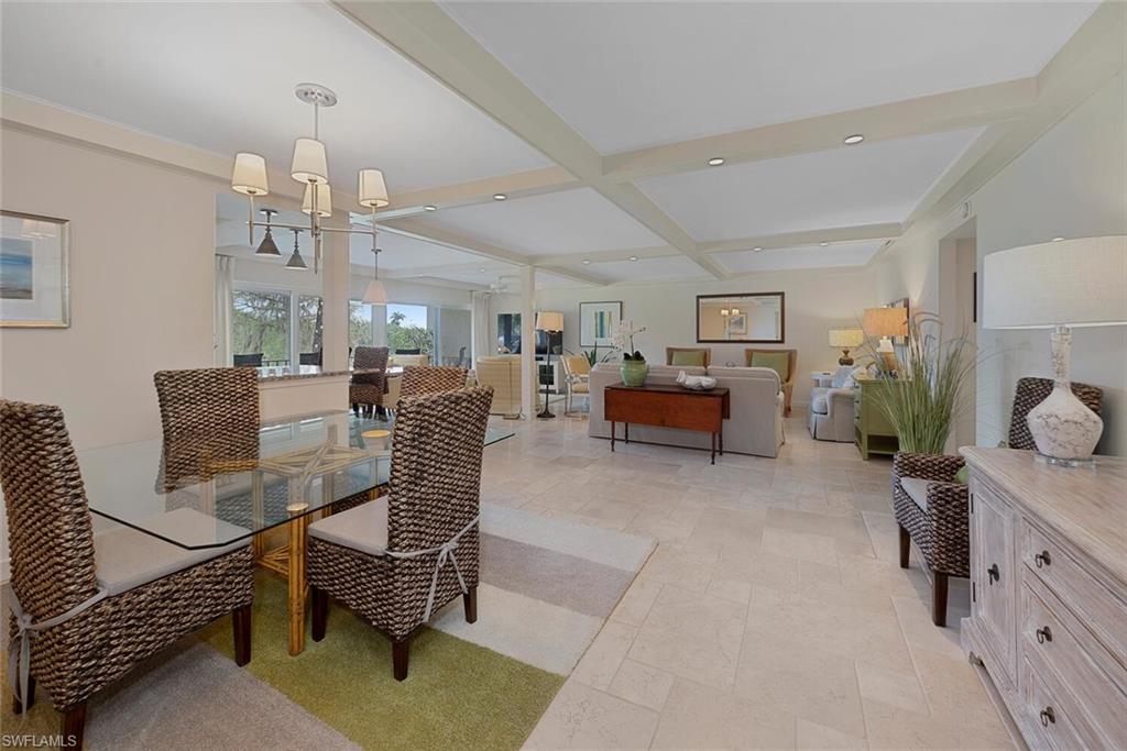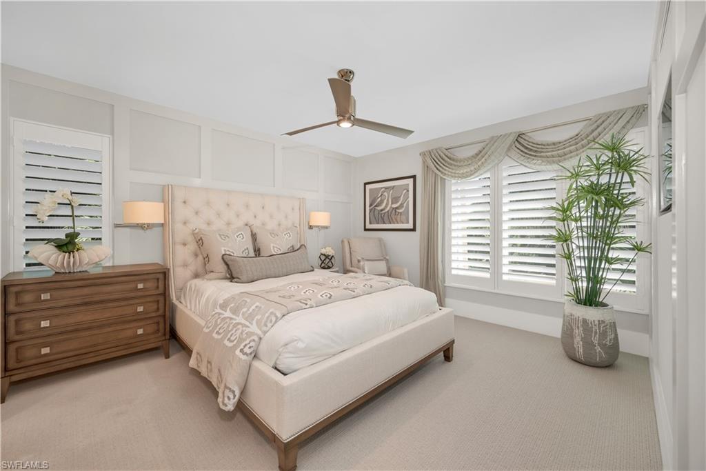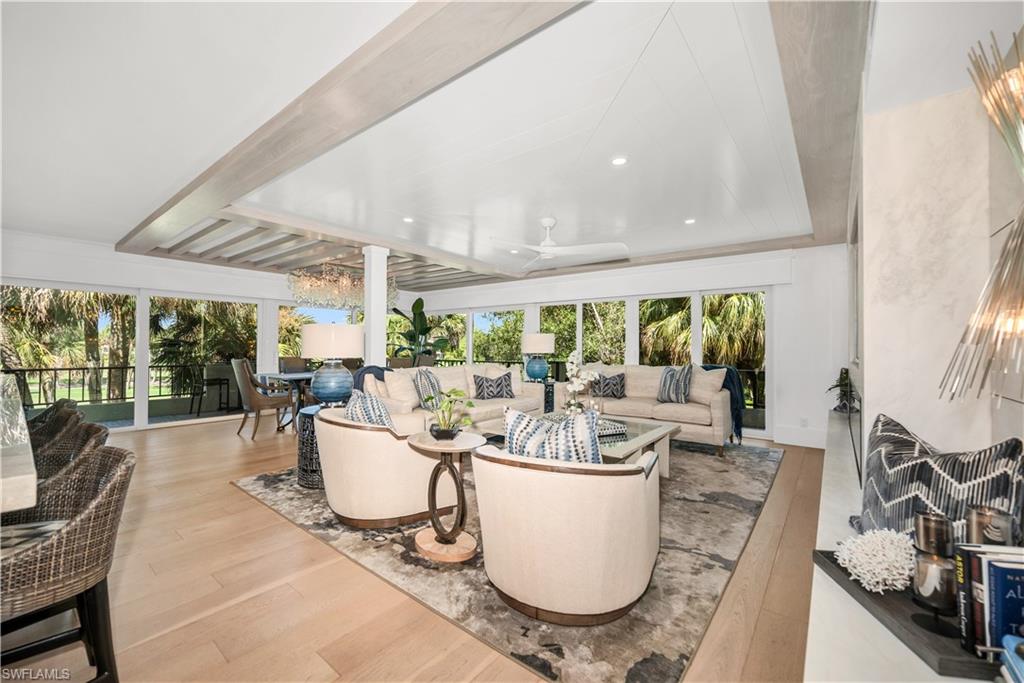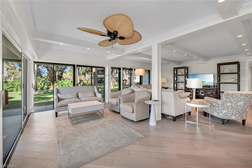 This coastal contemporary home features a fully remodeled open-concept design, enhanced by natural light, pristine flooring, and custom trim work and ceiling treatments. The kitchen includes extended Quartz countertops, Bosch stainless steel appliances, and contrasting white Shaker-style upper cabinets with dove grey lower cabinets. A wine cooler is included for convenient entertaining, with views overlooking the 18th hole and western exposure. Kitchen and bathrooms have been updated with new cabinetry, counters, and wood-look tile flooring runs throughout. The master bathroom offers expanded closet space and custom built-in features for added storage. The property includes a golf cart garage, covered parking, and a newer golf cart. Furnishings are negotiable for flexible move-in options. Wilderness Country Club offers an 18-hole Arthur Hills golf course within a certified Audubon Cooperative Sanctuary, along with amenities such as bocce, Har Tru tennis courts, Pop-Tennis, croquet, fitness groups, five saltwater pools, a dog park, and a newly rebuilt clubhouse and restaurant. The community is centrally located near Naples’ beaches, shops, and dining. A Wilderness Country Club golf membership is required and available with purchase.