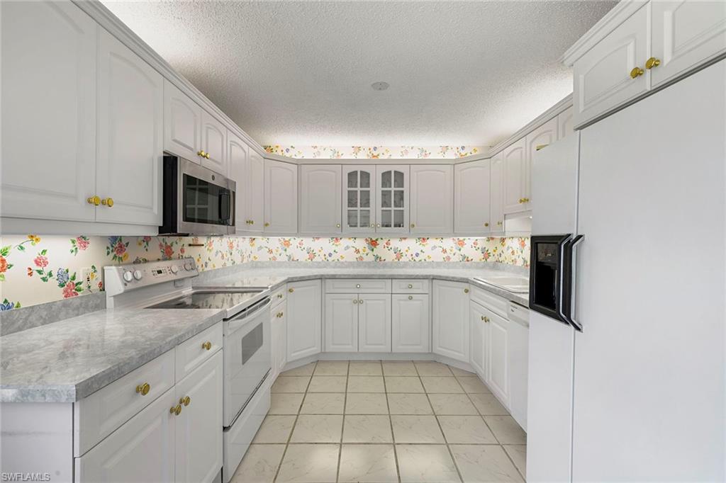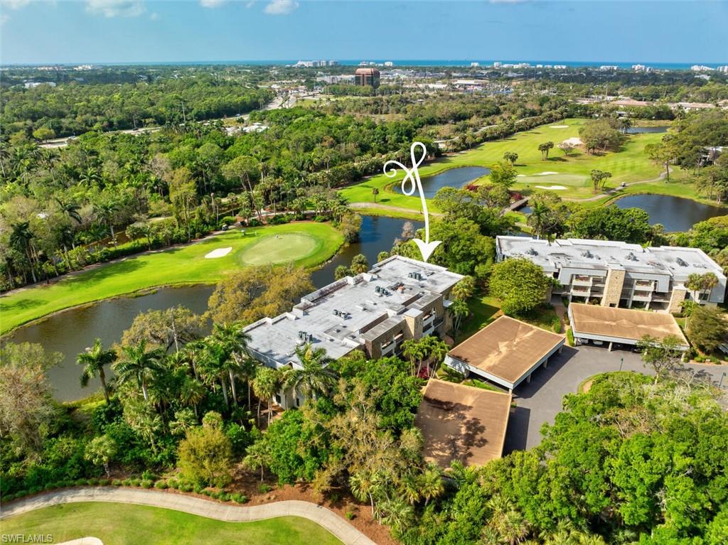 Experience the expansive floor-to-ceiling golf course to lake views of the pristine 2nd hole from your top-floor 2-bedroom stunner with a common elevator. Sold Furnished! Immediate full golf membership at Wilderness with the purchase of this property. This beautifully renovated unit features a light-filled open-concept floor plan showcasing a gourmet kitchen fully upgraded with granite countertops and backsplash, neutral colors, custom built-ins, ivory raised panel cabinetry, impact sliders, and light luxury tile flooring. This residence also features an Expansive Master bathroom with built-in cabinetry, a splendid shower with seamless shower doors, Impressive light fixtures, and a full-size laundry room. Enjoy covered parking, an included golf cart, and a golf cart garage with room for extra storage, too. This gated paradise is situated within a 200-acre forest, boasting stunning landscaping and mature trees lining the roadways. Residents enjoy unlimited access to an 18-hole Arthur Hills course, five Pools, four tennis courts, bocce, croquet, and a dog park. Brand new State-of-the-Art Clubhouse. Just minutes away from the vibrant shopping, pristine beaches, and dining destinations of 5th Avenue and Old Naples. This exceptional condominium offers a lifestyle of luxury and leisure. Purchase of a Wilderness Country Club membership is required and readily available to elevate your living experience.