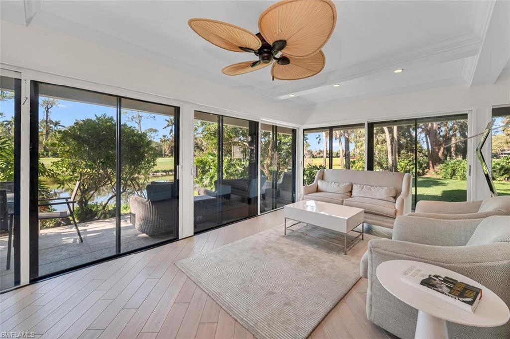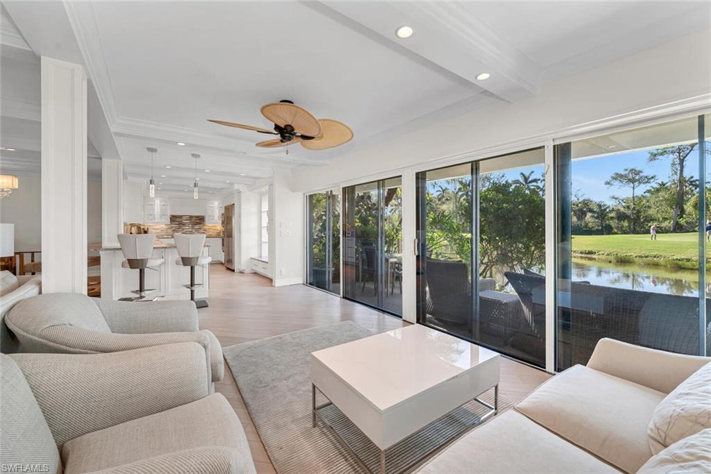 Welcome to this contemporary first-floor end unit with expansive lake-to-golf course views overlooking Wilderness's 18th green. Completely redesigned, this home epitomizes luxury living with its meticulous attention to detail. Seamlessly combines modern elegance, comfort, and warmth. Luxuriate in the exquisite French oak flooring, upscale designer lighting from Serena and Lily in the dining area and an Ed Koehler fixture in the sitting area, neutral-toned countertops, and custom cabinetry in every room, adorning this home with comfort in every detail. The open layout is flooded with natural light from over 40 feet of wrap-around sliders, seamlessly connecting two distinct living areas with the spacious dining room and kitchen. The chef's kitchen has custom cabinets, under-counter lighting, and high-end appliances, raised cabinetry, modern backsplash, and extra storage, including a walk-in pantry, creating an ideal space for culinary creativity. The third bedroom has been converted into a comfortable office with custom glass barn doors, a built-in desk, grasscloth wallpaper, and floating shelves. The elegantly redesigned bathroom showcases double sinks, a frameless shower enclosure, and upscale light fixtures. The patio provides a serene lakefront retreat with generous space for dining and entertaining. Step outside to enjoy covered parking, a golf cart, and a generously sized golf cart garage that provides ample additional storage. Residents have exclusive access to the newly constructed state-of-the-art 5-star Clubhouse and practice facility, making this property a golfer's paradise. A golf cart and dedicated cart garage are included, conveniently located next to your assigned covered parking. Set within a stunning 200-acre gated community, you'll enjoy beautifully landscaped grounds and mature trees lining the roads. This community offers unlimited golf on an 18-hole Arthur Hills course, as well as five inviting pools, four tennis courts, bocce, croquet, and a dog park. This condo is a true gem, just minutes from the vibrant shopping and dining of 5th Avenue and Old Naples. Purchase of a Wilderness Country Club membership is required and immediately available, offering you an effortless transition into this luxurious lifestyle. Don’t miss your chance to make this stunning condo your new home!
