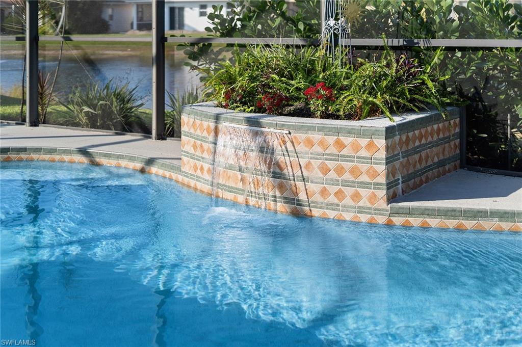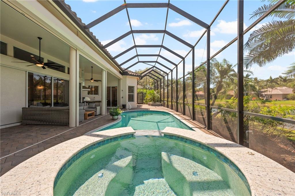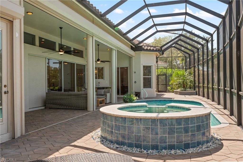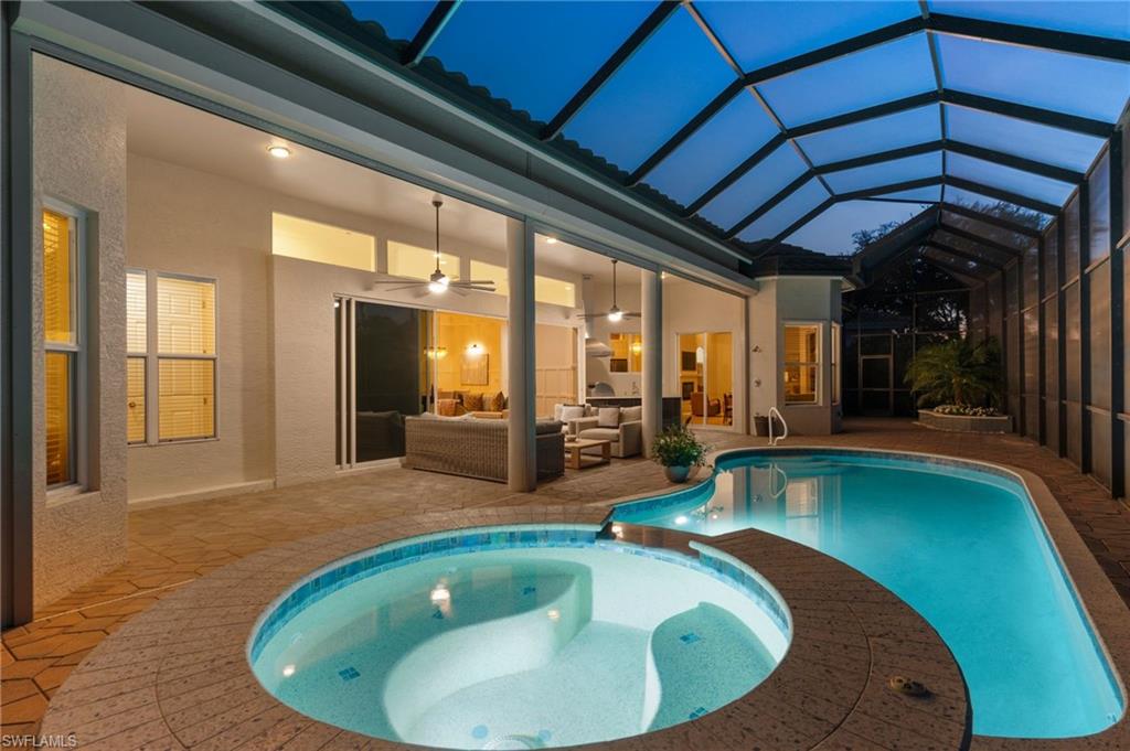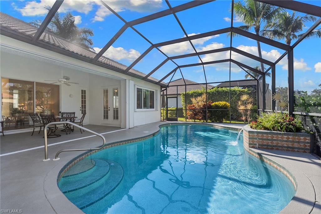 Luxurious Home in the Prestigious Wilshire Lakes Gated Community Welcome to your dream home in the highly desirable Wilshire Lakes community. This exquisite residence welcomes you with a stunning courtyard design, accessible from multiple rooms throughout the home. At its heart lies a serene, lighted, and heated pool and spa with a cascading waterfall—perfect for relaxation or entertaining. The screened courtyard offers both sun and shade, complemented by new pool heating, filtration, lighting, and ceiling fans to create the ultimate year-round oasis. Step inside to discover a beautifully maintained contemporary layout featuring 4 spacious bedrooms and 3.5 baths. The expansive open kitchen impresses with high vaulted ceilings, new cabinetry showcasing rare Brazilian granite countertops with beveled edges, striking hardware and lighting, and a wet bar ideally positioned for conversation. Appliances include a pot-filling tap over the stove, microwave, refrigerator, and new dishwasher, along with a built-in desk area and walk-in pantry for ample storage. Built in 2005, this home boasts abundant natural light through extra windows that frame peaceful views. French doors open from the lanai to a poolside lavatory with artistic tile accents and a pedestal sink. Passing through grand pillars and vaulted ceilings, the living room offers a tranquil retreat with lush privacy landscaping and a lake view backdrop. The primary suite serves as a true sanctuary, featuring an ensuite bath with a tile shower, spa tub, dual sinks, a vanity, a large walk-in closet, a linen closet, and a private water closet. Sliding doors lead directly to the courtyard and a private side porch or dog run. A spacious laundry room with granite countertops, generous cabinetry, washer/dryer, and utility sink connects to the two-car garage, which includes hurricane shutters and attic access. The courtyard also features a private guest cabana or in-law suite with a separate entrance, full kitchenette (stove, refrigerator, sink, and cabinetry), full bath, closet, and its own AC unit—perfect for guests or extended family. The exterior has been freshly painted and professionally landscaped, complete with lighting, new sod in the front and side yards, and a new roof (2019). Located on a private corner lot, this home enjoys low HOA fees, access to “A”-rated schools, and convenient proximity to North Naples shopping, dining, parks, and the beautiful Gulf beaches. Don’t miss the opportunity to experience luxury living at its finest—schedule your private tour of this exceptional Wilshire Lakes home today!