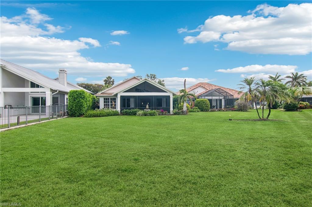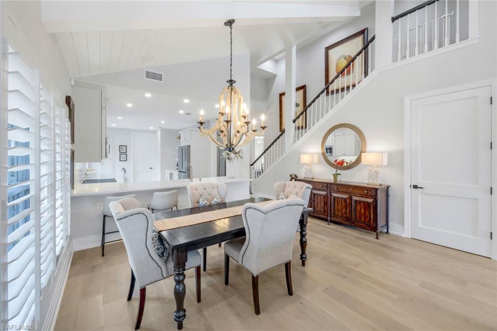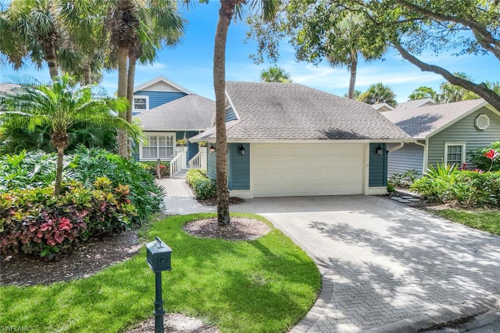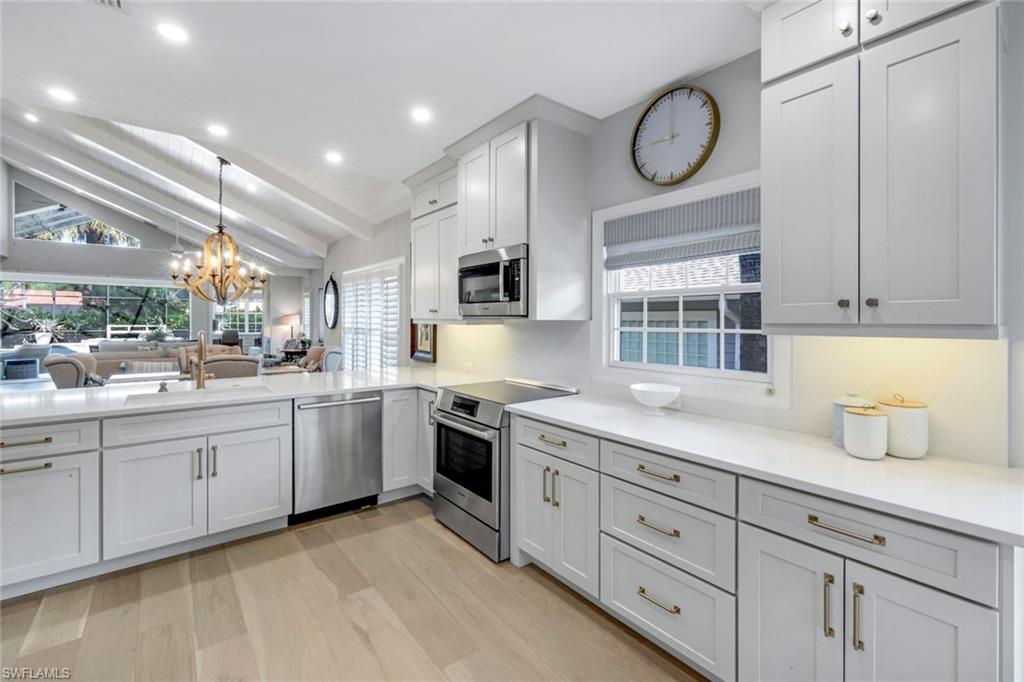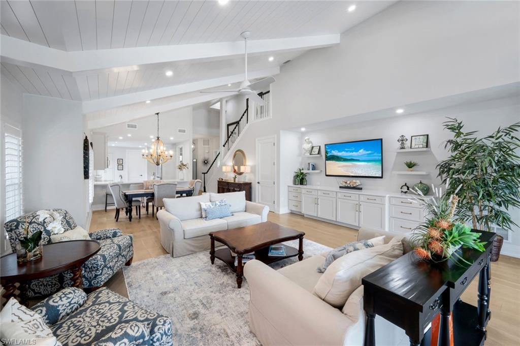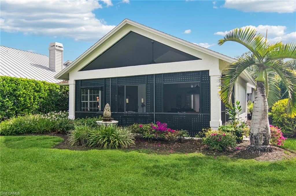 Stylishly Renovated Golf Cottage with Sunset Views. Beautifully updated 3BR+Den/3BA single-family home in highly desirable Wyndemere. Located on a quiet, tree-lined cul-de-sac, this west-facing home overlooks the fairway and offers stunning sunset views. With nearly 2,800 sq. ft. of living space, this property blends modern upgrades with timeless design in one of Naples’ most sought-after golf communities. Enjoy wide-plank oak flooring, vaulted beamed ceilings, and abundant natural light throughout. The updated kitchen is a chef’s dream, featuring quartz countertops, Bosch appliances, and a stylish coffee/bar station with undercounter fridge. The living room includes custom built-ins and a wine bar, perfect for entertaining. The spacious ground-floor primary suite features two large custom walk-in closets and a spa-like bathroom with dual vanities. A second bedroom on the main level provides flexible living options, while the upstairs suite offers a private retreat for guests. A dedicated study with custom built-ins and pool views adds even more functional space. Upgrades include new baseboards, doors, trim finishes, plantation shutters, and craftsman-quality moldings. The outdoor living is exceptional, with an expansive 33’ pool and spa with waterfall feature, large covered lanai, and two additional patios—one ideal for morning coffee just off the kitchen. Wyndemere is a private, gated country club offering 27 holes of Arthur Hills-designed championship golf, a newly renovated clubhouse, resort-style infinity pool, state-of-the-art fitness and spa center, 10 Har-Tru tennis courts, pickleball, bocce, croquet, and a full social calendar. Grounds maintenance and irrigation are included in HOA fees for worry-free living. Minutes to downtown Naples, Gulf beaches, and the airport, this home is the perfect blend of luxury, lifestyle, and location. Move in and enjoy the best of country club living!