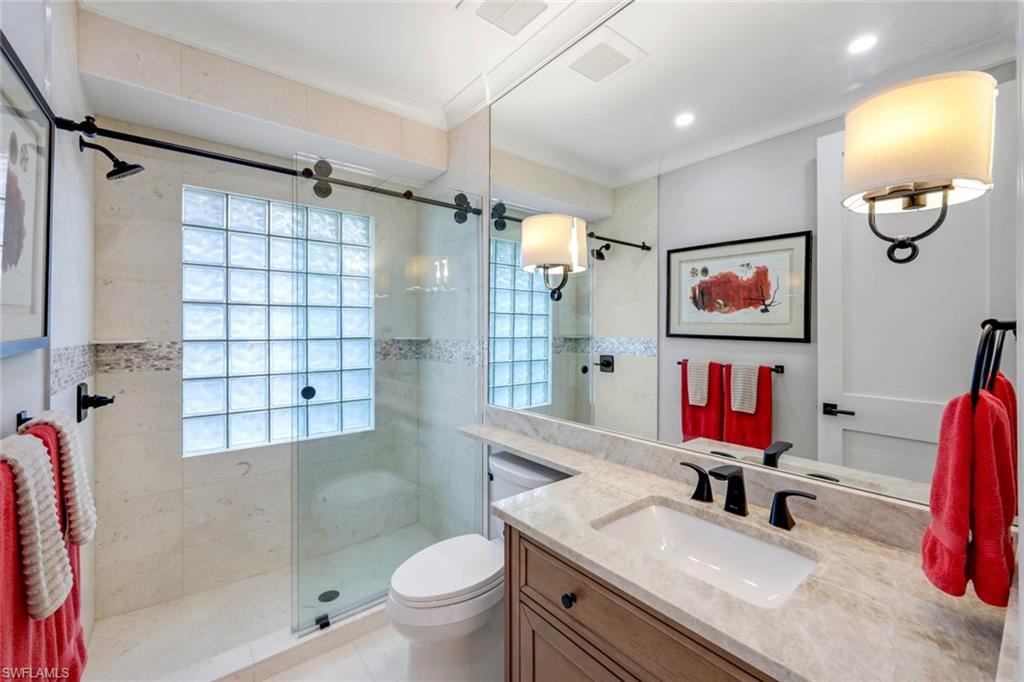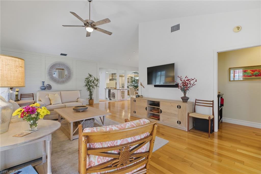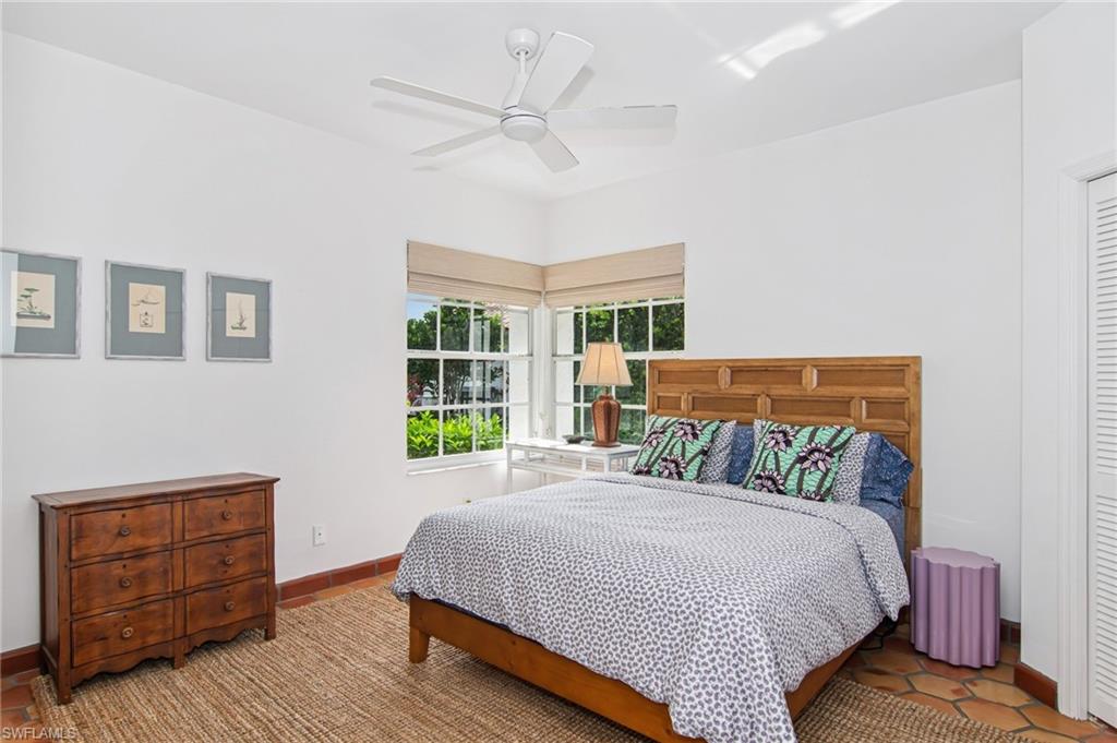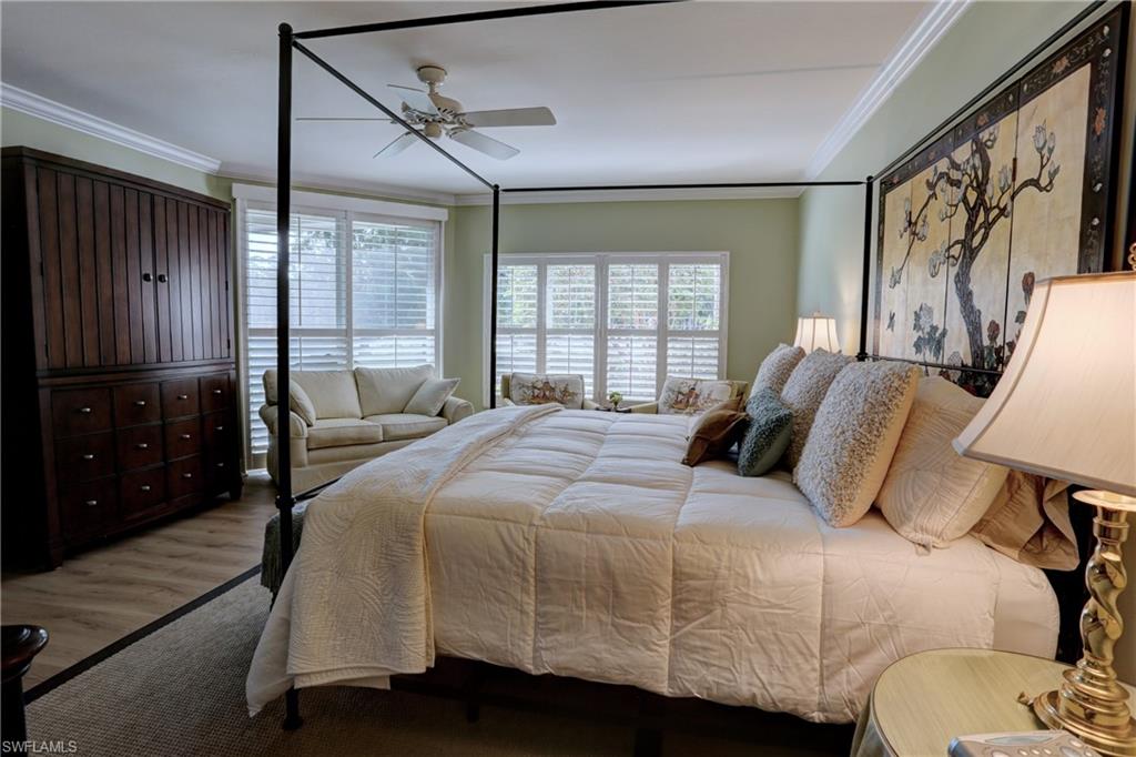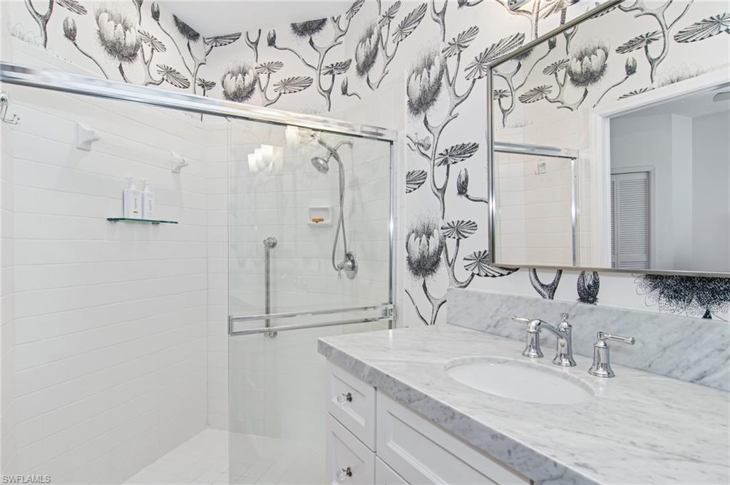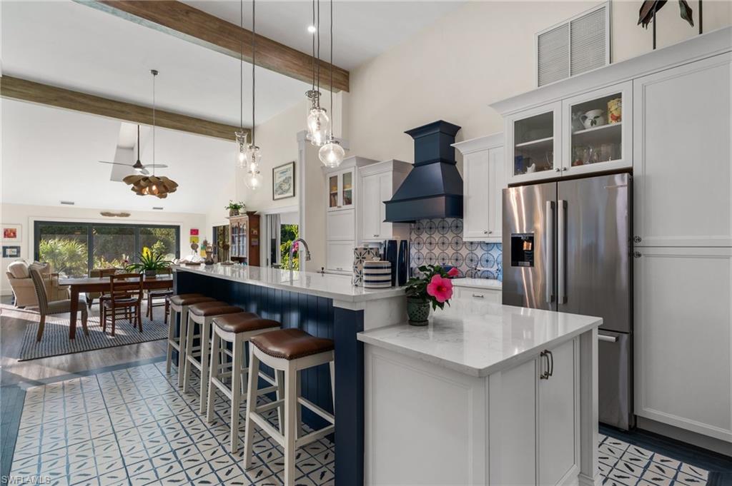 Stylishly Renovated Golf Cottage with Sunset Views. Beautifully updated 3BR+Den/3BA single-family home in highly desirable Wyndemere. Located on a quiet, tree-lined cul-de-sac, this west-facing home overlooks the fairway and offers stunning sunset views. With nearly 2,800 sq. ft. of living space, this property blends modern upgrades with timeless design in one of Naples’ most sought-after golf communities. Enjoy wide-plank oak flooring, vaulted beamed ceilings, and abundant natural light throughout. The updated kitchen is a chef’s dream, featuring quartz countertops, Bosch appliances, and a stylish coffee/bar station with undercounter fridge. The living room includes custom built-ins and a wine bar, perfect for entertaining. The spacious ground-floor primary suite features two large custom walk-in closets and a spa-like bathroom with dual vanities. A second bedroom on the main level provides flexible living options, while the upstairs suite offers a private retreat for guests. A dedicated study with custom built-ins and pool views adds even more functional space. Upgrades include new baseboards, doors, trim finishes, plantation shutters, and craftsman-quality moldings. The outdoor living is exceptional, with an expansive 33’ pool and spa with waterfall feature, large covered lanai, and two additional patios—one ideal for morning coffee just off the kitchen. Wyndemere is a private, gated country club offering 27 holes of Arthur Hills-designed championship golf, a newly renovated clubhouse, resort-style infinity pool, state-of-the-art fitness and spa center, 10 Har-Tru tennis courts, pickleball, bocce, croquet, and a full social calendar. Grounds maintenance and irrigation are included in HOA fees for worry-free living. Minutes to downtown Naples, Gulf beaches, and the airport, this home is the perfect blend of luxury, lifestyle, and location. Move in and enjoy the best of country club living!