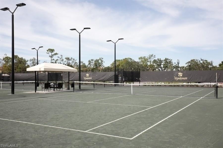 Elegant 1st floor corner condo with large lanai overlooking lake and golf, just steps to the club! This home has been totally and tastefully renovated with attention to every detail and meticulously cared for. New floors throughout, new paint, beautiful crown moldings, remodeled baths. Kitchen remodel is a chef’s dream and open to great room with quartzite counters, all new appliances, induction cooktop, even craft ice in freezer! Great room with built in bar and beverage fridge, glass door cabinets with lighting, electric fireplace and mantel. The lanai is a retreat with panoramic screens, impact sliders, porcelain tile, surrounded by custom rock garden, and the view is exceptional! Enjoy 27 holes of Arthur Hills immediate golf, active tennis/pickleball with10 Har Tru tennis courts, 7 pickleball courts, popular bocce teams, full croquet, resort-style zero entry pool, state of the art fitness center, w/full spa services & group exercise classes. New activity center with circular outdoor bar and pickle ball stadium for exhibition matches with seating for 165! Enjoy indoor/outdoor casual dining at the Tiebreaker and a lively social schedule of events/parties at the club. Wyndemere, a gated premiere 2025-2026 Platinum Club of America, known for its friendly and welcoming membership, is ideally located within minutes to world class dining, shopping and the spectacular sugar sand Gulf beaches. Come join the fun of this spectacular Southwest Florida lifestyle!