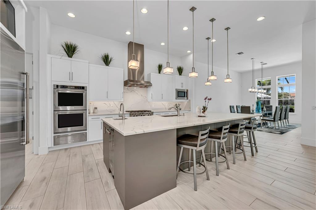 Welcome to the resort lifestyle of Marsh Cove in the upscale and award-winning community of Fiddler's Creek in Naples, Florida. Marsh Cove is one of the newer gated communities offering luxury Ashton Woods homes. This 3,000+ sq. ft. customized home, featuring an open-floor plan with soaring ceilings, is situated on a premier oversized cul-de-sac lot with southern exposure and lake views. The quartz gourmet kitchen, large pantry/bonus room, five hundred bottle wine room and oversized screened travertine lanai with pool, spa and outdoor kitchen offer the perfect mix of luxury indoor & outdoor lifestyle. The exterior includes a tile roof, impact resistant doors and windows and a long stone paver driveway. The welcoming French door entry leads to the main living area beyond which are double slider doors opening onto the lanai. The sophisticated interior living space is complete with high end finishes throughout and is offered fully furnished. The oversized owner's suite is complete with a large walk-in closet and an ensuite bath with dual sinks, free standing tub, and a frameless glass shower. Each guest room has an ensuite bathroom and walk-in closet. Fiddler's Creek is committed to preserving the environment. The 4,000-acre community enhances the natural beauty of Southwest Florida. The area surrounding the community is dedicated to nature reserves, lakes and recreational areas. Fiddler's Creek is known for its amenities including a full fitness center, full-service spa, casual/fine dining, resort-style pools, tennis, bocce and pickleball. Golf, beach and marina memberships are optional.