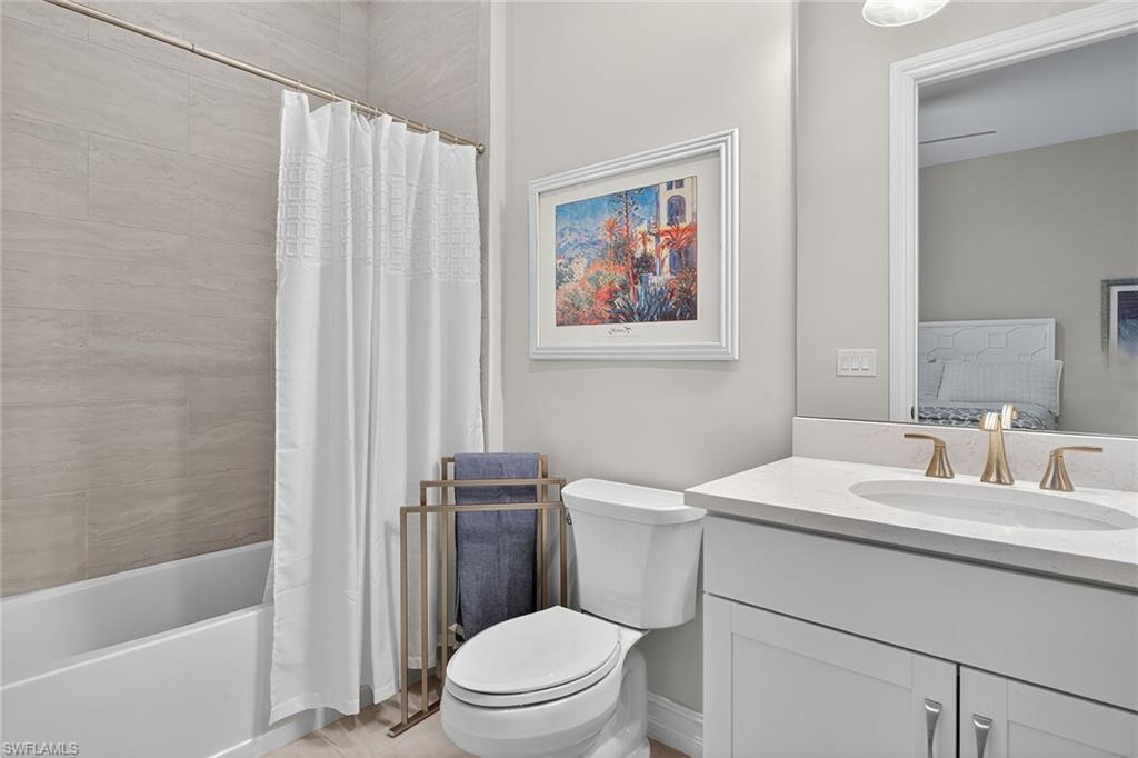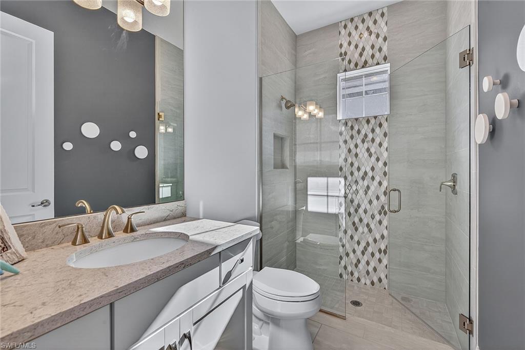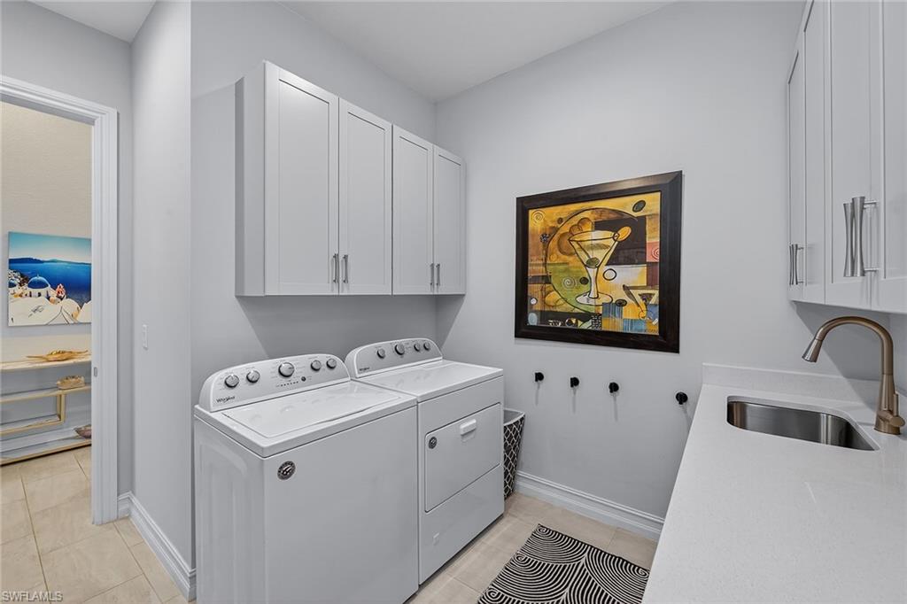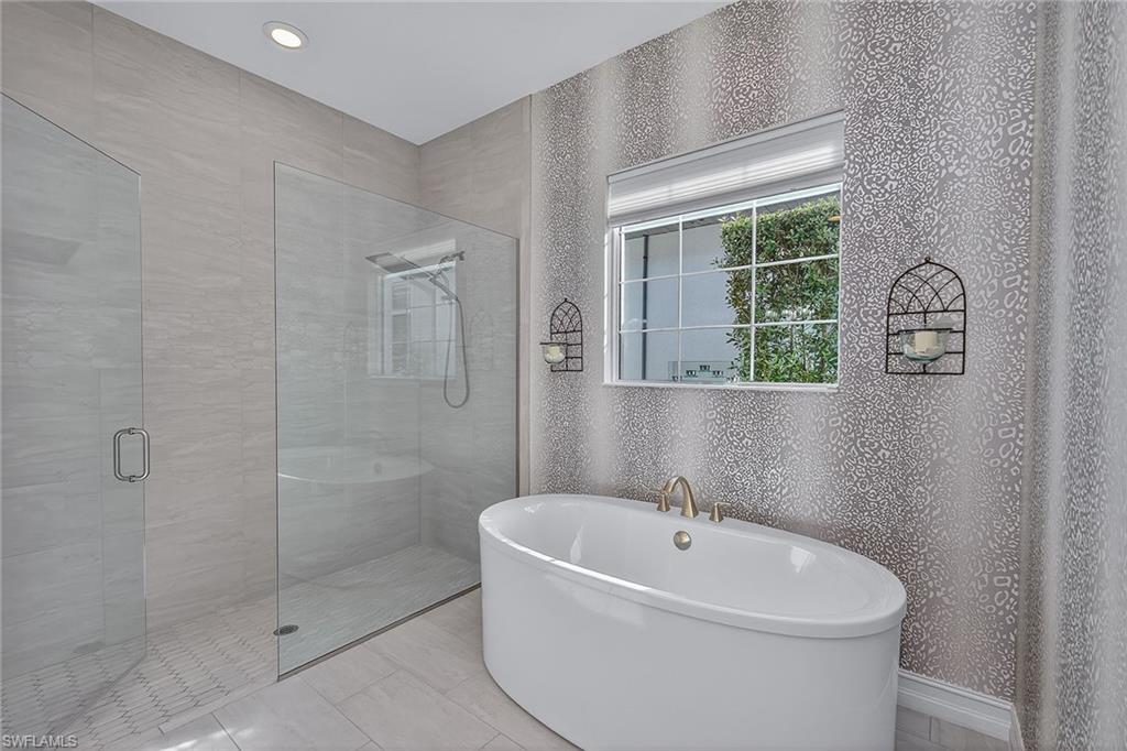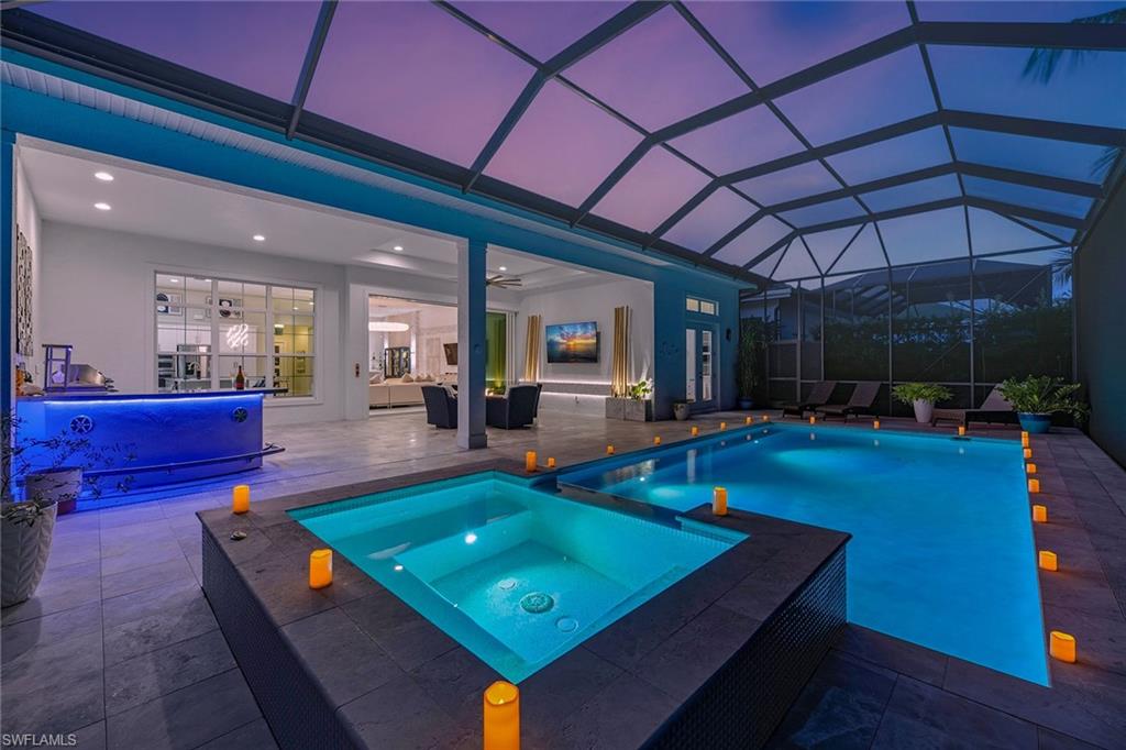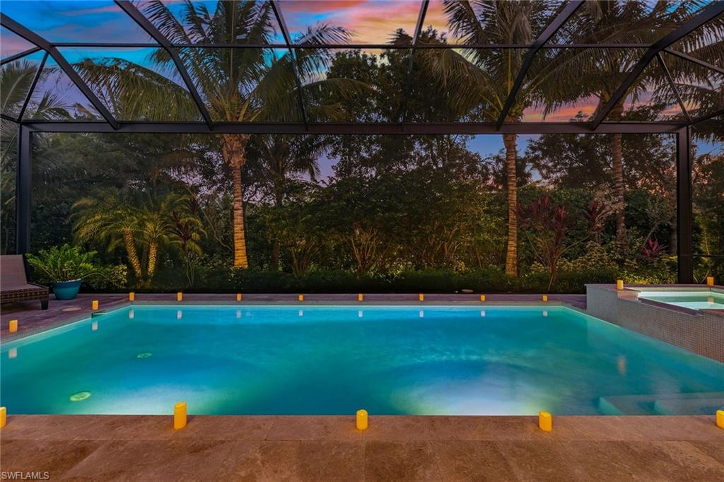 2023 Mercedes included in the sale with a successful closing before the end of December! Exquisite modern design, desirable SW exposure, and lush tropical garden surroundings define this pristine home by Stock Development, set in the prestigious Marsh Cove enclave of the acclaimed Fiddler’s Creek community. This custom-designed 5-bedroom, 3.5-bath residence with 3-car garage offers refined indoor-outdoor living with serene privacy and exceptional upgrades throughout. The huge picture-screened lanai enjoys full sun on the pool year-round and features a gas-heated saltwater pool and spa with waterfall features and a full-length in-pool bench, all surrounded by natural stone pavers. A spacious covered outdoor living area is ideal for entertaining, complete with a fully equipped summer kitchen with a stainless grill and rotisserie, two-burner cooktop, beverage and wine refrigerators, quartz countertops, and bar seating. Additional exterior upgrades include privacy screens on the lanai, new landscape lighting, and a sidestep path for added convenience. Peace of mind is ensured with impact-resistant doors and windows, a 24-KW Generac whole-house natural gas generator, and a CDD bond that is paid in full. Low-cost flood insurance is also transferable. Inside, porcelain tile floors, custom ceilings and recessed LED lighting complement the open layout. The kitchen boasts white shaker cabinetry, quartz countertops, tile backsplash, and a center island with pendant lighting. Premium KitchenAid appliances include a gas cooktop, French door refrigerator, wall oven, microwave, dishwasher, and reverse osmosis water. The adjacent dining area showcases a tile accent wall with decorative pillars, glass wall sconces and a striking chandelier, while the great room features coffered ceilings, a shiplap and tile accent wall, a large cut-glass chandelier, and pocketing glass sliders to enhance the indoor-outdoor lifestyle. The primary suite offers a peaceful retreat with a recessed ceiling, chandelier, remote-controlled electric shades, and French doors with a transom window leading to the lanai. The en-suite bath includes dual quartz vanities, a full-width mirror, a walk-in shower with frameless glass enclosure and water filter, a separate soaking tub and dual walk-in closets with custom shelving. One guest suite offers a private bath with quartz vanity and a shower/tub combo, while two additional bedrooms share a bath with a quartz vanity and walk-in shower featuring tiled niche and floor-to-ceiling finishes. The 5th bedroom, framed by French doors, provides flexibility as a study or an additional guest room and is finished with a full closet. A stylish powder bath with custom wallpaper is off the hallway. The laundry room is well-appointed with a sink, quartz counters, overhead cabinetry, and Whirlpool washer and dryer. The oversized garage includes epoxy floor, shelves, ceiling-mounted storage, and a mini split AC system (2023). TV mounts are installed throughout.