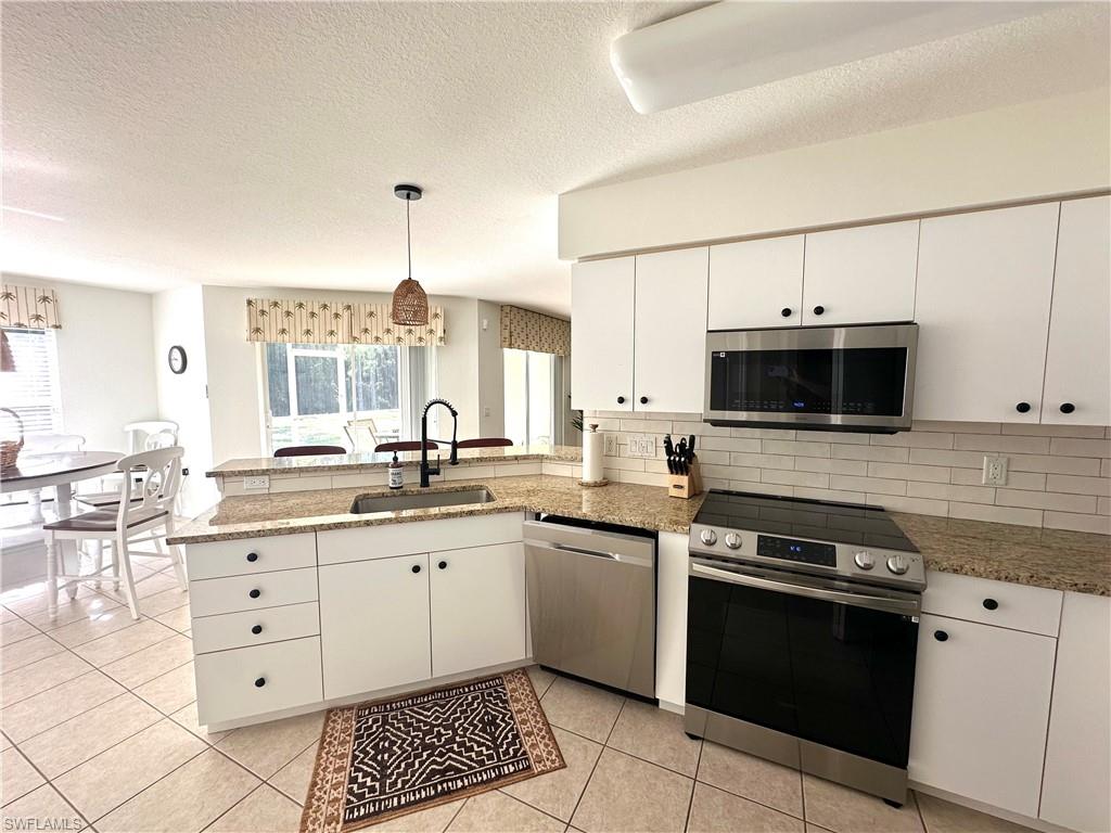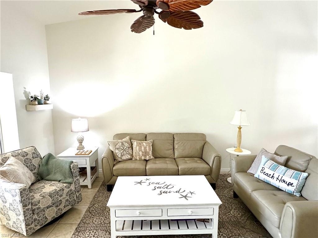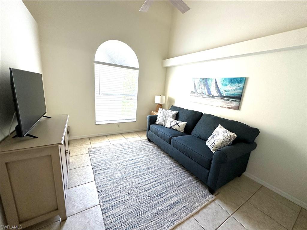 Welcome to this beautifully maintained 2 bedroom, 2 bathroom condo with den in the desirable Villages of Bonita community. This turnkey residence comes furnished with newer pieces from City Furniture and includes a detached garage for added convenience. From the foyer, the hallway features two decorative wall niches before leading you toward the dining room and kitchen, creating a warm and inviting entrance. The home boasts vaulted ceilings, tile flooring throughout, plant shelves in every room, and abundant natural light. The kitchen is designed with quartz countertops, white appliances including a glass-top stove, a breakfast bar, a two-door pantry, and an arch window that adds charm and brightness. The master bedroom includes a walk-in closet and a two-door slider opening to the screened lanai. The en suite bathroom features dual sinks, a quartz countertop, a walk-in shower, and a built-in medicine cabinet. The guest area offers a comfortable guest bedroom, a hall linen closet, and a guest bathroom with tub, quartz countertop, built-in medicine cabinet, and its own linen closet. The den is a versatile space with French doors, an arch window, and a closet, making it perfect as an office or potential third bedroom. The living room provides a generous layout with a three-panel pocket slider that opens onto the screened lanai. The lanai overlooks a peaceful preserve, offering a serene setting to relax and enjoy the natural surroundings. Residents of the Villages of Bonita enjoy access to the clubhouse that includes a resort-style pool and spa, fitness center, kitchen, library, billiards table, tennis/pickleball courts, and shuffleboard. This property combines comfort, style, and convenience in one of Bonita Springs’ most sought-after communities and is move-in ready - just bring your suitcase!