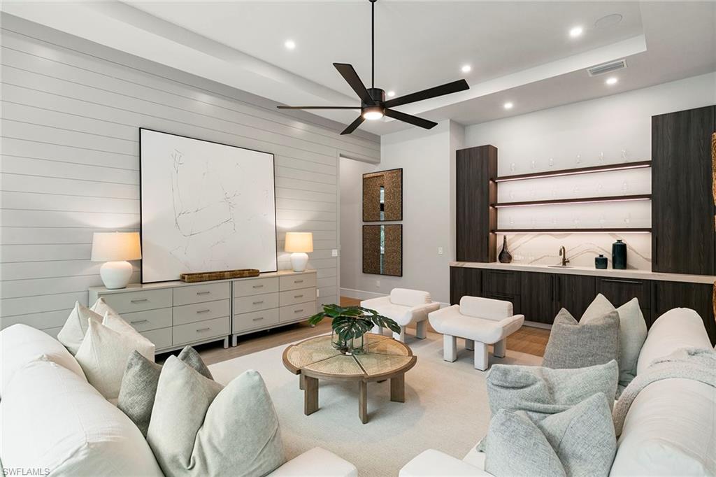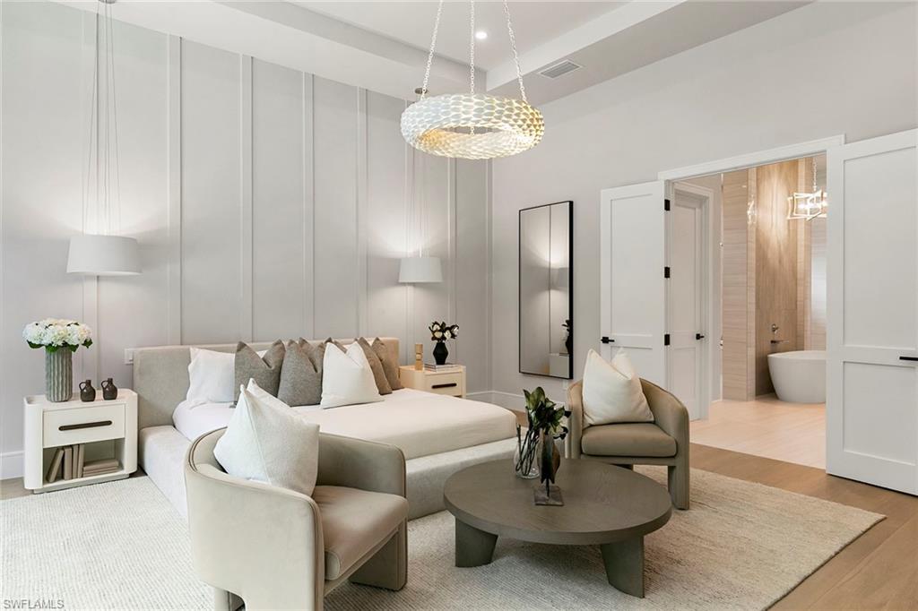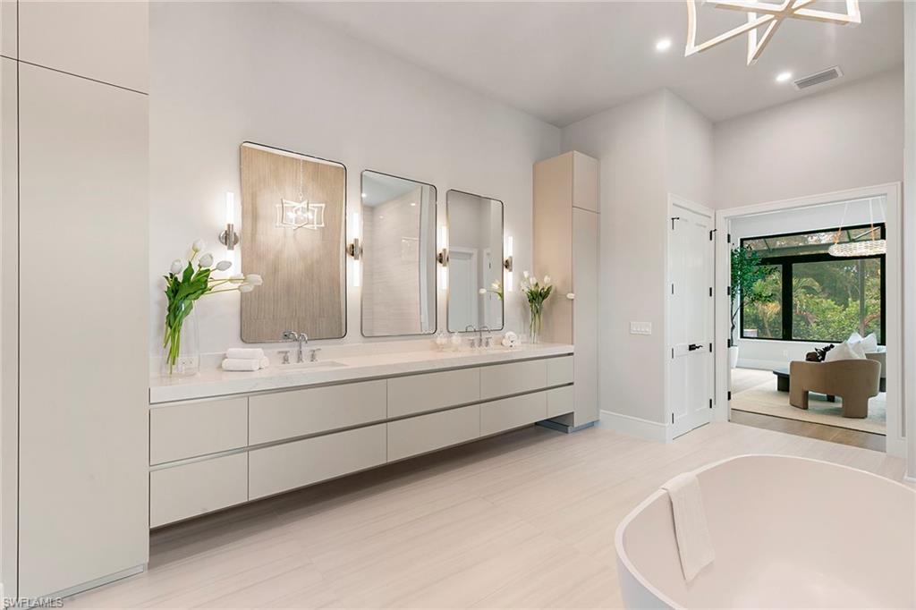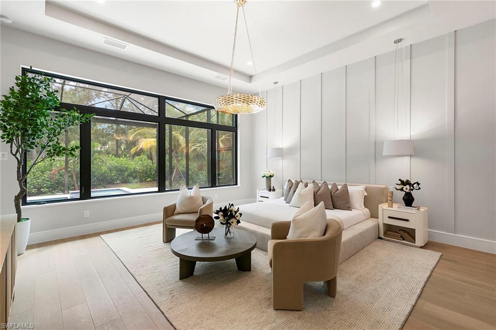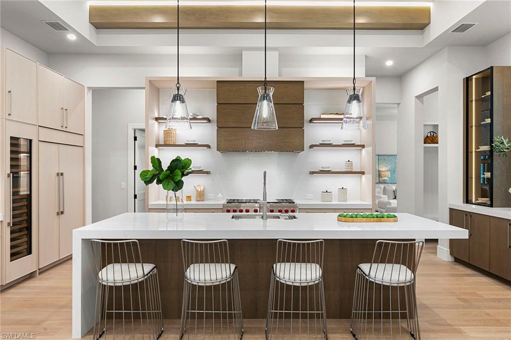 Luxury and sophistication are combined with world-class craftsmanship to deliver this award-winning STOCK custom home in the exclusive Bay Woods at Bonita Bay. Thoughtfully designed by New Architectura in collaboration with Wilfredo Emanuel Designs and Clive Daniel, this Cosmopolitan Chic home was the winner of the prestigious Sand Dollar Award and boasts a nearly $1,000,000 interior design package. Situated on a premium lot with unobstructed lake and golf course views, this home boasts 4 bedrooms, 6 bathrooms, bonus room, and an oversized 4-car garage with room for 5 plus cars. As you enter through the grand contemporary steel doors, you are immediately struck by the dramatic geometric ceiling details, white glass tile flooring, suspended lighting, illuminated quartz wine bar and glass-enclosed wine room. The Cosmopolitan theme is carried into the kitchen, featuring glass-faced cabinetry, quartz and semi-precious stone islands with waterfall, Wolf and SubZero built-in paneled appliances, Miele coffee machine, a walk-in pantry and more. The massive primary suite is nothing short of breathtaking. From its white oak flooring to the oversized seating area, dual walk-in closets, mirrored wall panels, textured wallpaper and built-in headboard with custom lighting. As you enter the primary bathroom, you will find two separate water closets, a free-standing tub, oversized shower with multiple heads, gorgeous tile and textured accent walls. Boasting more than 3,000SF of space, the outdoor area is a true focal point of the home and features countless upgrades such as electric shutters and screens, bug mist system, gas fireplace and separate fire pit area, massive outdoor kitchen with waterfall quartz counters, geometric ceiling details, white marble pavers, and pool bathroom. Enjoy the sunset views over the infinity edge gas-heated pool and spa. Continuing throughout the home, you will find that every guest bedroom is ensuite and features white oak flooring, walk-in custom closets and each has its own unique design cues such as custom draperies, wallpapers, ceiling and wall details. Showcased by a floor-to-ceiling glass entry, the opulent billiards/bonus room is sure to impress with its custom leather-padded wall and illuminated stone accents. The full-home Control4 smart system provides automated electric blinds throughout, smart lighting switches, indoor and outdoor built-in speakers, security system and more. Bonita Bay offers an array of outstanding amenities and optional memberships, from a private beach club to a full-service marina and multiple dining options. Experience premier golfing with five recently renovated Arthur Hills and Tom Fazio championship courses and three expansive practice facilities. Enjoy miles of scenic walking and biking trails, kayaking, canoeing, boat launch, state-of-the-art fitness center, an 18-court tennis and pickleball complex, numerous community parks and more.